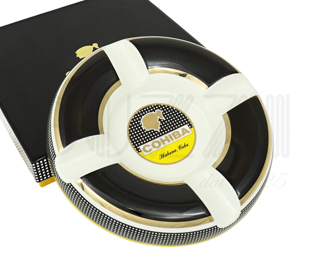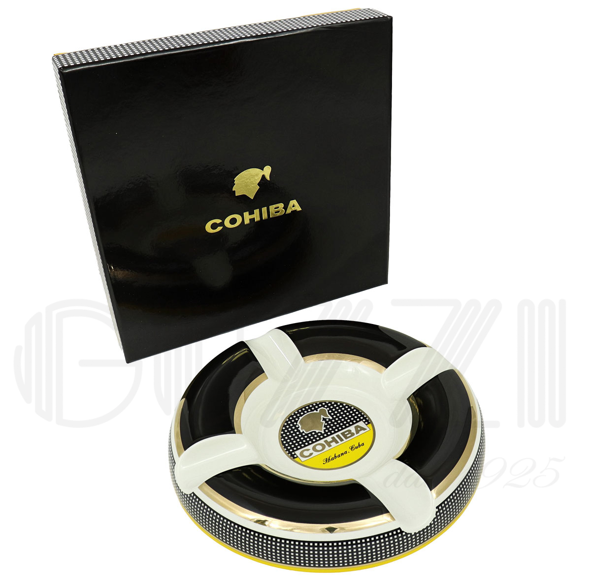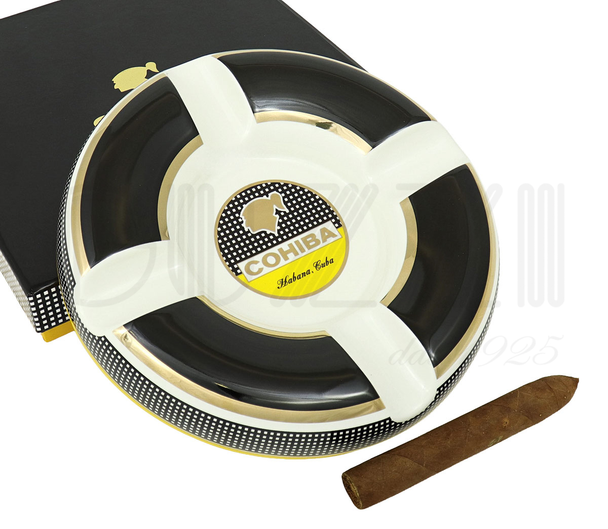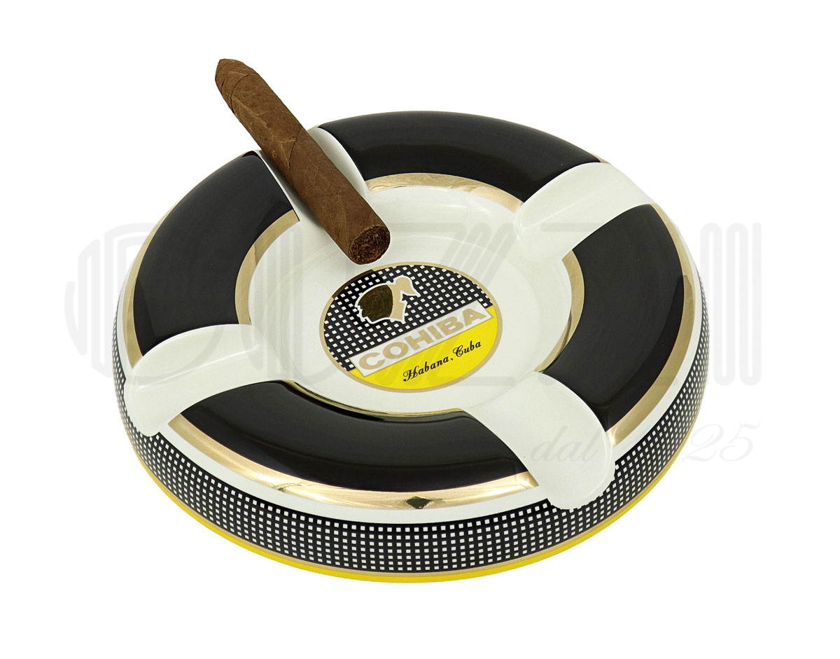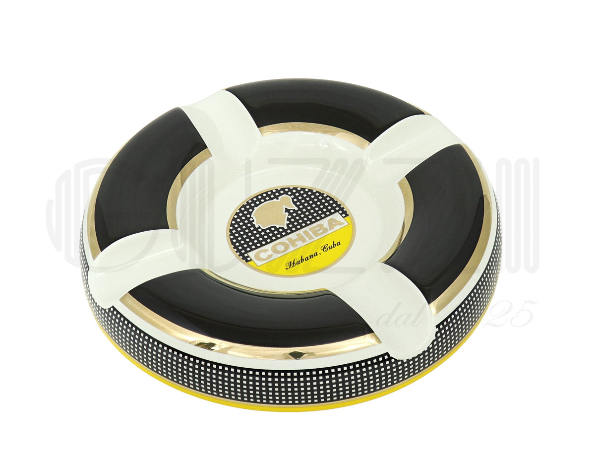Elegant and luxurious official Cohiba ashtray, perfect for Cuban cigar enthusiasts. Crafted from high-quality fine ceramic (manufactured in Spain under Habanos license). It features 4 wide cigar rests, shaped to comfortably support vitolas of various sizes. Round shape, robust and stable.