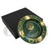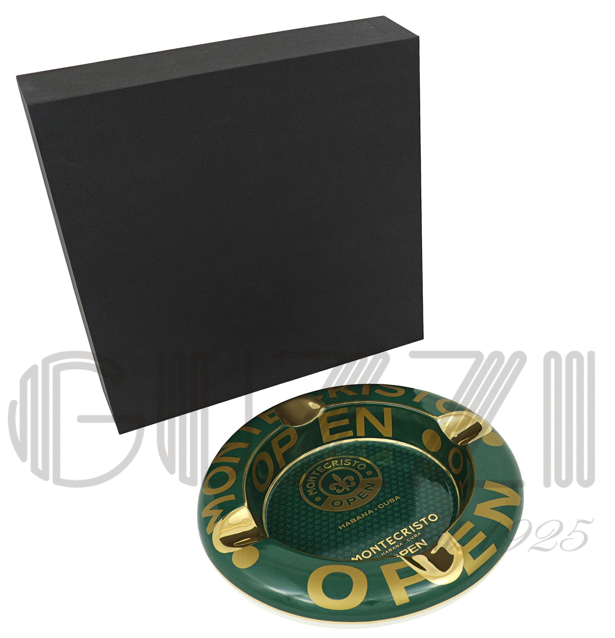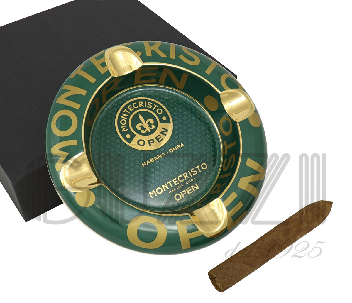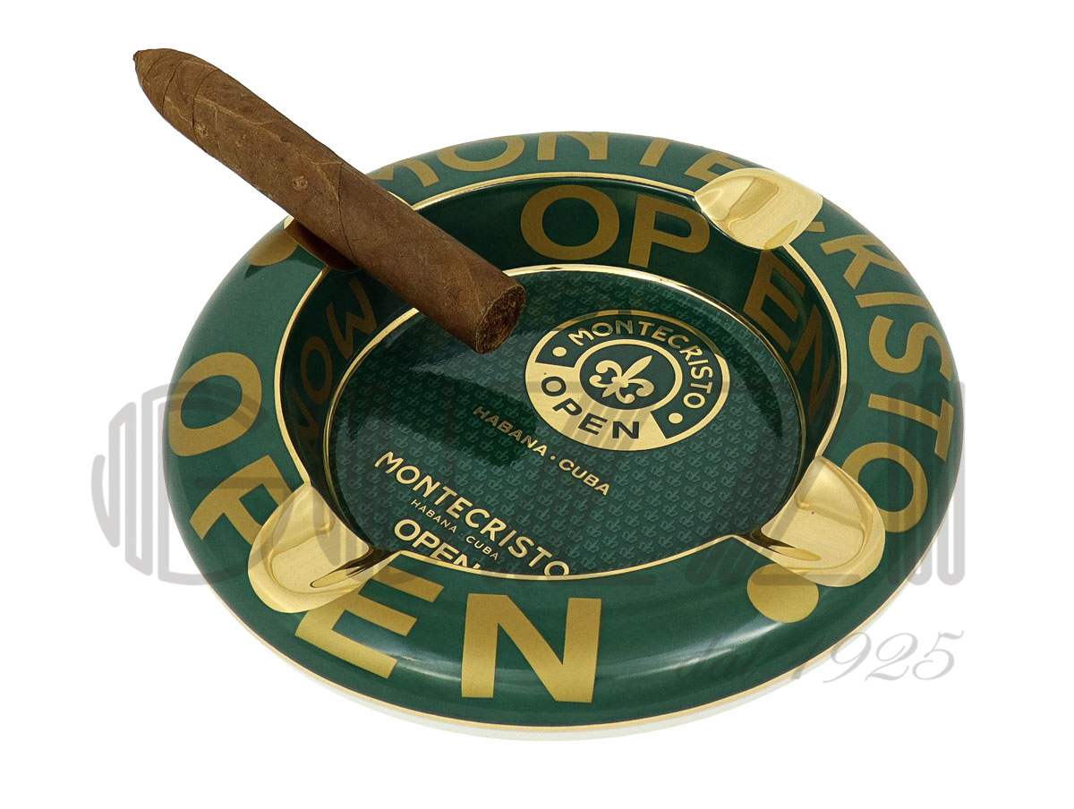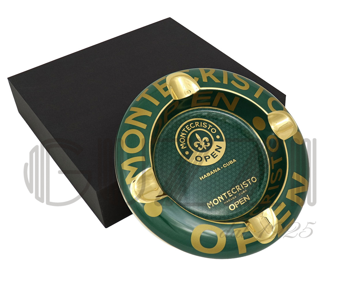 Intense green color with glossy gold decorations and lettering for a refined, premium contrast. Iconic Montecristo fleur-de-lis logo with the inscriptions "MONTECRISTO OPEN" and "HABANA · CUBA". Outer rim: The word "OPEN" repeated in large gold uppercase letters, arranged circularly. Inner base: Textured pattern with repeated small Montecristo logos for an exclusive touch.