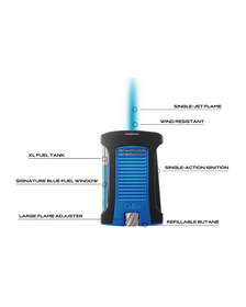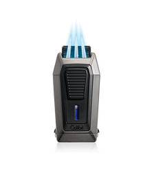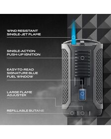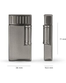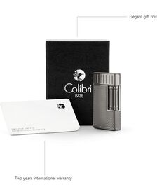 Latest model of Colibri lighters. Excellent for cigar lighting thanks to the rigid flame which protects from the wind. Modern and solid with metallic finishings. Automatic button for opening. Gas level indicator. Lighting: Piezoelectric. Refill: Butane GAS. Customized Colibri Gift box. Measures: Lenght: 65mm - Width40mm - Thickness 10mm. Weight: 70g. Colibri Warranty: 24 months. Instructions incluided in the box.