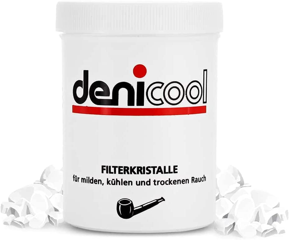 Denicool. Put some crystals into the bottom of the pipe bowl, then fill the bowl with tobacco as usual. After enjoying the smoke empty the pipe together with the crystals. Denicool will have changed its color to dark brown because it is saturated with condensate. This proves its high efficiency as an absorbant. Denicool filter crystals ensure a cool, mild and dry smoke. They reduce tar and nicotine and absorb additional humidity while keeping the flavor of the tobacco.
