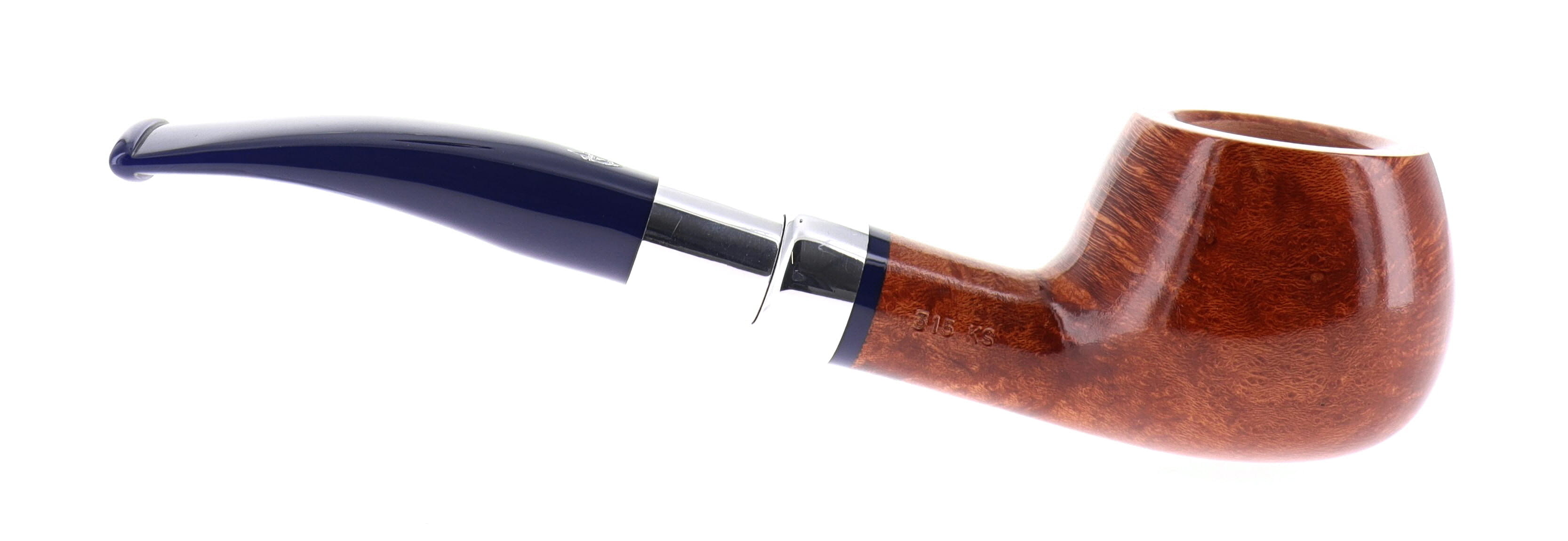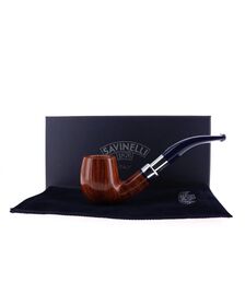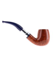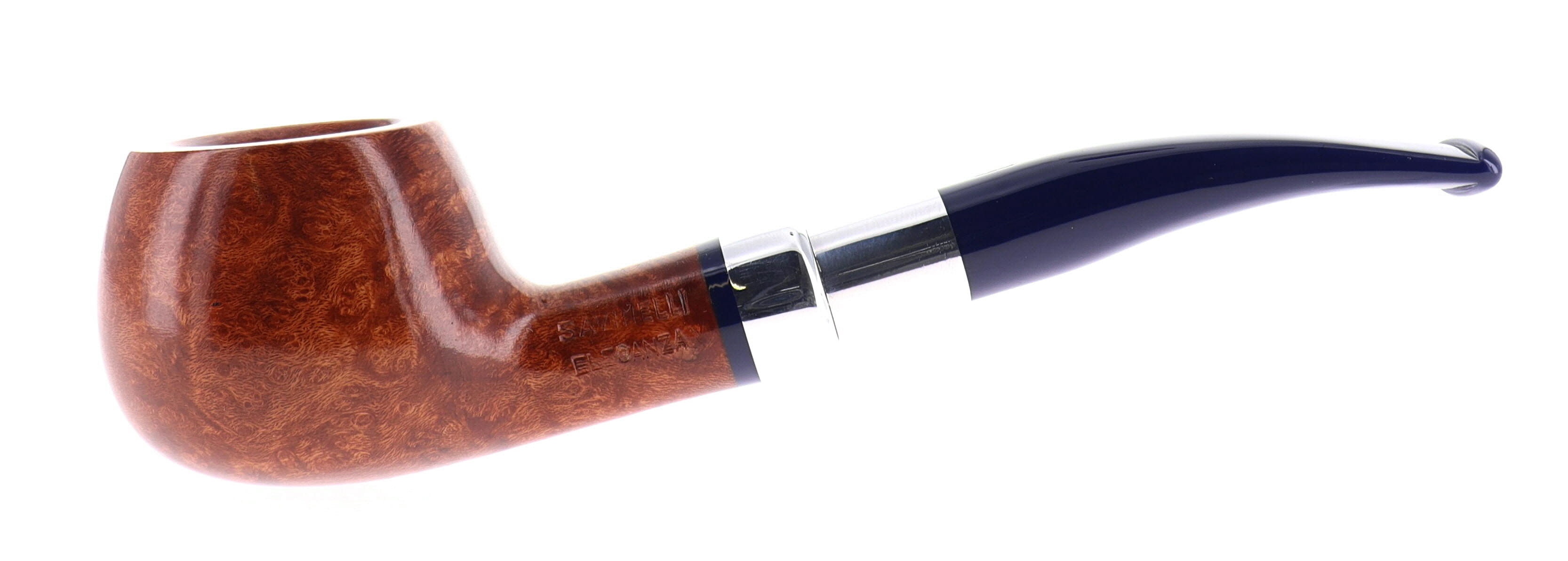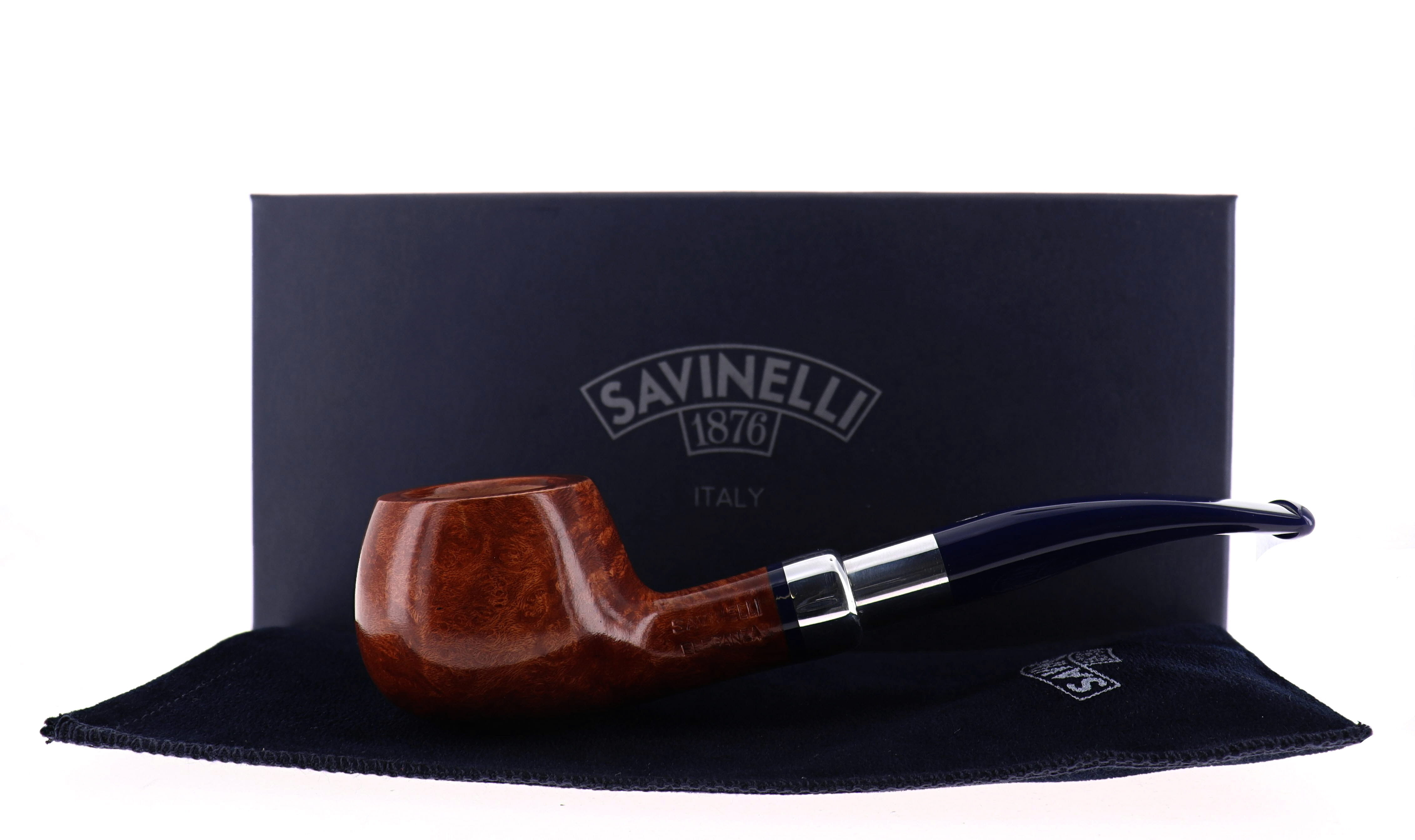 Savinelli Eleganza Collection 315 pipe, smooth natural finish, semi-bent Prince shape, elegant nickel spigot, blue acrylic mouthpiece, 9mm bore. New, never smoked. In elegant original packaging with blue cloth pouch.