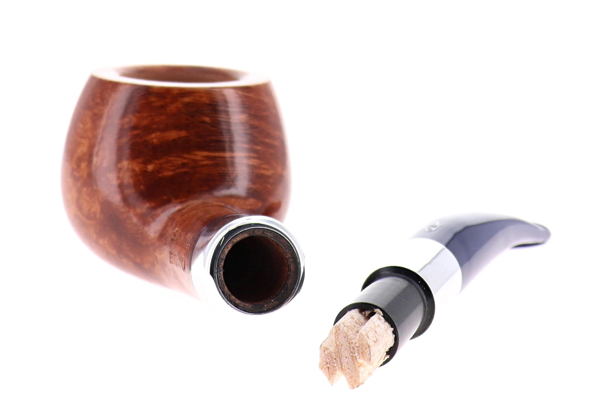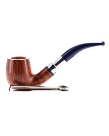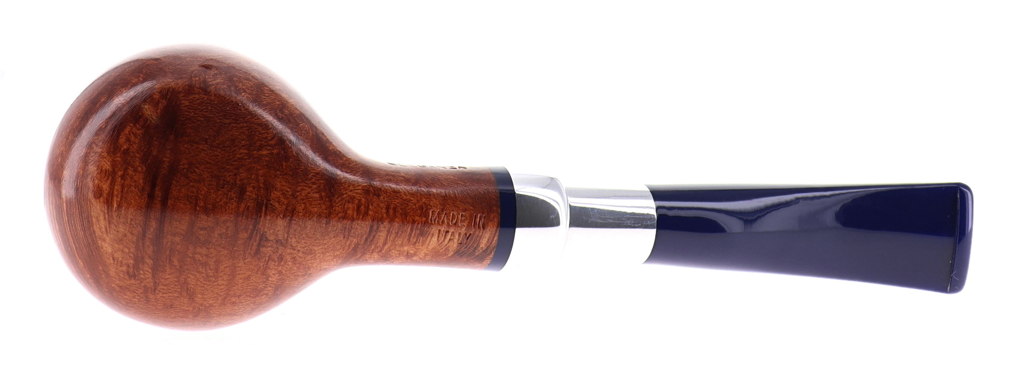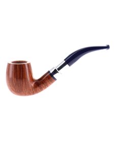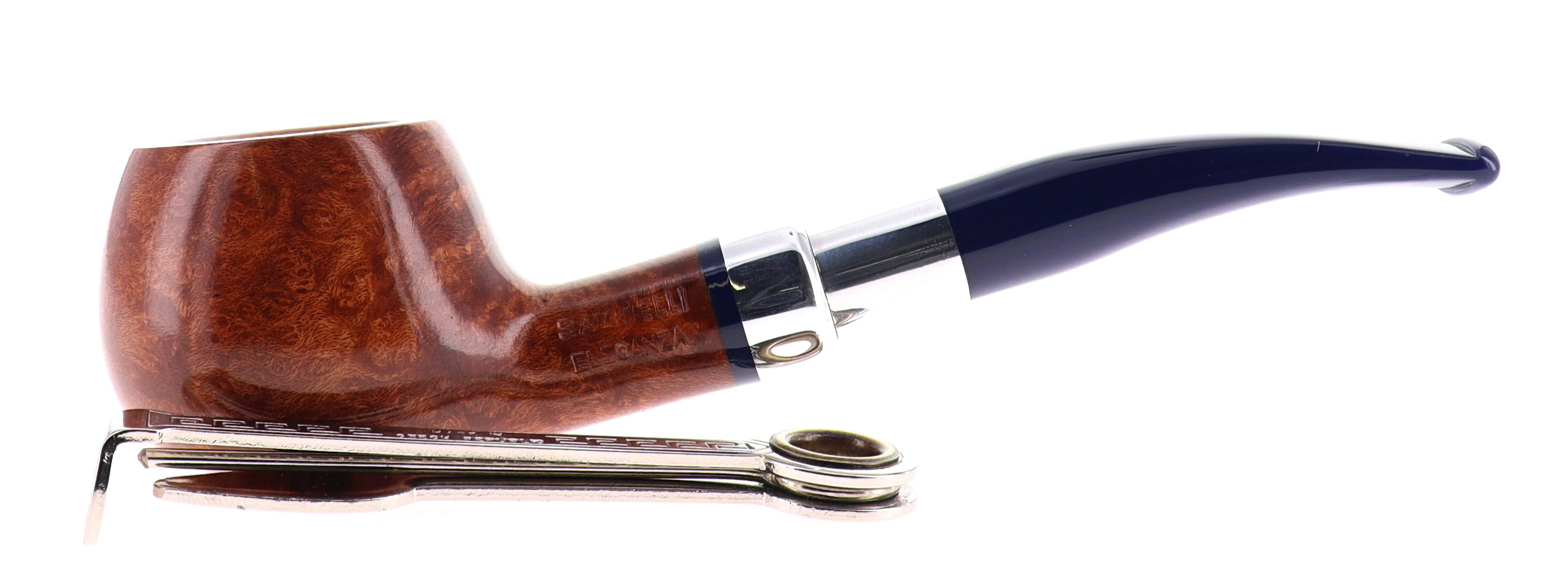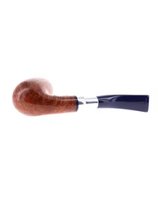 Savinelli Eleganza Collection 315 pipe, smooth natural finish, semi-bent Prince shape, elegant nickel spigot, blue acrylic mouthpiece, 9mm bore. New, never smoked. In elegant original packaging with blue cloth pouch.