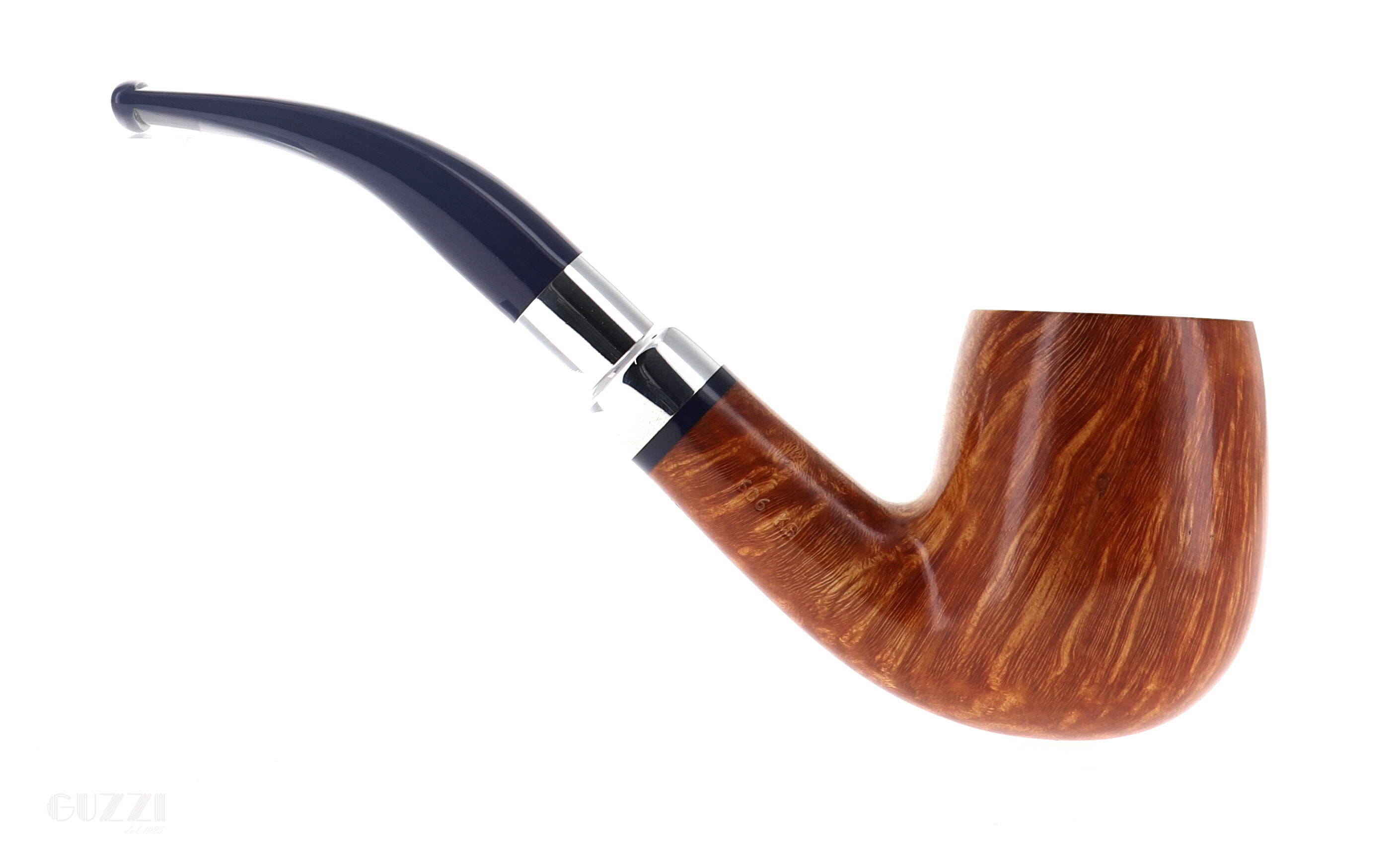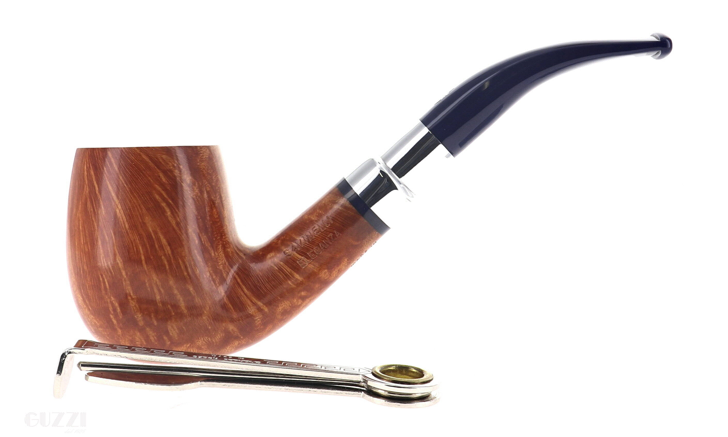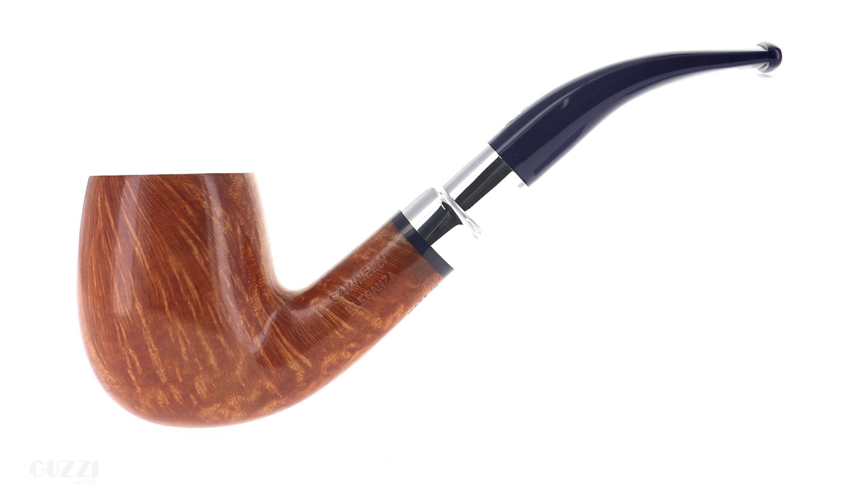 Pipe Savinelli Collection Eleganza 606 KS, natural smoothfinishing, shape bent billiard, elegant nickel spigot, blue methacrylate mouthpiece hole 6mm. New, never smoked. Elegant Savinelli box with cloth bag.