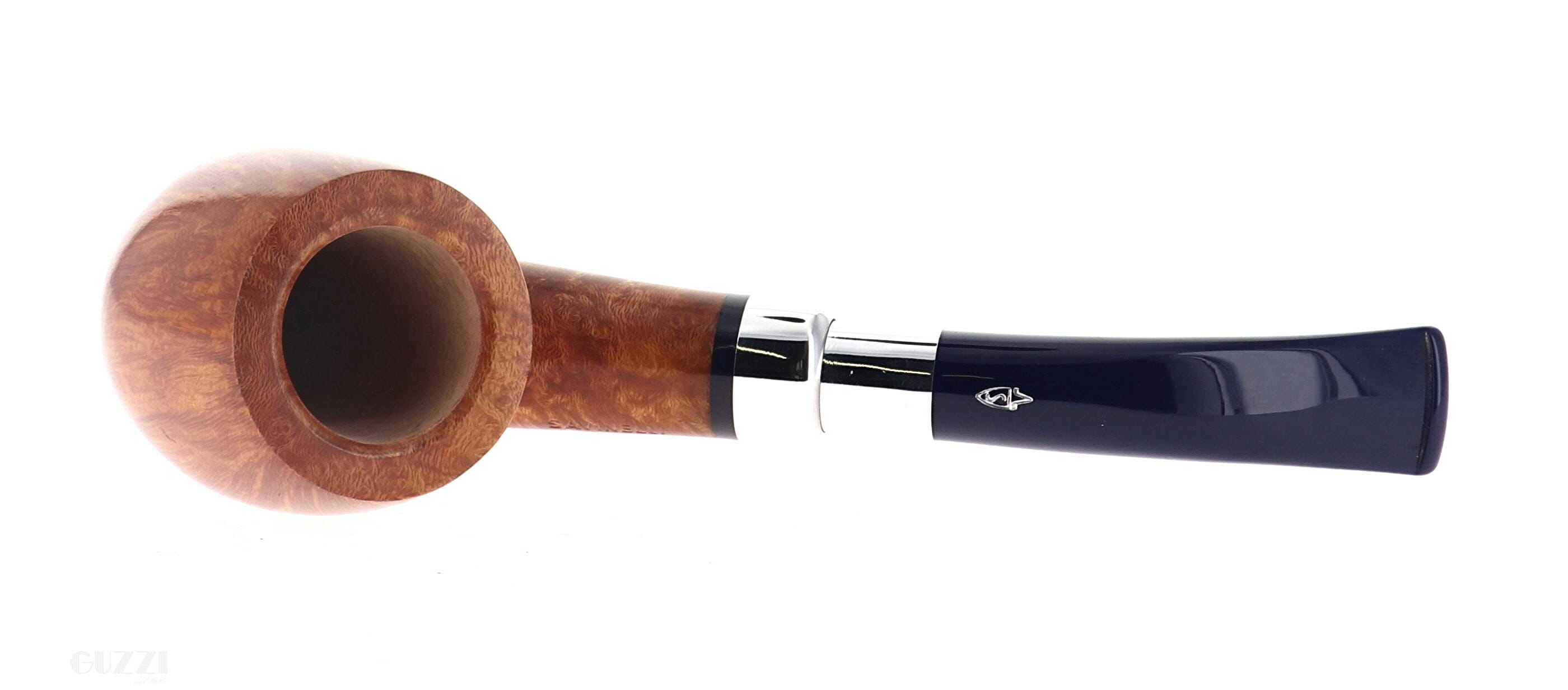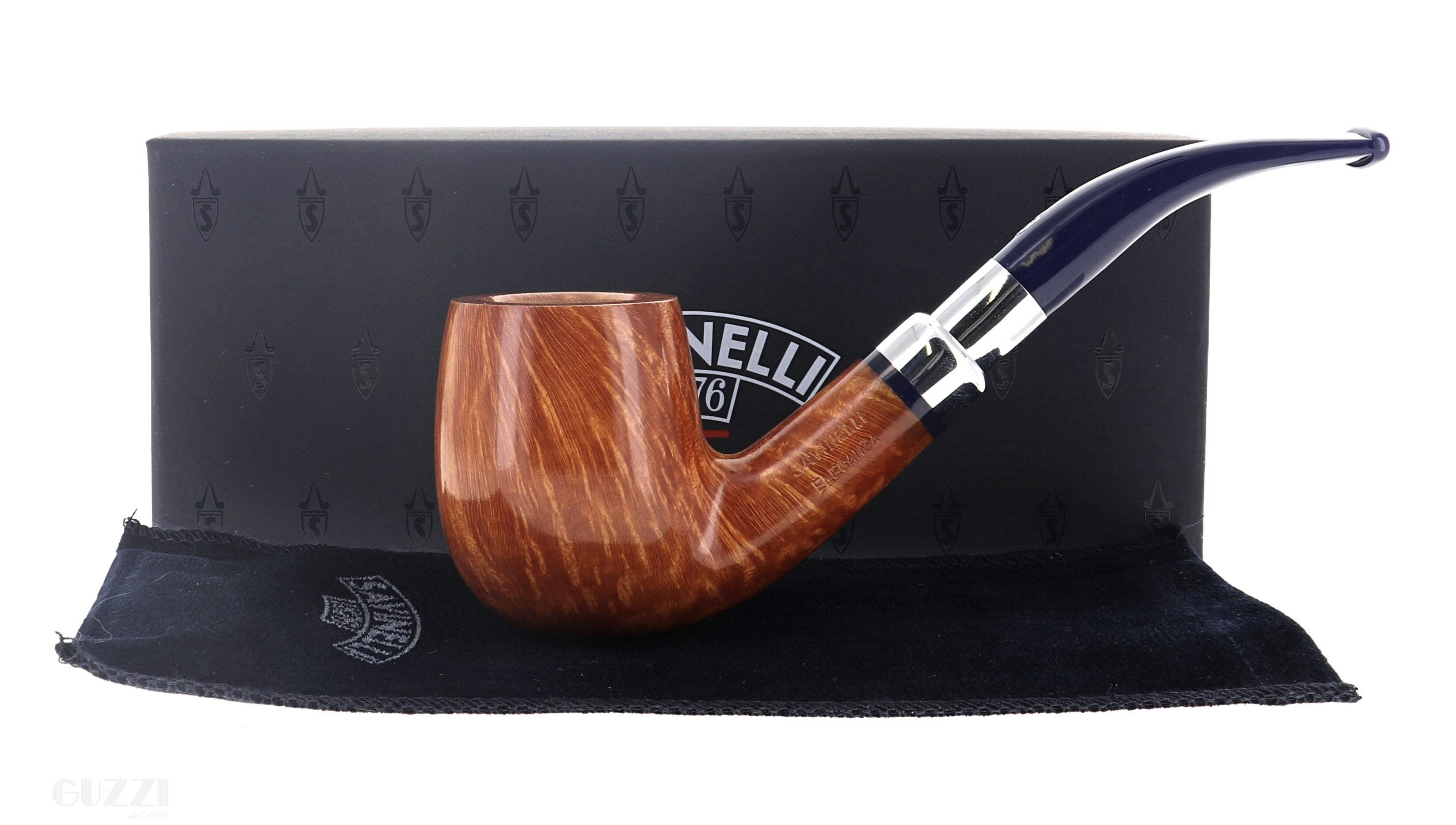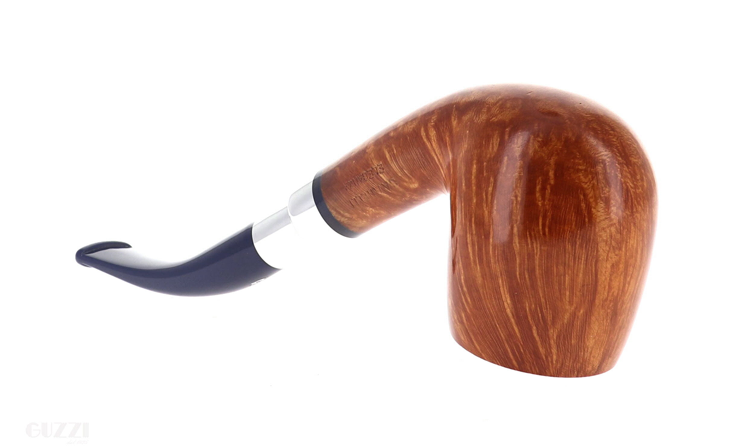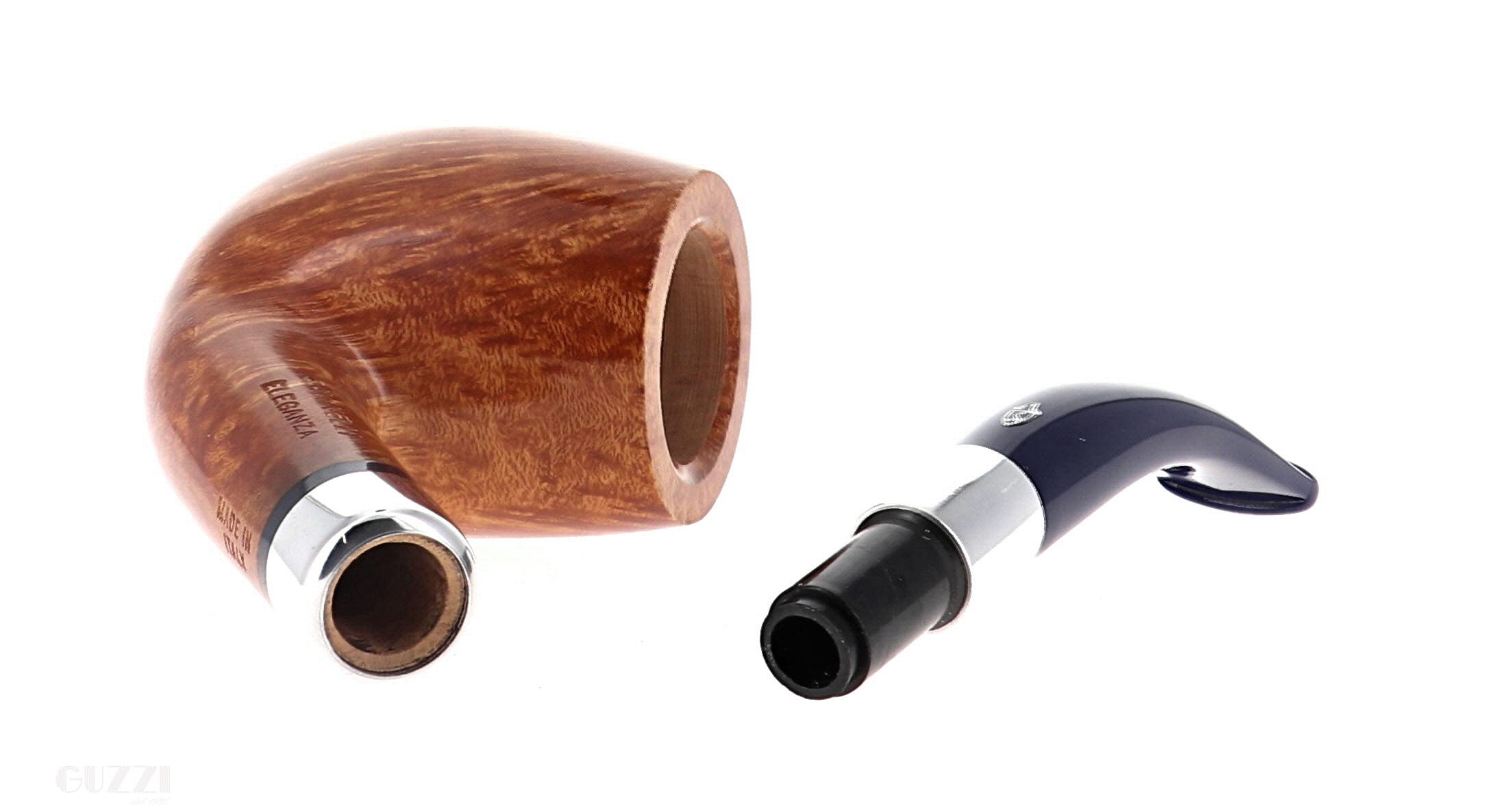 Pipe Savinelli Collection Eleganza 606 KS, natural smoothfinishing, shape bent billiard, elegant nickel spigot, blue methacrylate mouthpiece hole 6mm. New, never smoked. Elegant Savinelli box with cloth bag.
