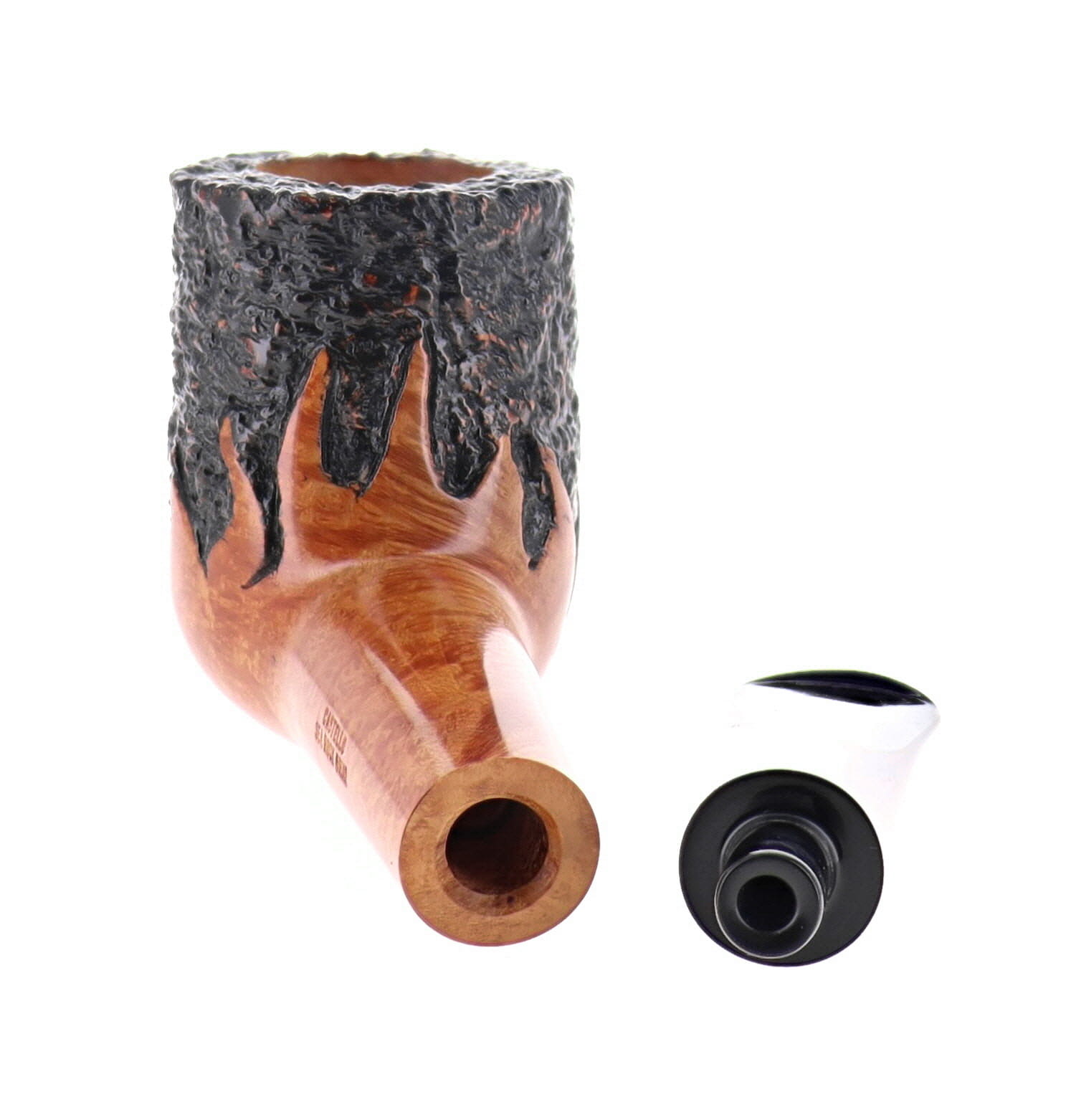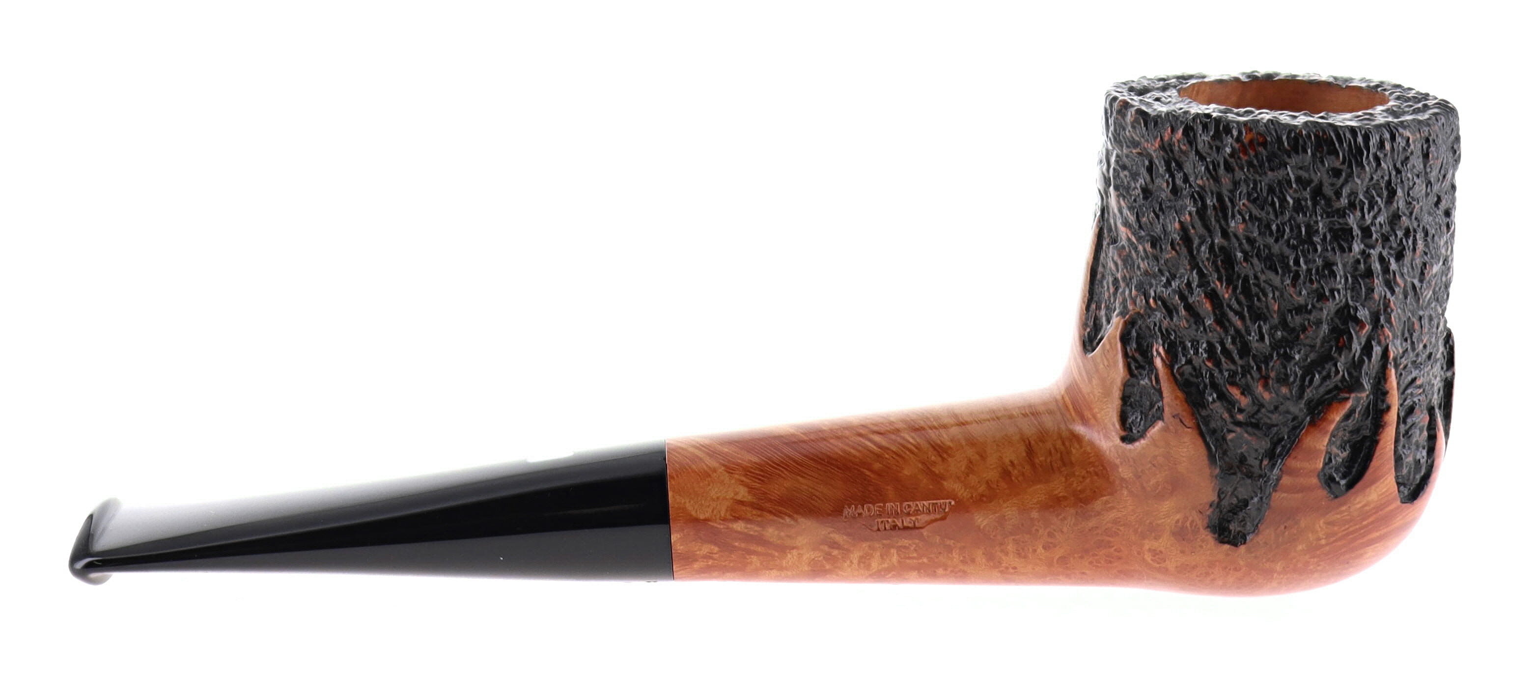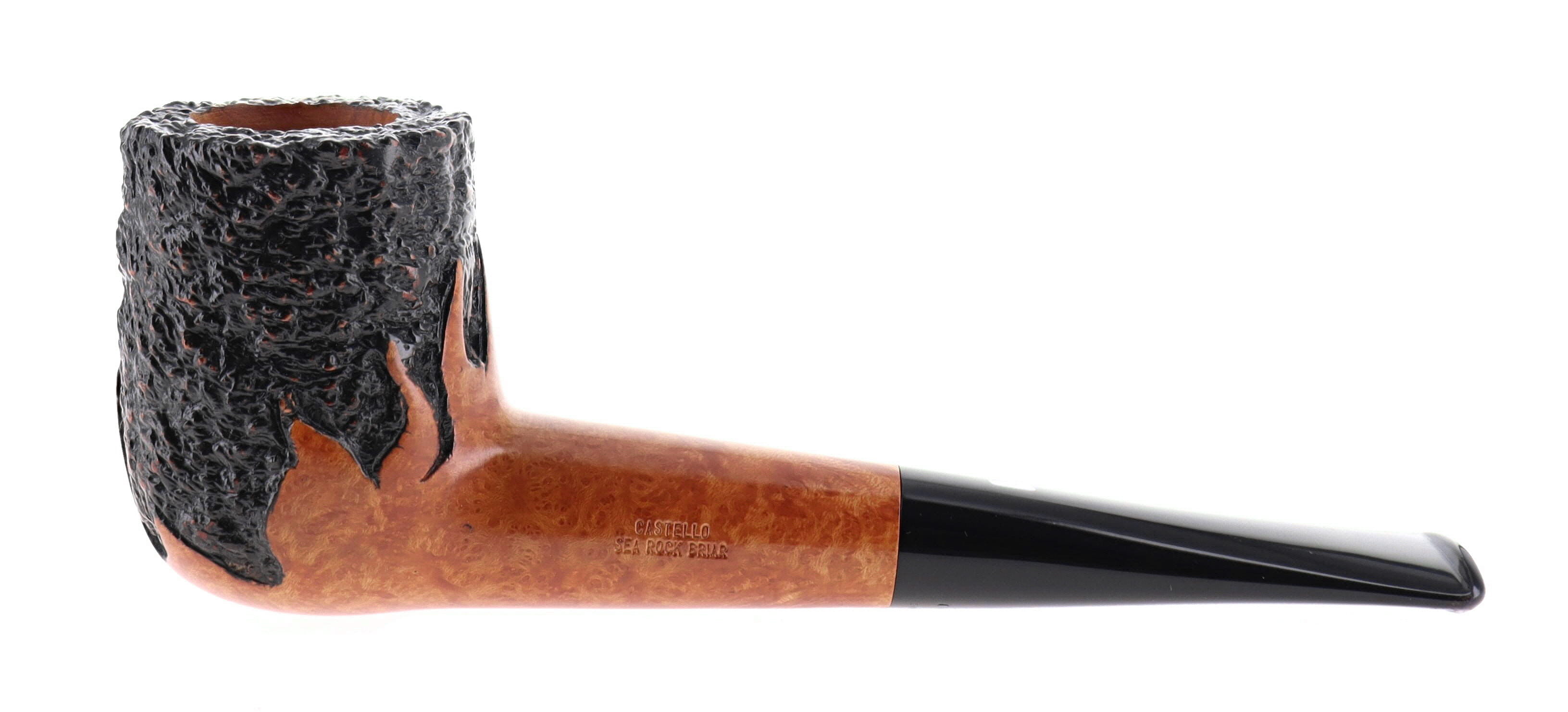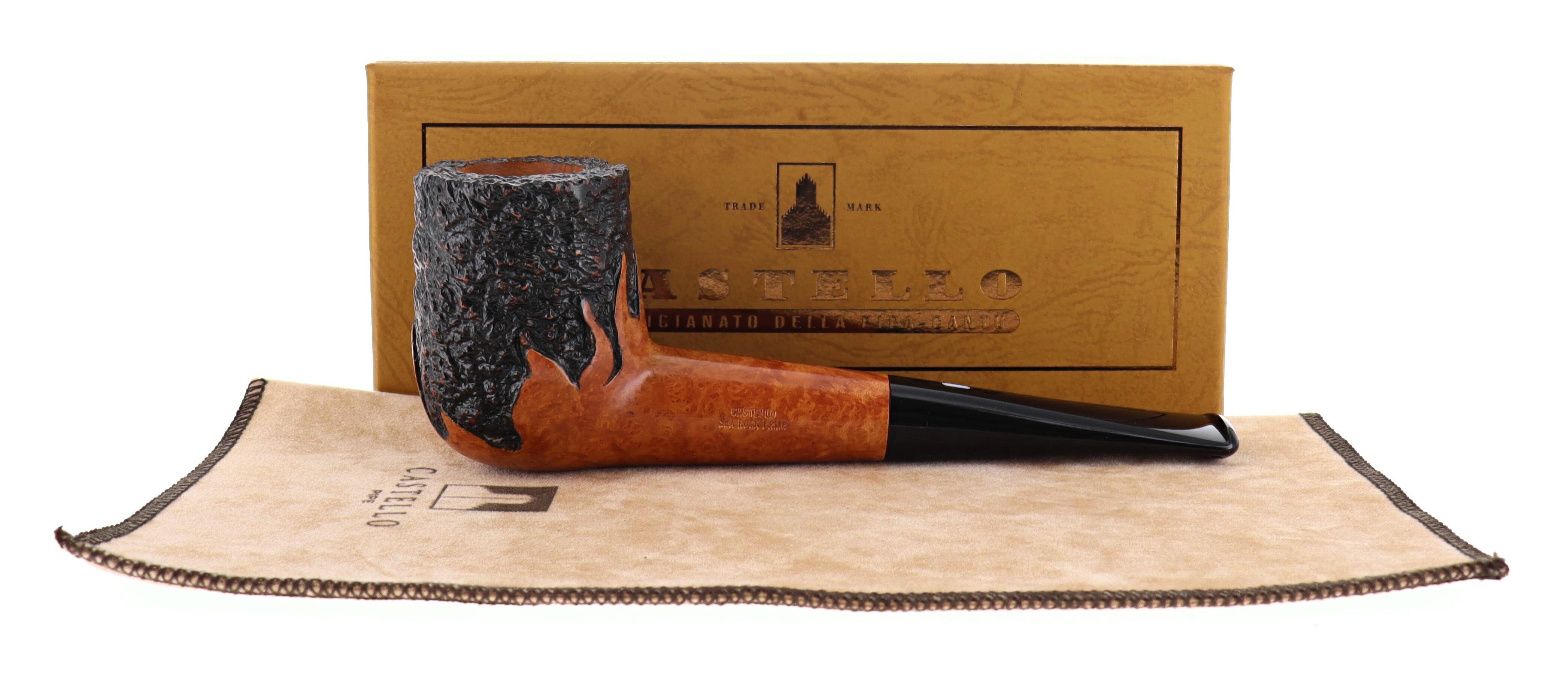 Pipe CASTELLO 0879 100° ANNIVERSARY TABACCHERIA GUZZI 10.29 SEA ROCK BRIAR, flames rusticated finishing, shape stand up billiard, methacrylate mouthpiece. In original box with sock. Perfect, new, never smoked. Pipe made in 2025. Handmade pipes since 1947 in Cantù.