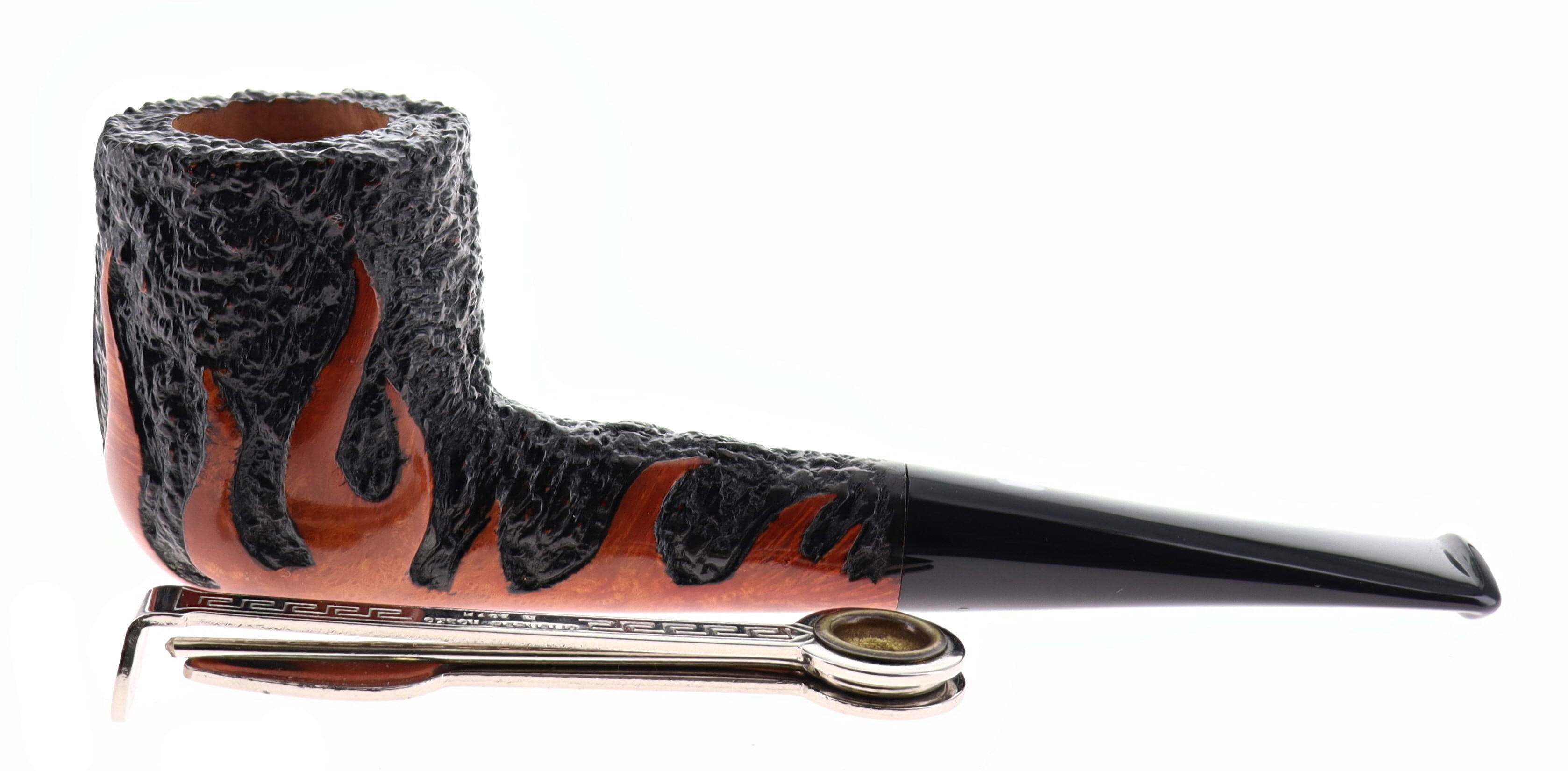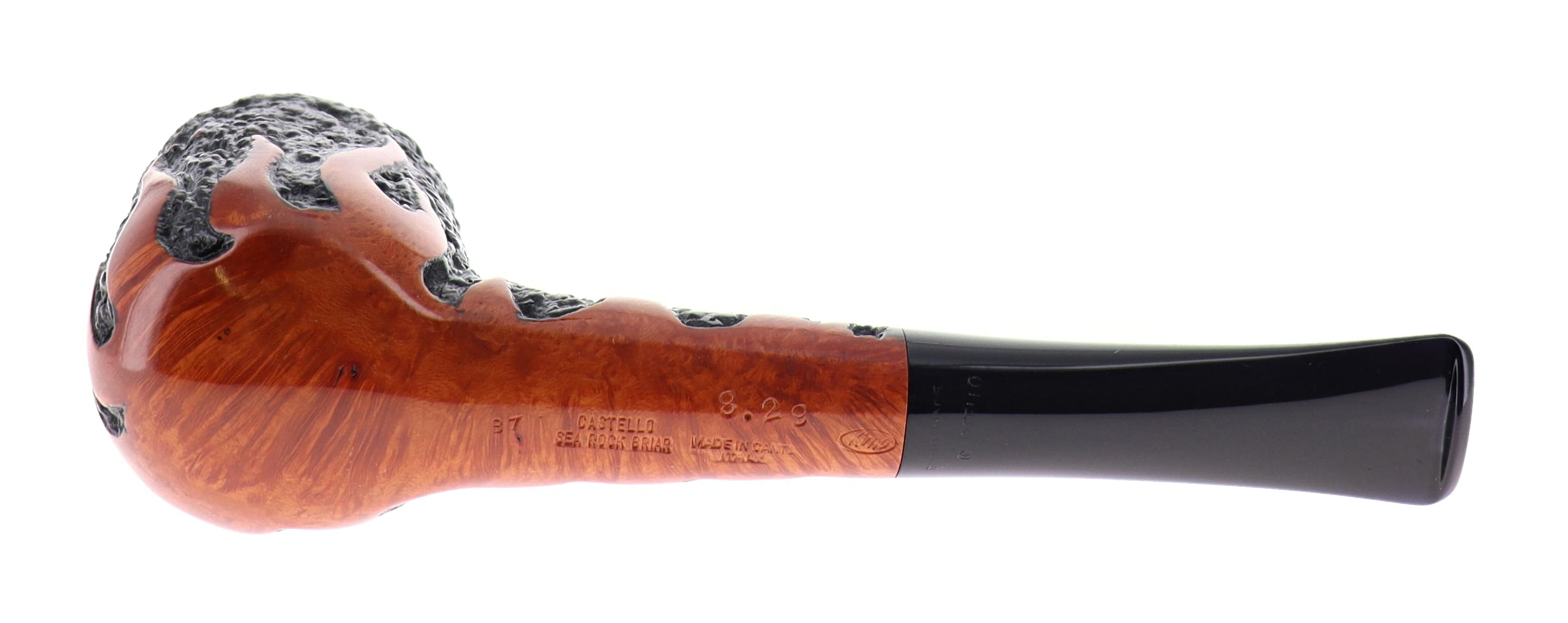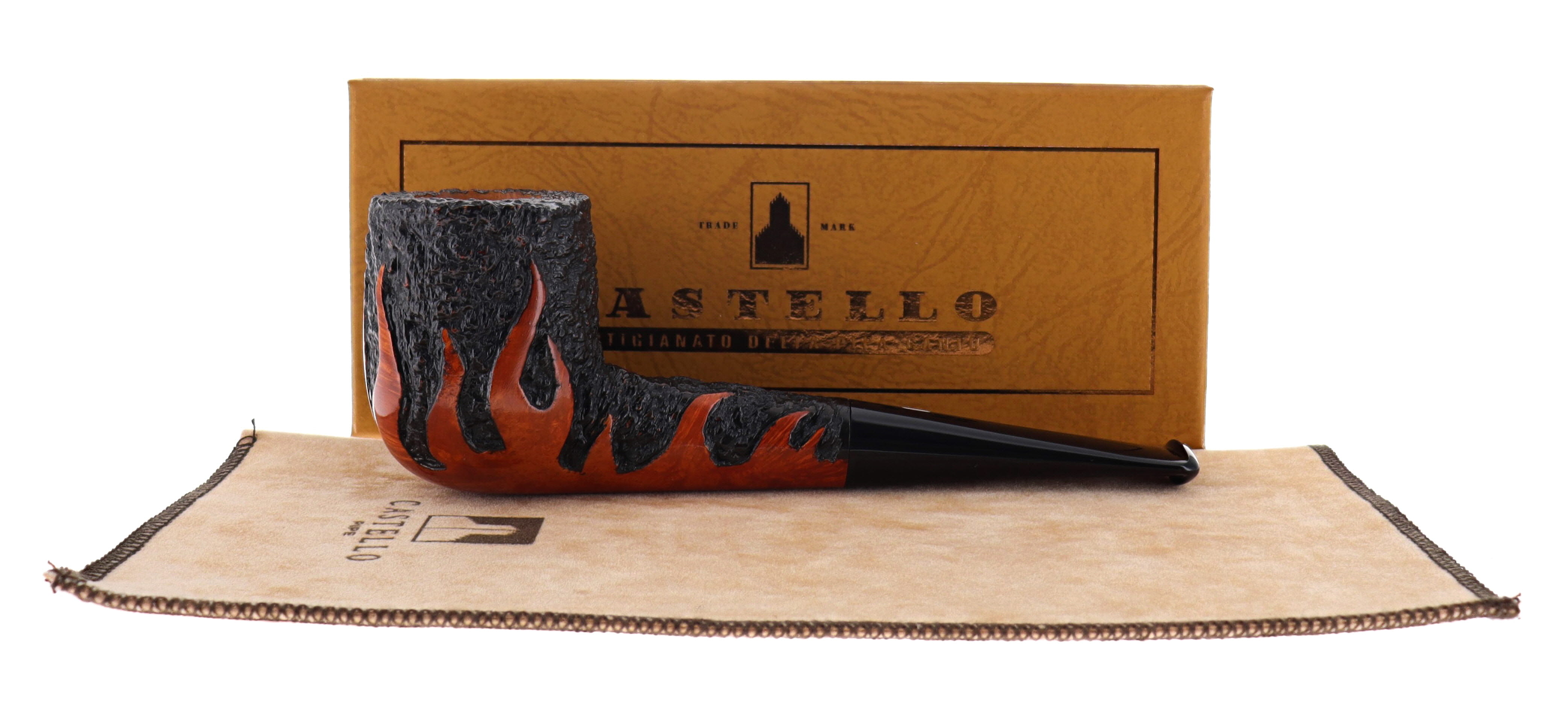 Pipe CASTELLO 0877 100° ANNIVERSARY TABACCHERIA GUZZI 8.29 SEA ROCK BRIAR, flames rusticated finishing, shape stand up billiard, methacrylate mouthpiece. In original box with sock. Perfect, new, never smoked. Pipe made in 2025. Handmade pipes since 1947 in Cantù.