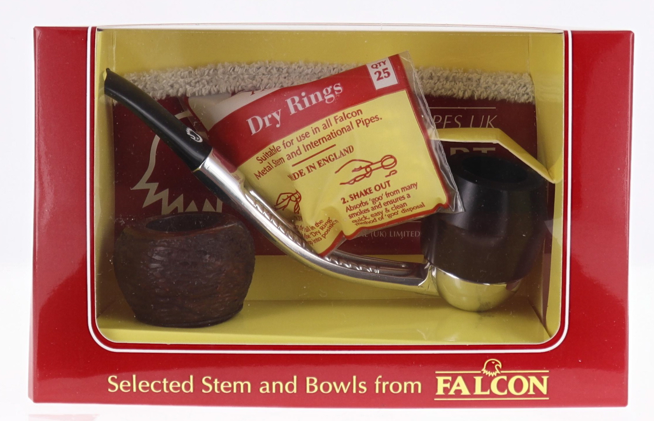Falcon Pipes were designed by Kenley Bugg from Fort Wayne, Indiana, US, in 1936. Bugg wanted to create a light pipe, which had a constantly fresh smoke. He created a pipe made up by detachable parts, with an alluminium base which kept the condensation, nylon mouthpiece and briar (or meerschaum) heads interchangeable in the same pipe.