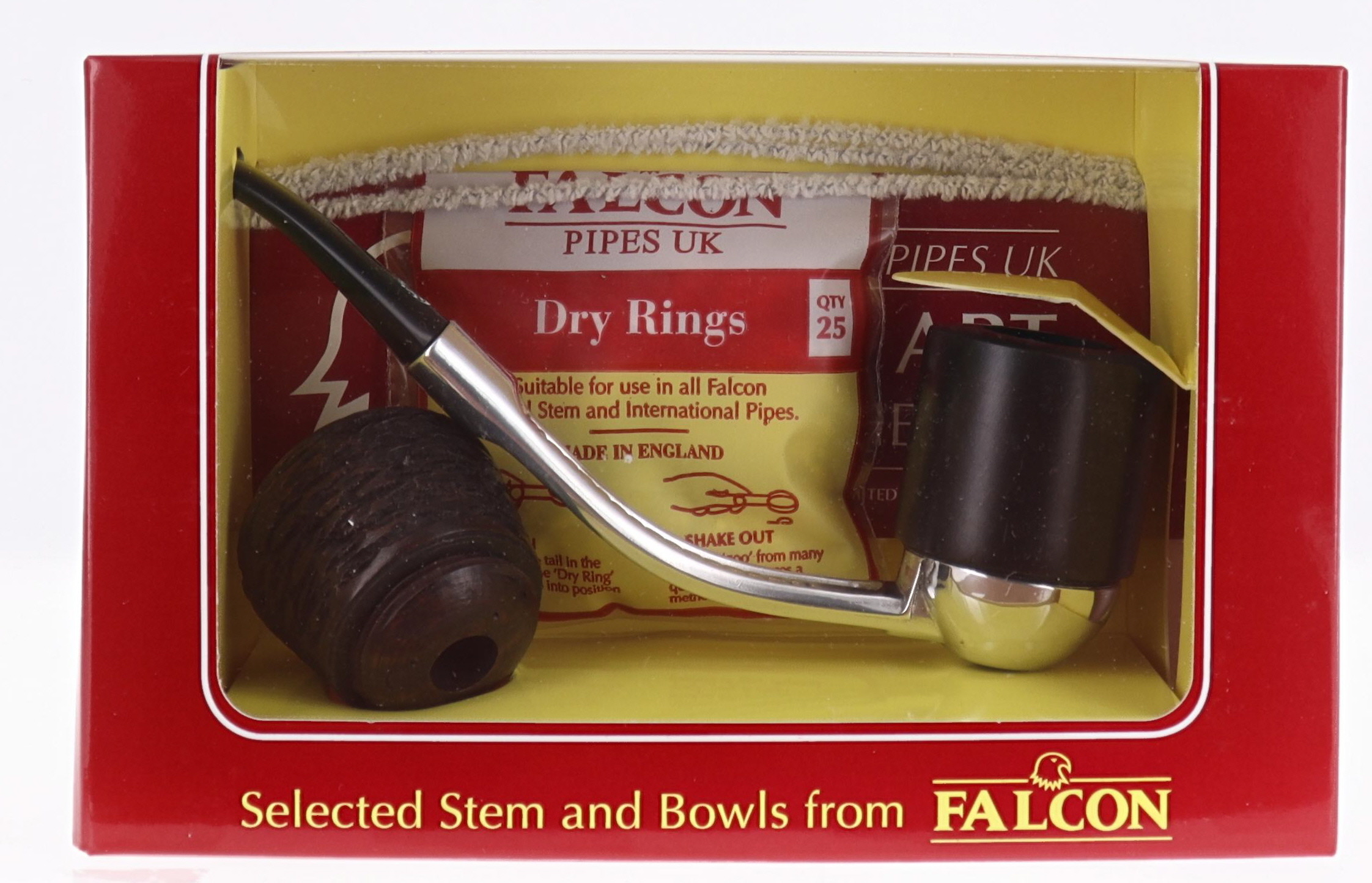 Falcon Pipes were designed by Kenley Bugg from Fort Wayne, Indiana, US, in 1936. Bugg wanted to create a light pipe, which had a constantly fresh smoke. He created a pipe made up by detachable parts, with an alluminium base which kept the condensation, nylon mouthpiece and briar (or meerschaum) heads interchangeable in the same pipe.