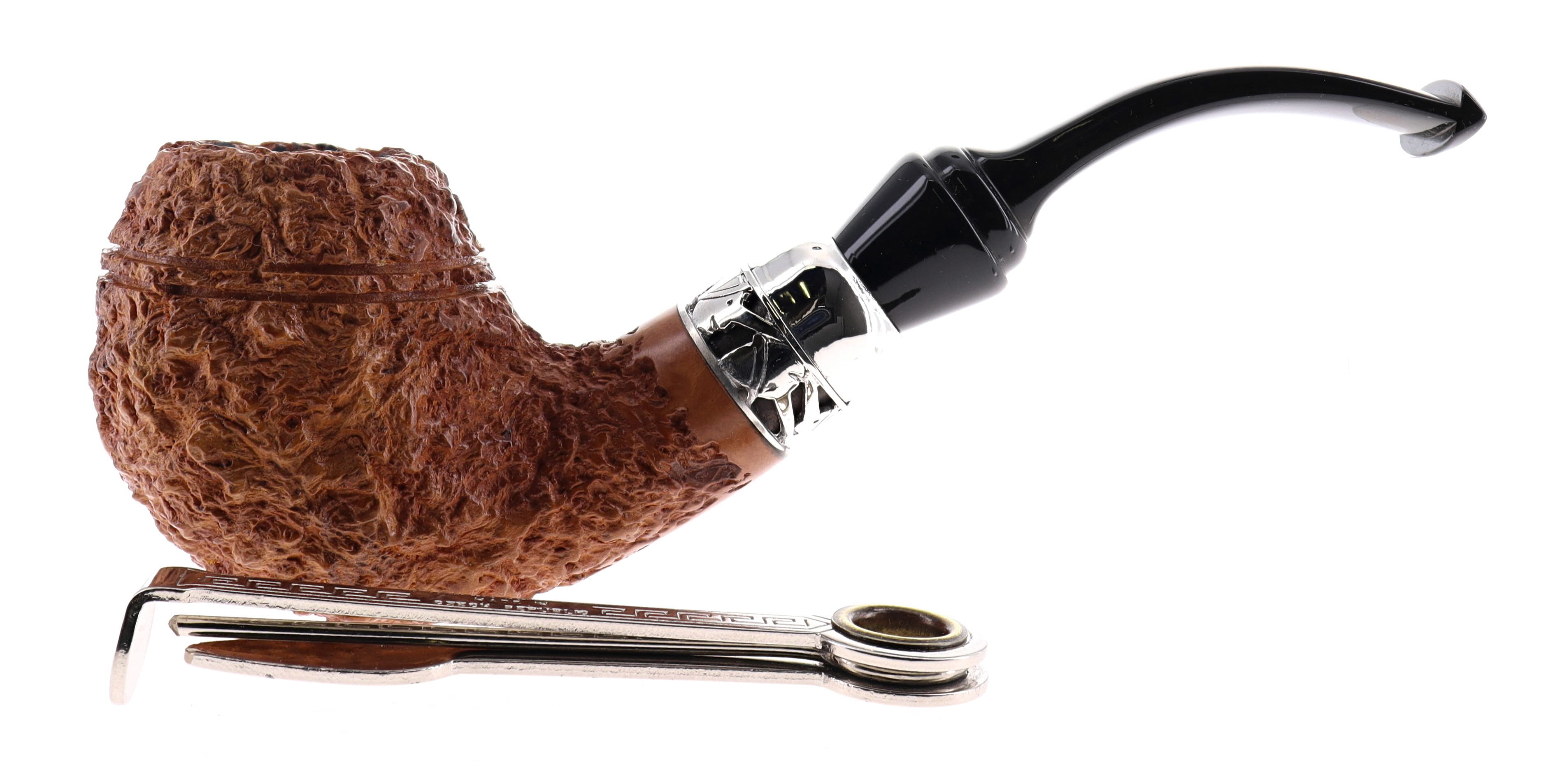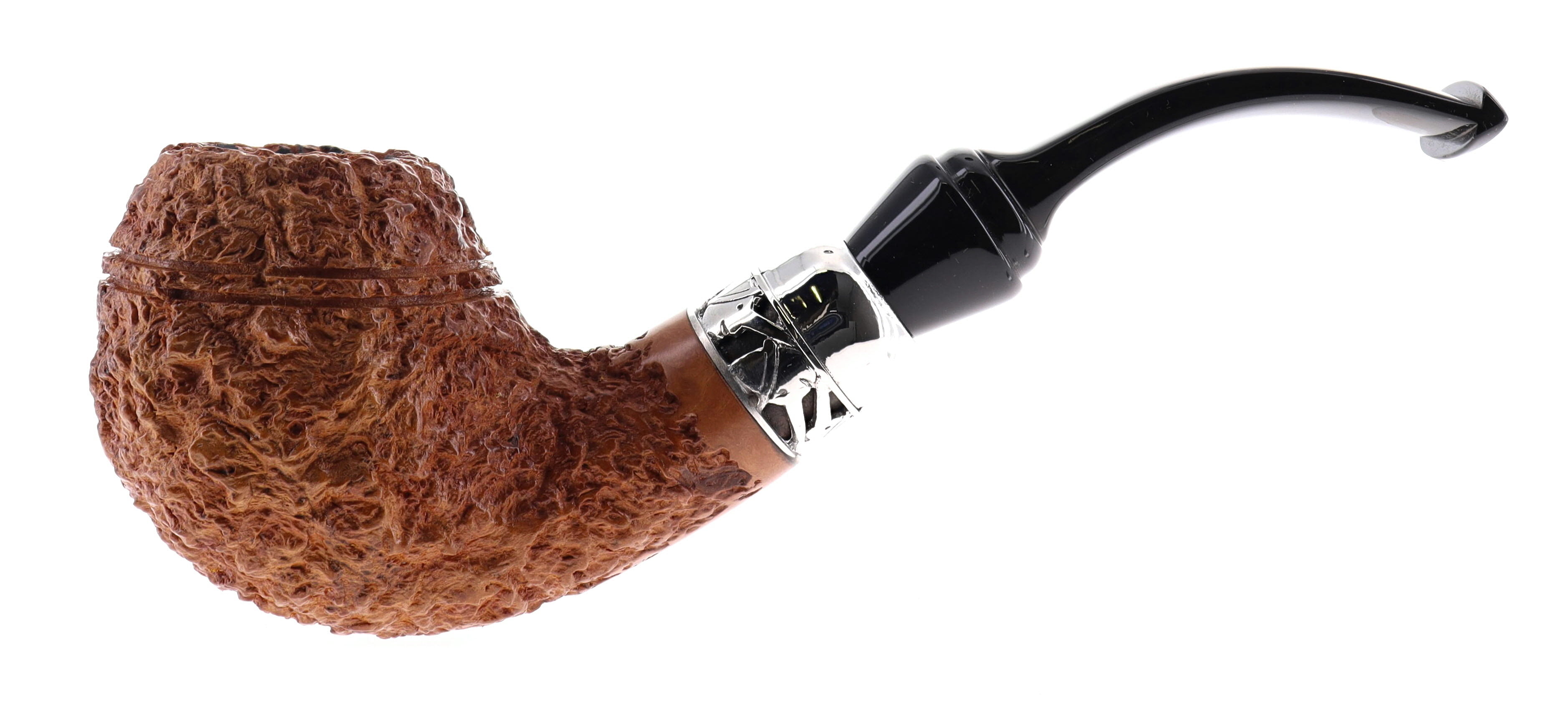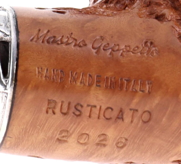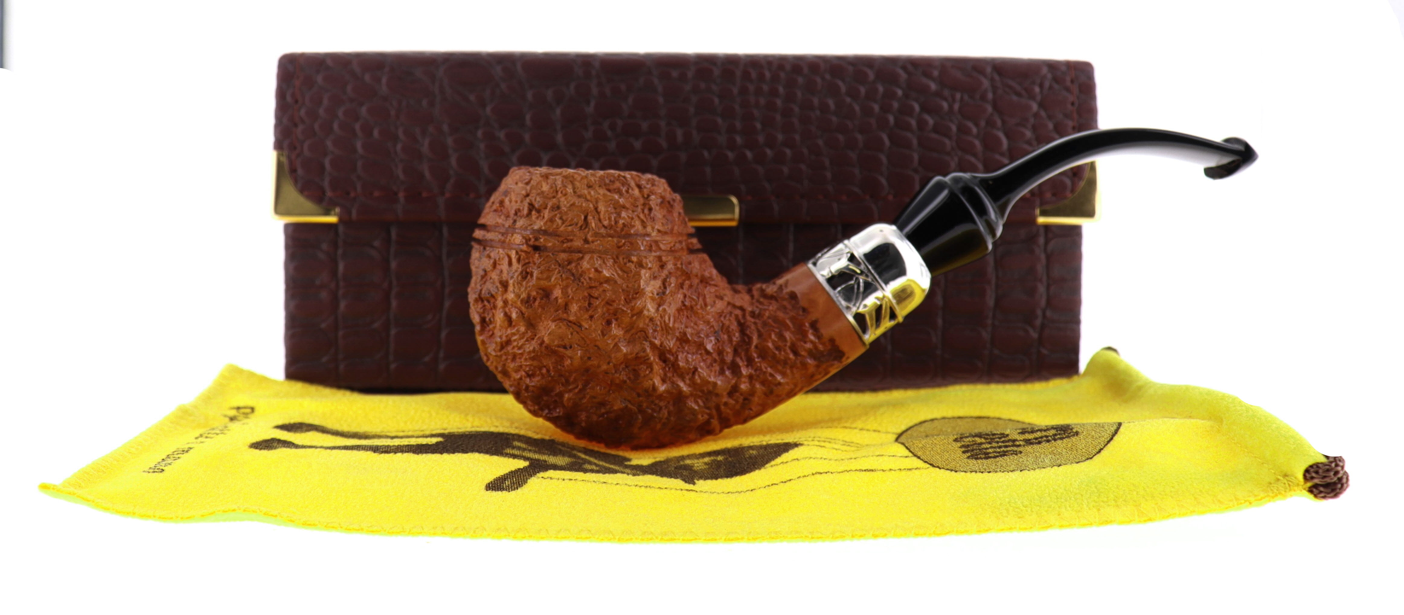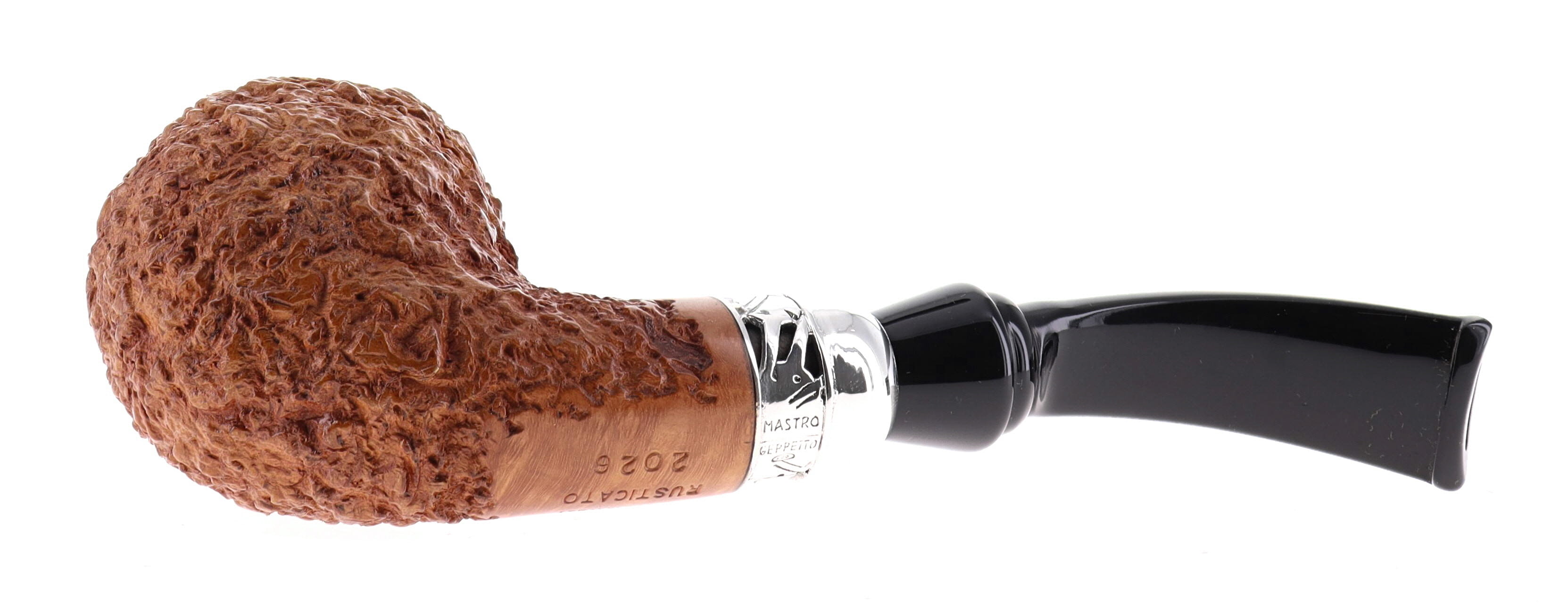 Pipe MASTRO GEPPETTO by Ser Jacopo. Pipa Mastro Geppetto 185 PIPE OF THE YEAR 2026, rusticated finishing, shape half bent apple with silver ring, methacrylate mouthpiece. In original box with sock. New, never smoked.