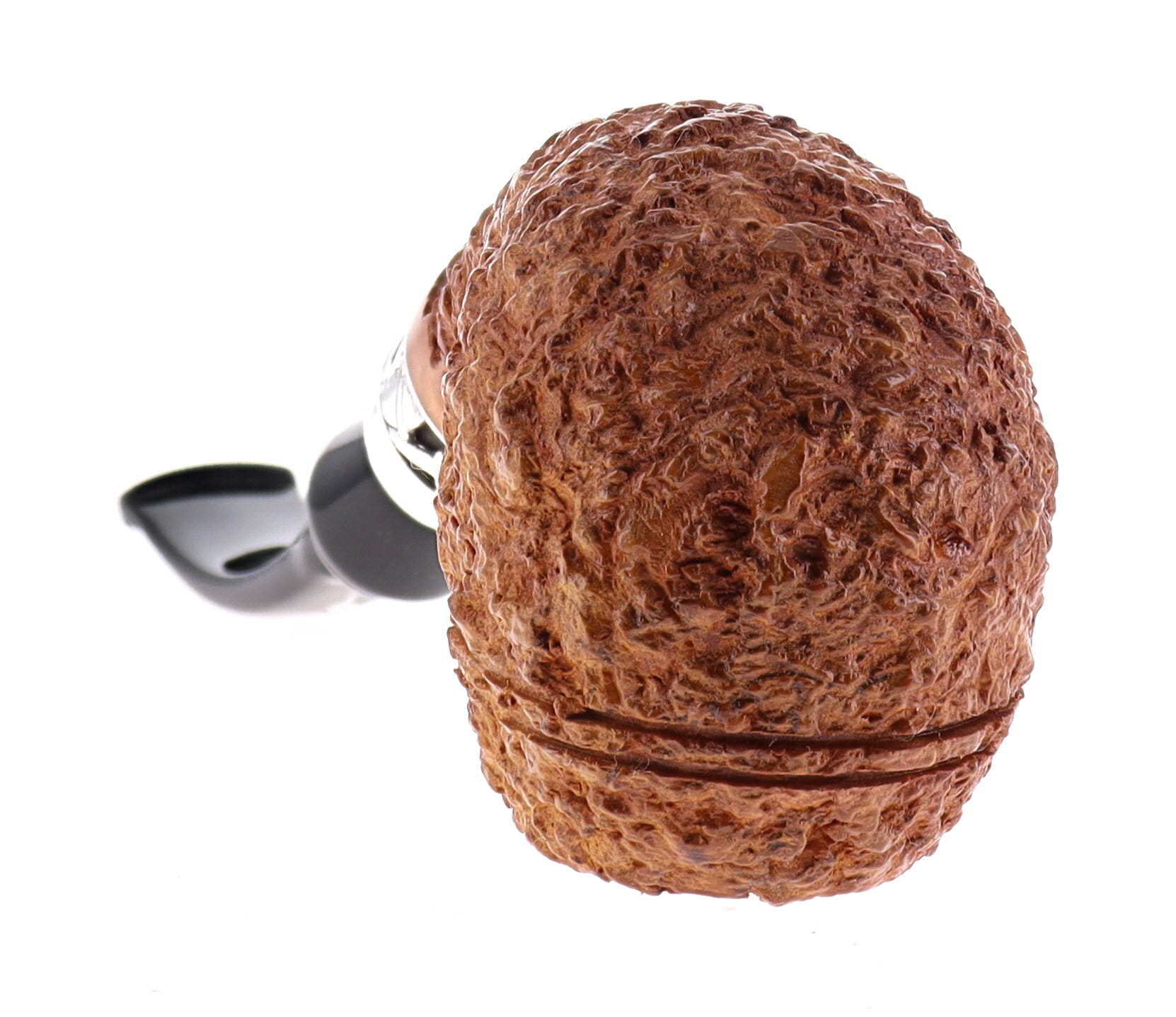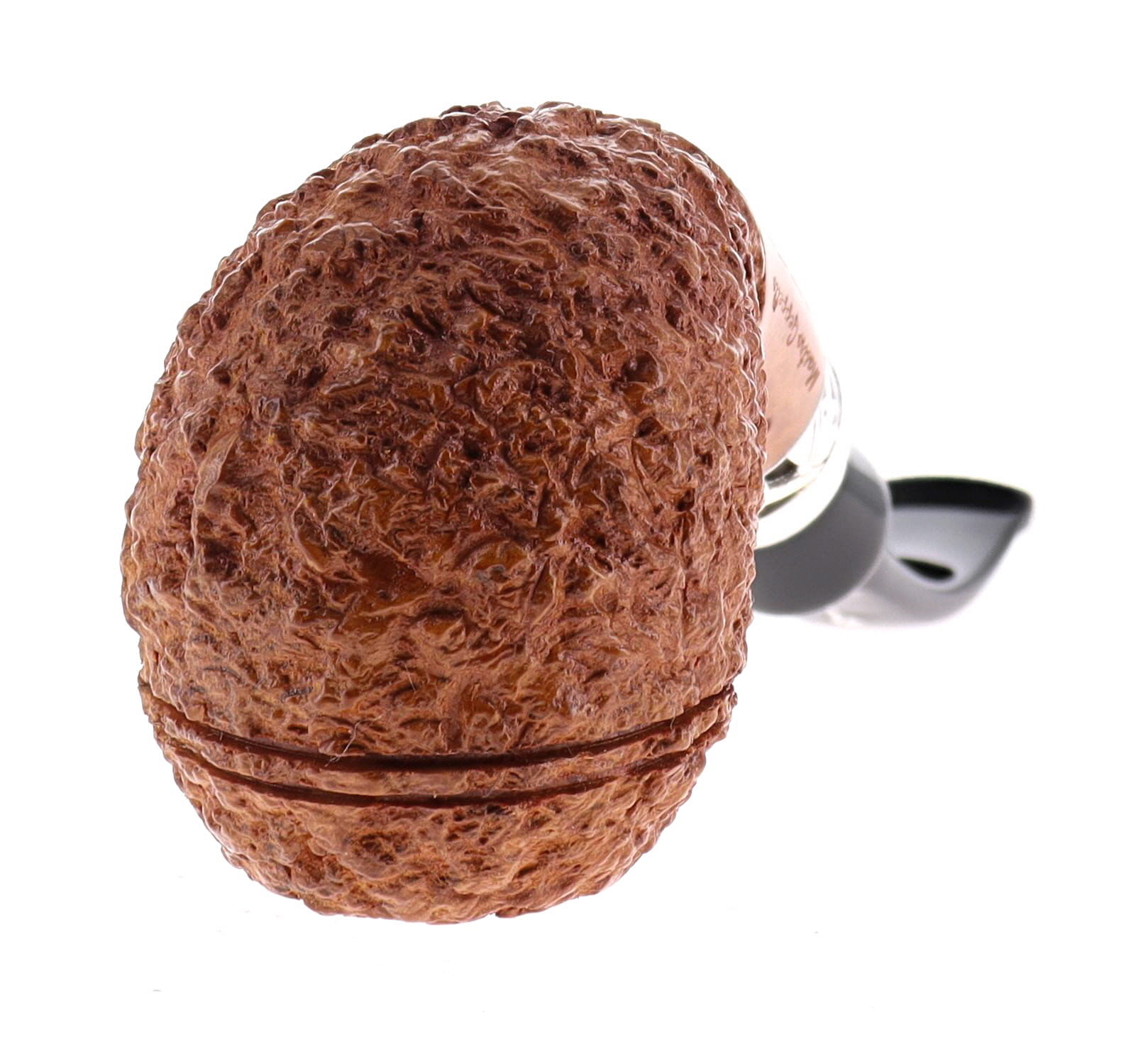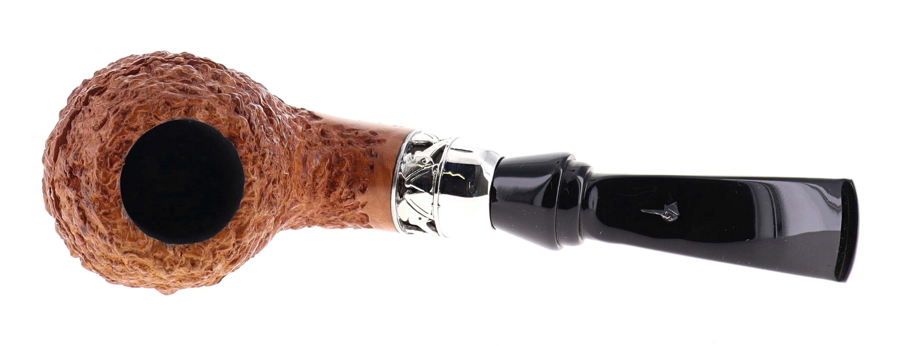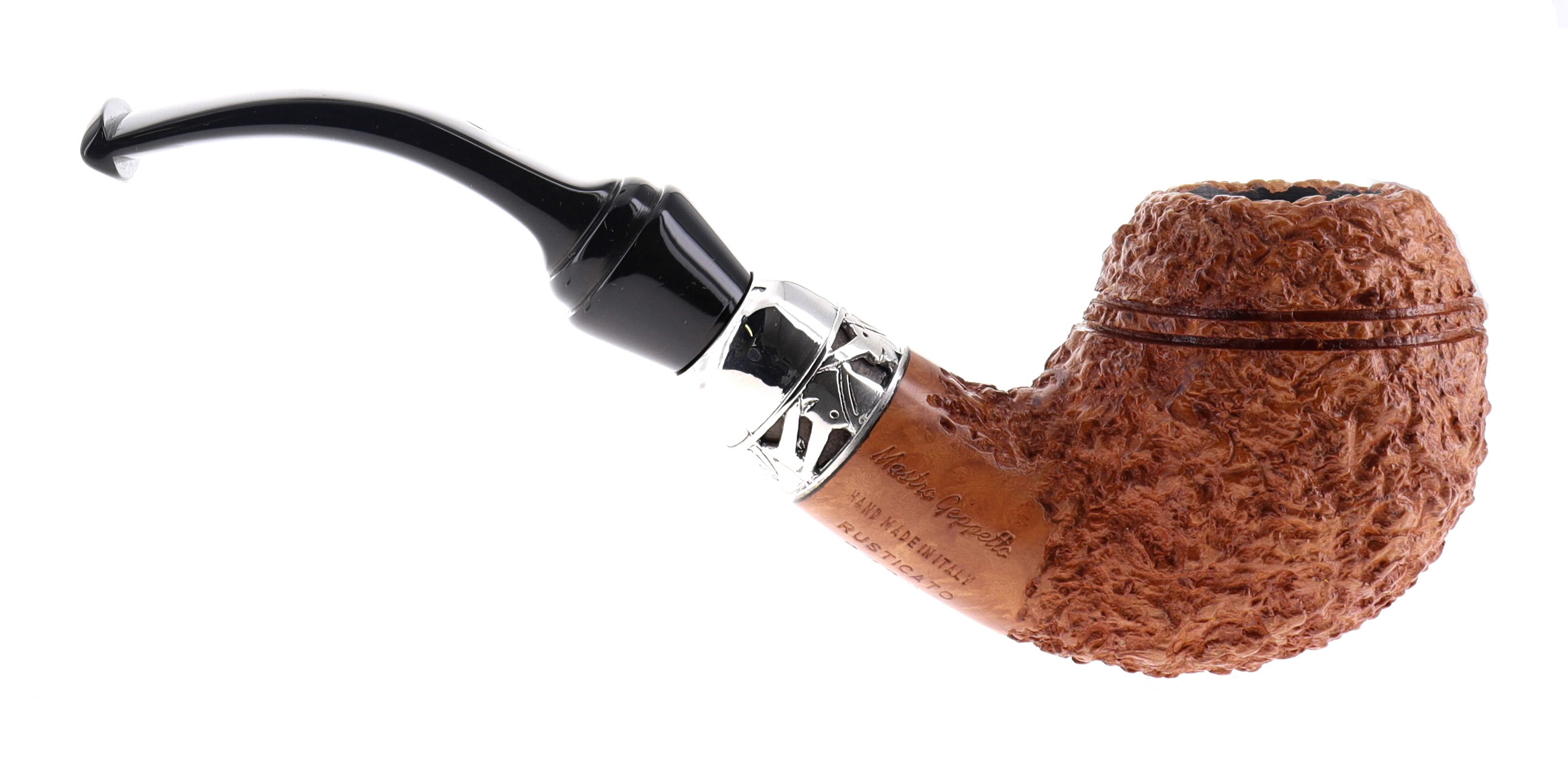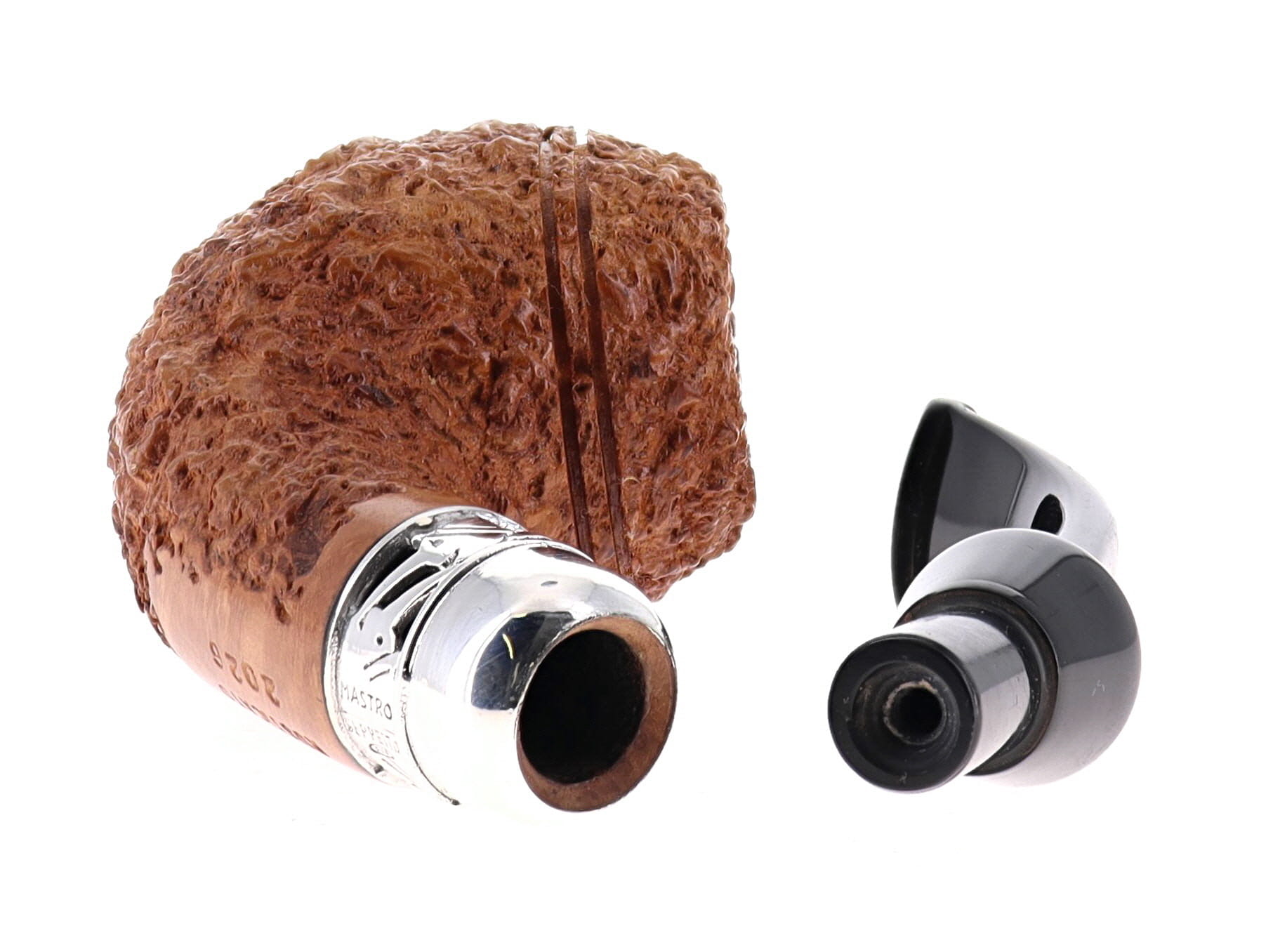 Pipe MASTRO GEPPETTO by Ser Jacopo. Pipa Mastro Geppetto 185 PIPE OF THE YEAR 2026, rusticated finishing, shape half bent apple with silver ring, methacrylate mouthpiece. In original box with sock. New, never smoked.