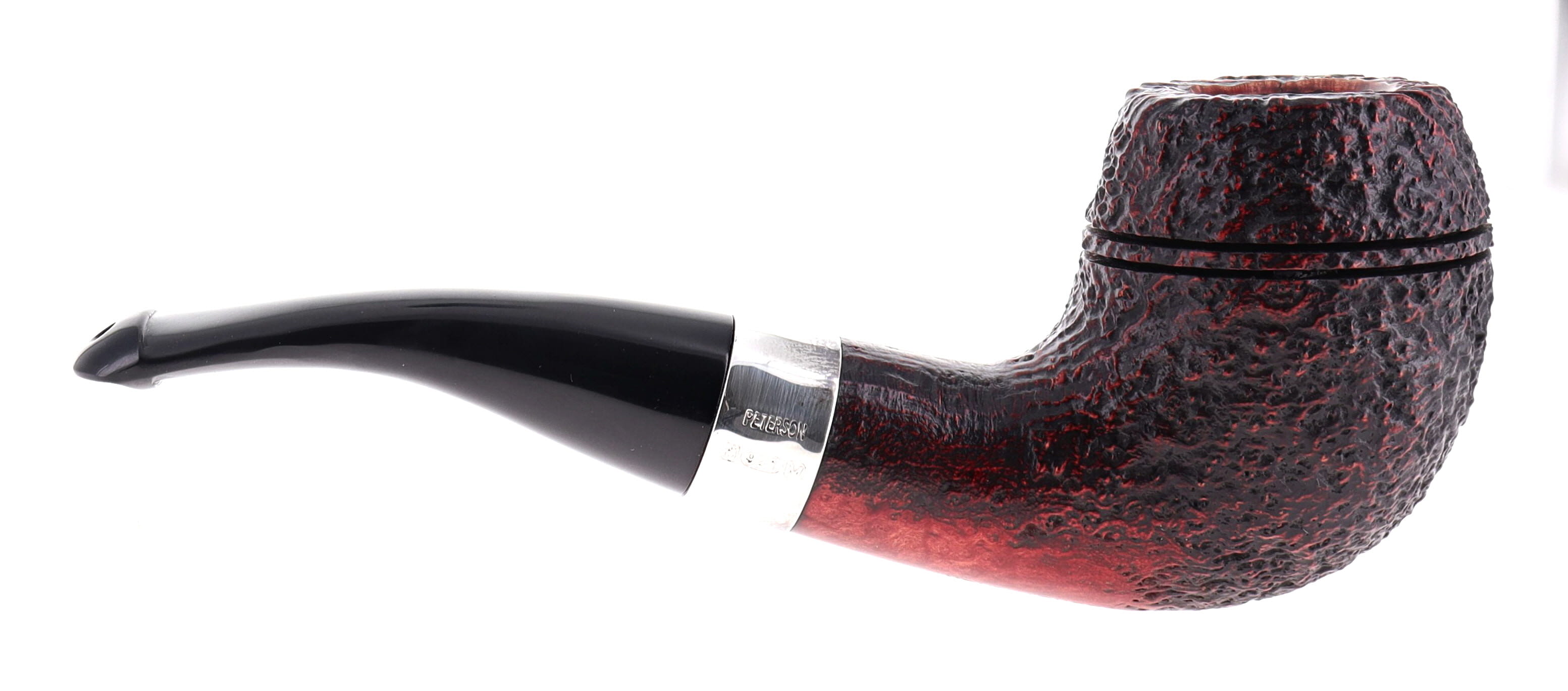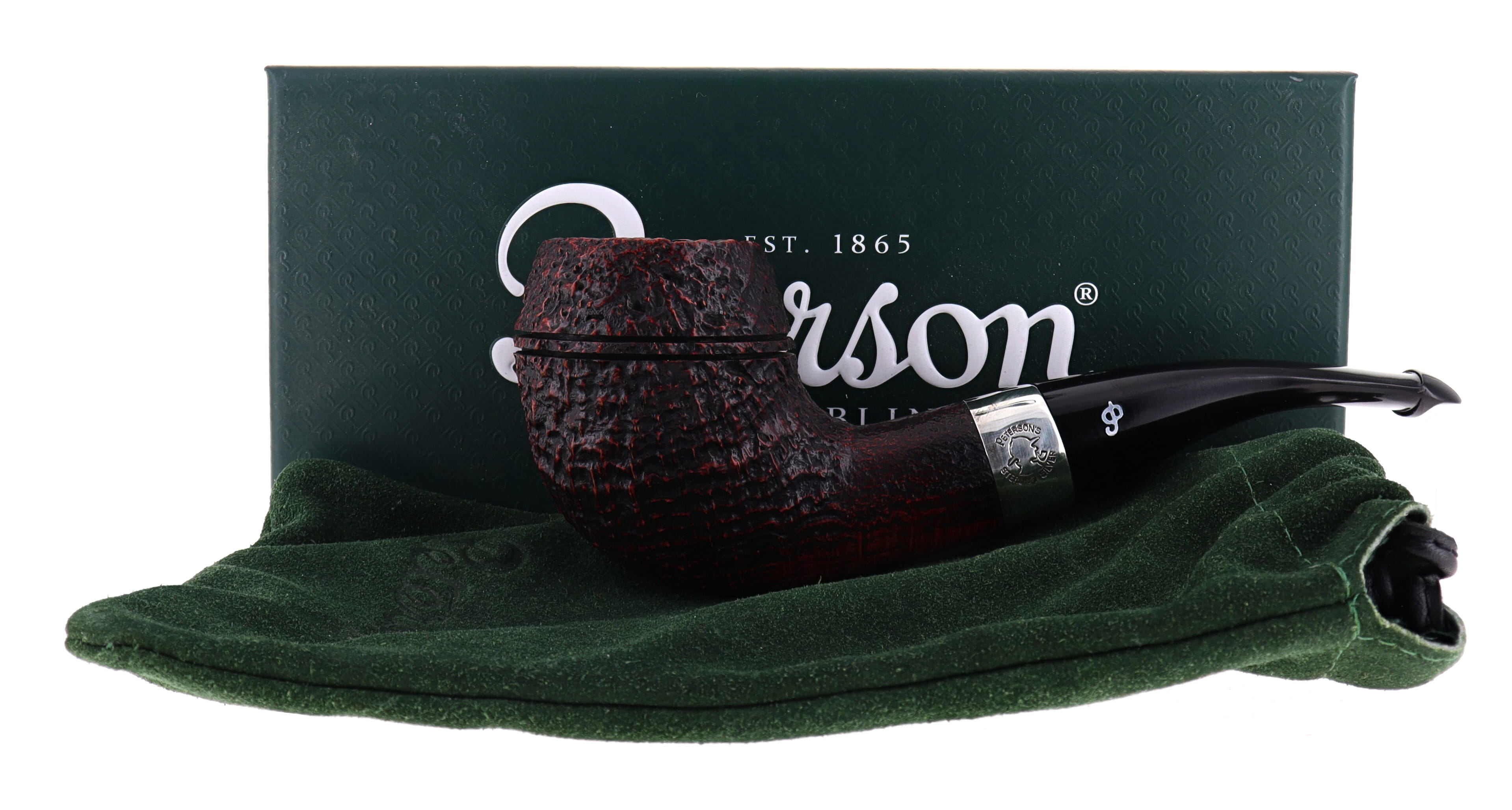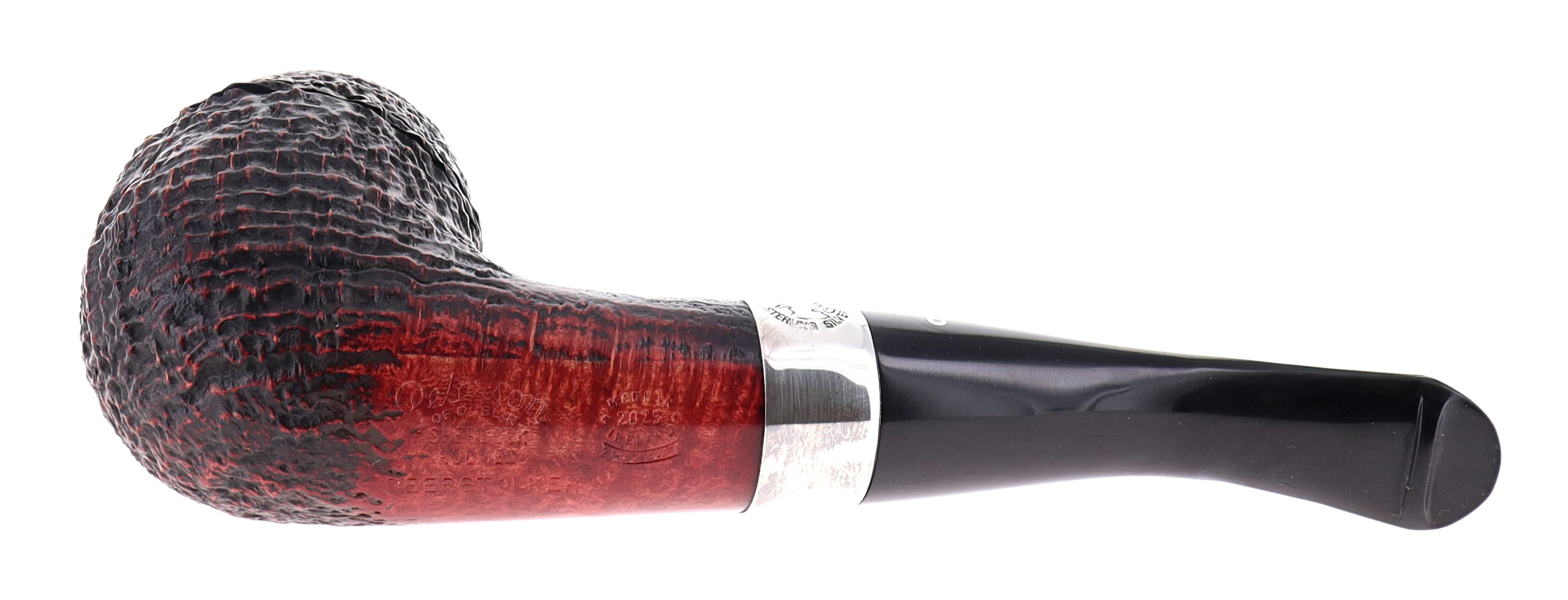 Pipe Peterson of Dublin SHERLOCK HOLMES DEERSTALKER, brown sandblasted finishing, shape rounded bulldog with silver ring, ebonite mouthpiece with palatal. Perfect, new, never smoked. In original box with sock bag.