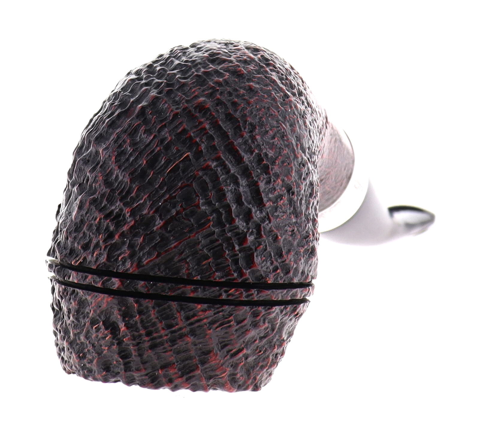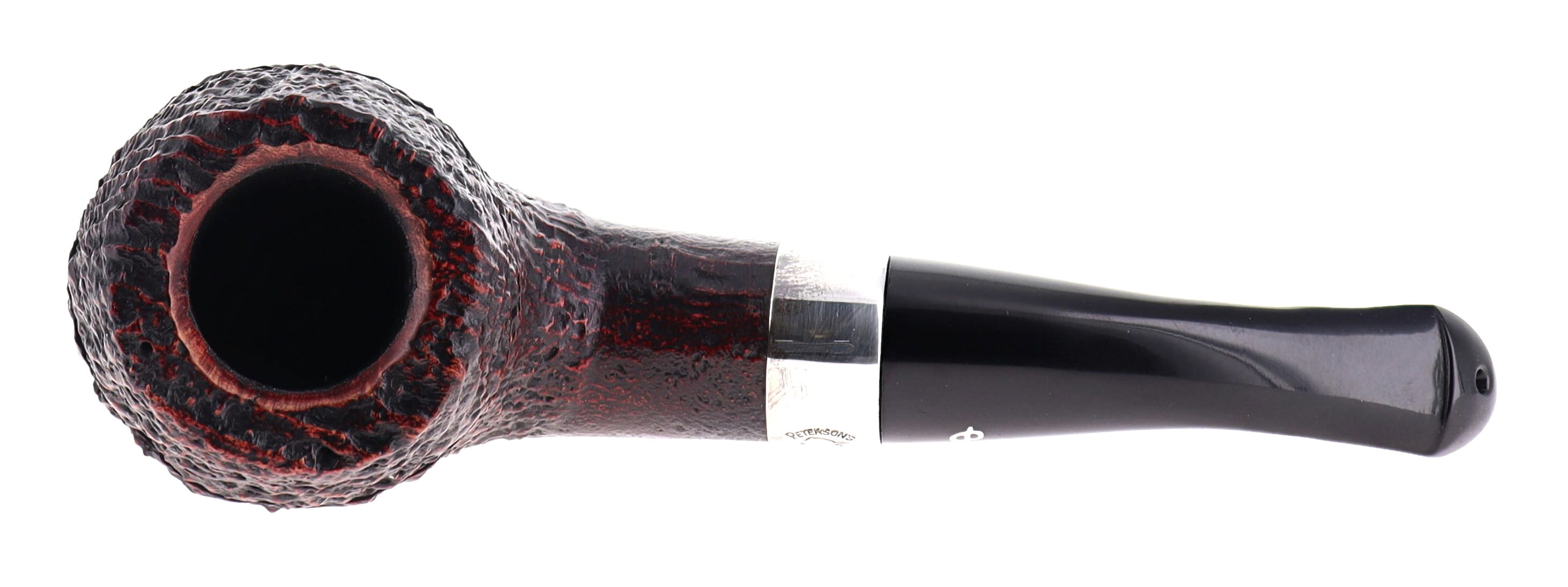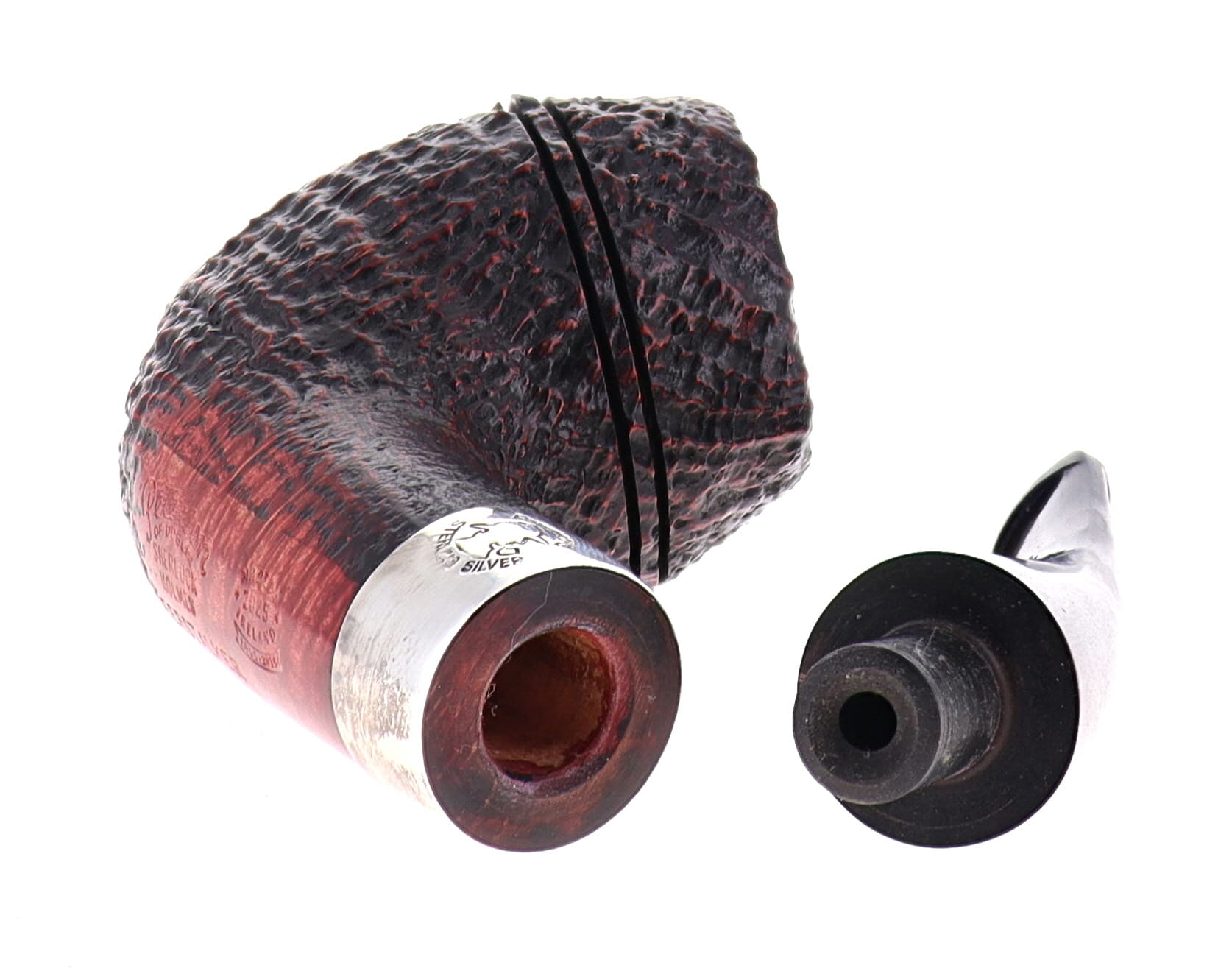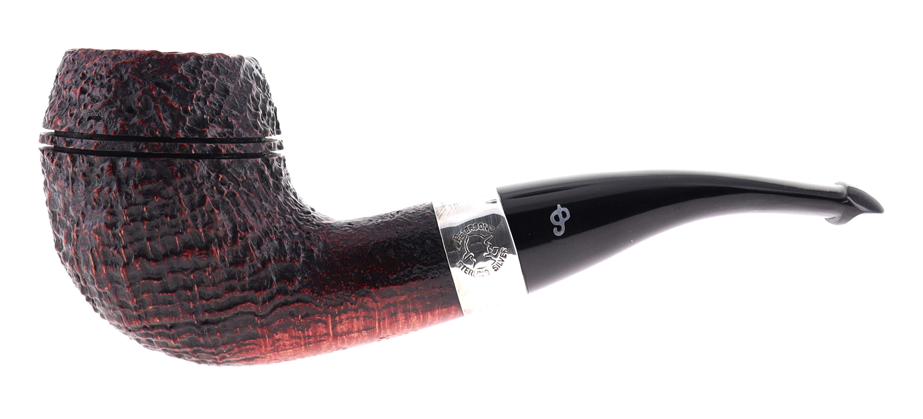 Pipe Peterson of Dublin SHERLOCK HOLMES DEERSTALKER, brown sandblasted finishing, shape rounded bulldog with silver ring, ebonite mouthpiece with palatal. Perfect, new, never smoked. In original box with sock bag.