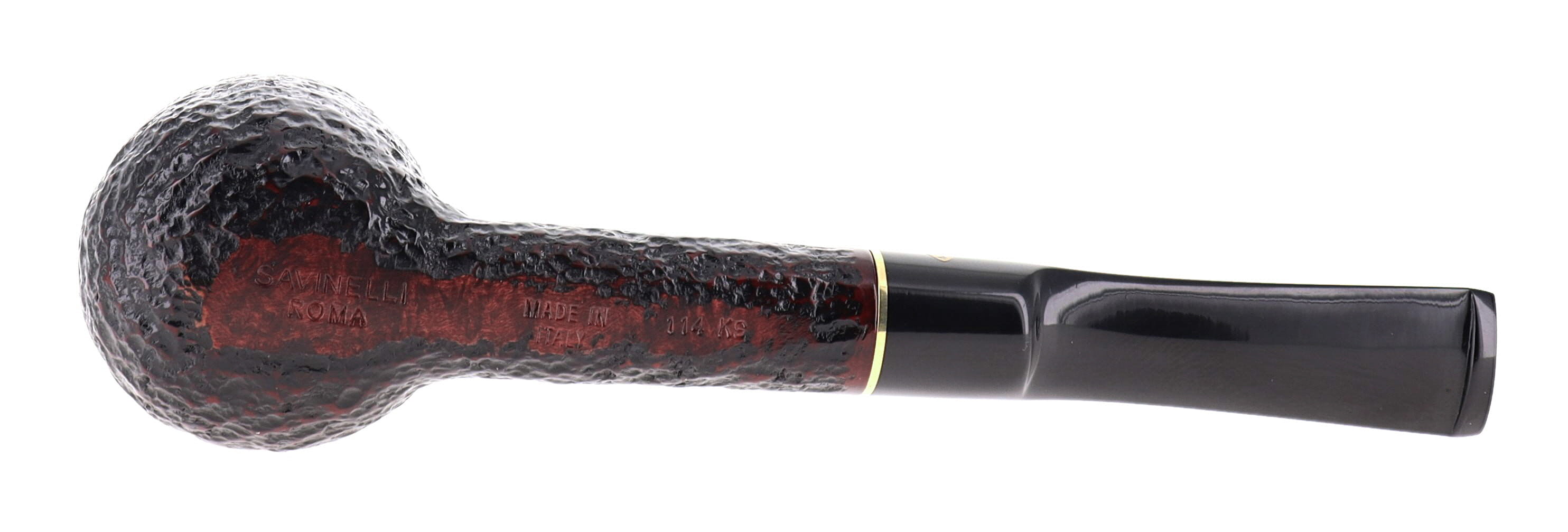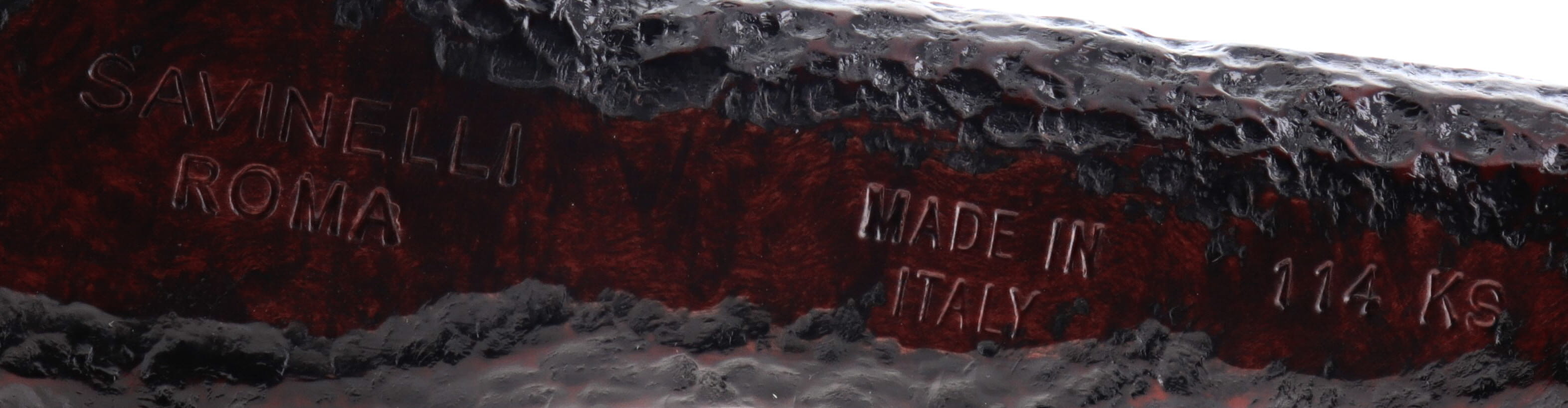 One of the Savinelli pipe series, undoubtedly one of the most popular and enduring. A warm burgundy color covers the entire wooden surface of the pipe. Thanks to the smooth edge of the bowl, you can see how the briar reveals different colors as the finish changes. A thin brass band decorates the junction between the shank and the mouthpiece. A pipe from the Roma series should truly be on any respectable pipe rack. The 114 KS model is a straight Billiard with a saddle mouthpiece, a variation of the 111 KS. It has a sturdy and roomy bowl.