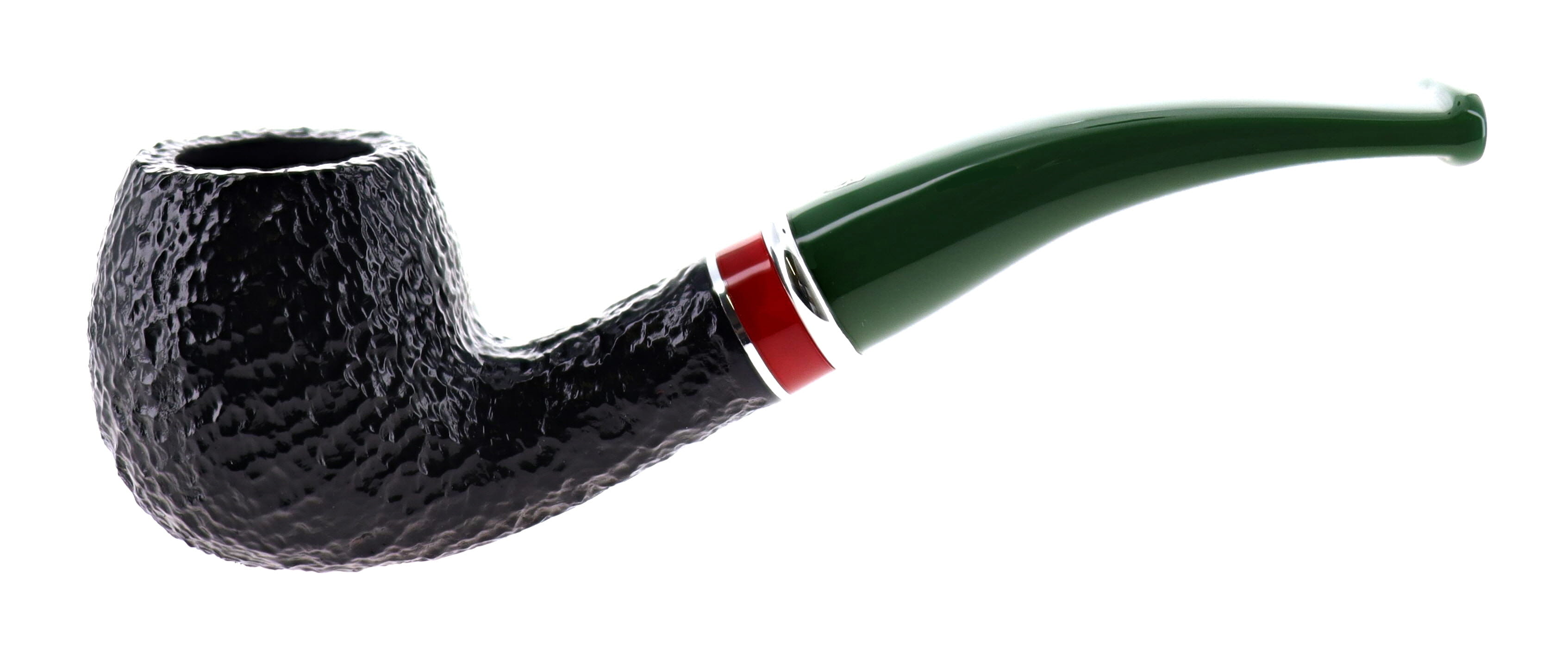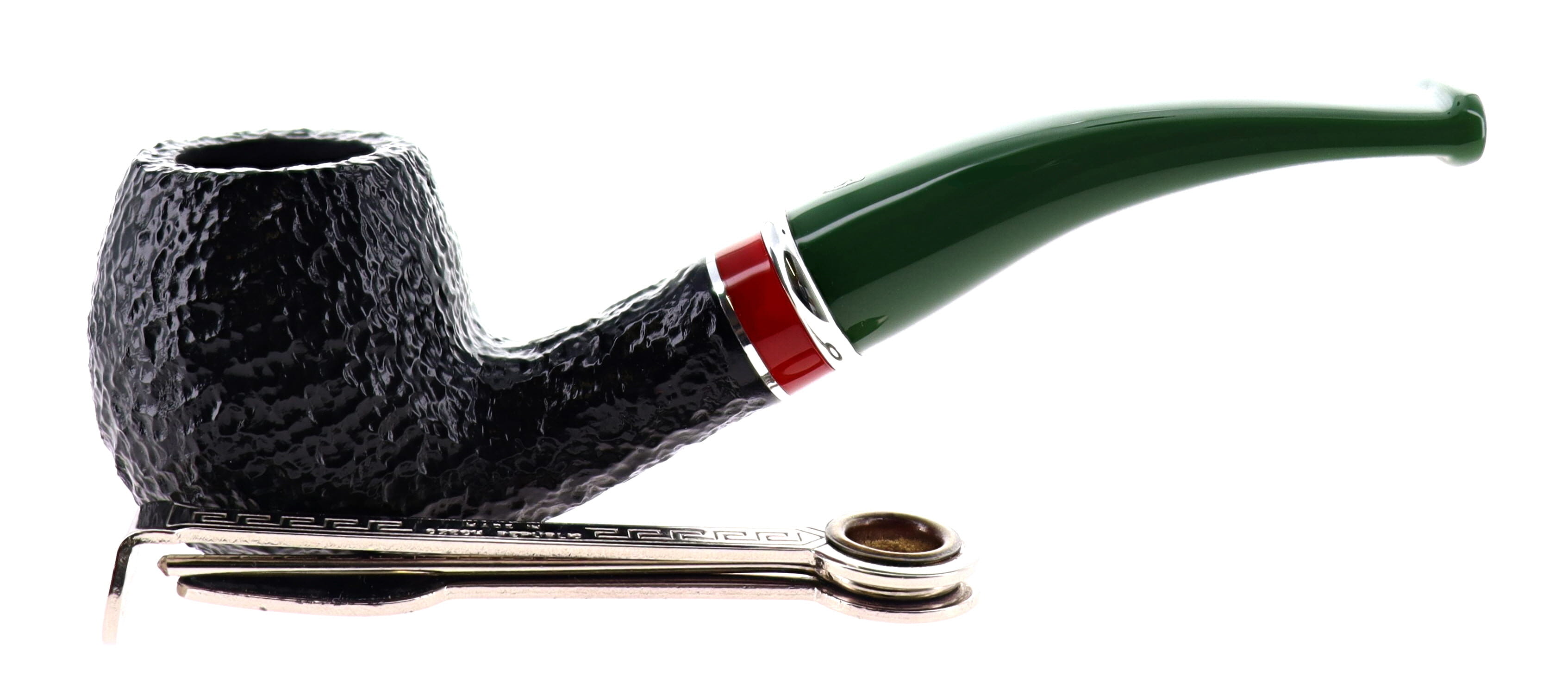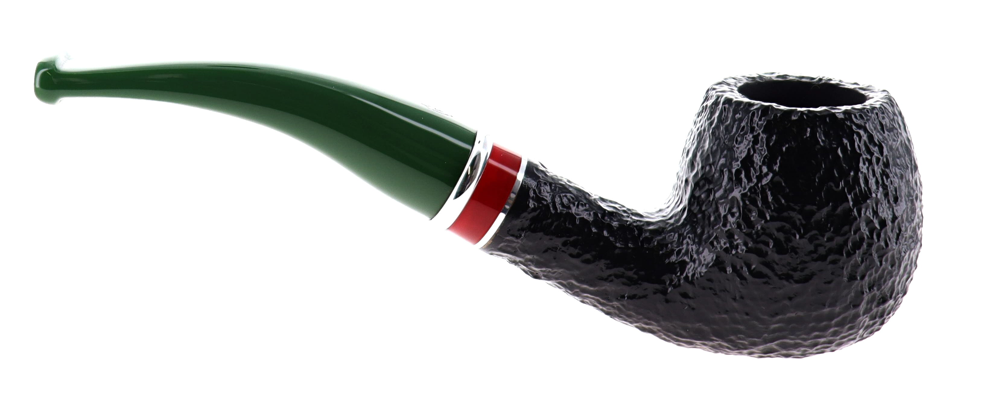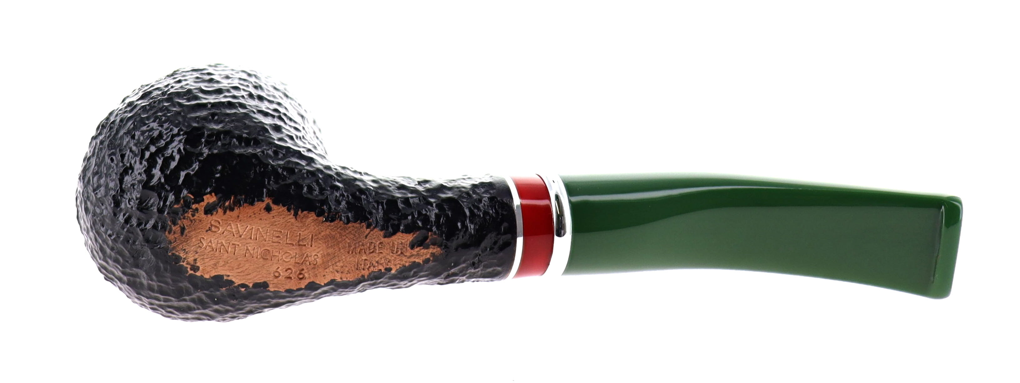 Pipe Savinelli St. Nicholas 2024 626, burgundy rusticated finishing, shape half bent apple, amber coloured methacrylate mouthpiece with two gold-colored rings that enclose a 9mm red methacrylate band. New, never smoked. Limited Edition 2024