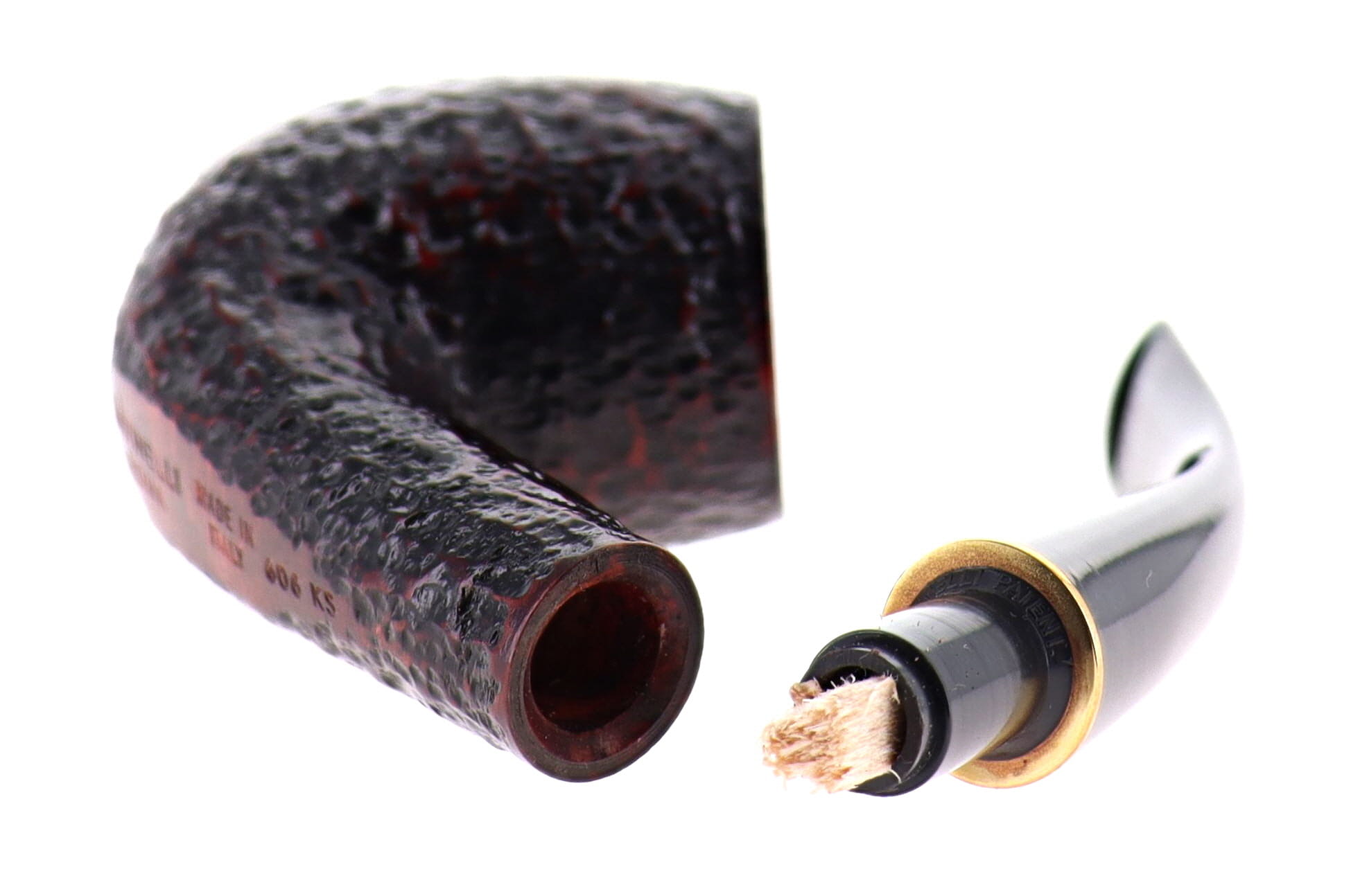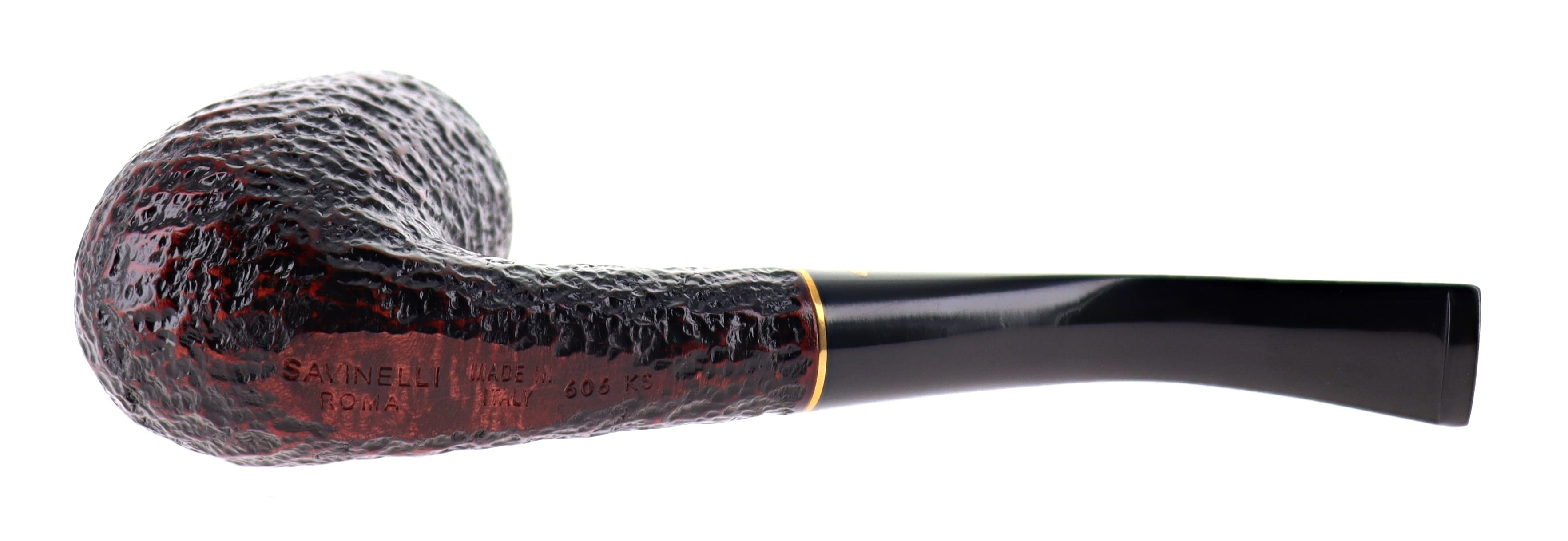 One of the Savinelli pipe series, undoubtedly one of the most popular and enduring. A warm burgundy color covers the entire wooden surface of the pipe. Thanks to the smooth edge of the bowl, you can see how the briar wood takes on different colors as the finish changes. A thin brass band decorates the junction between the shank and the mouthpiece. A pipe from the Roma series should truly be on any respectable pipe rack. The 606 KS model is certainly one of the most classic shapes among curved pipes. The large bowl will allow you to enjoy your favorite tobacco for hours, without tiring your mouth thanks to its pronounced curve.