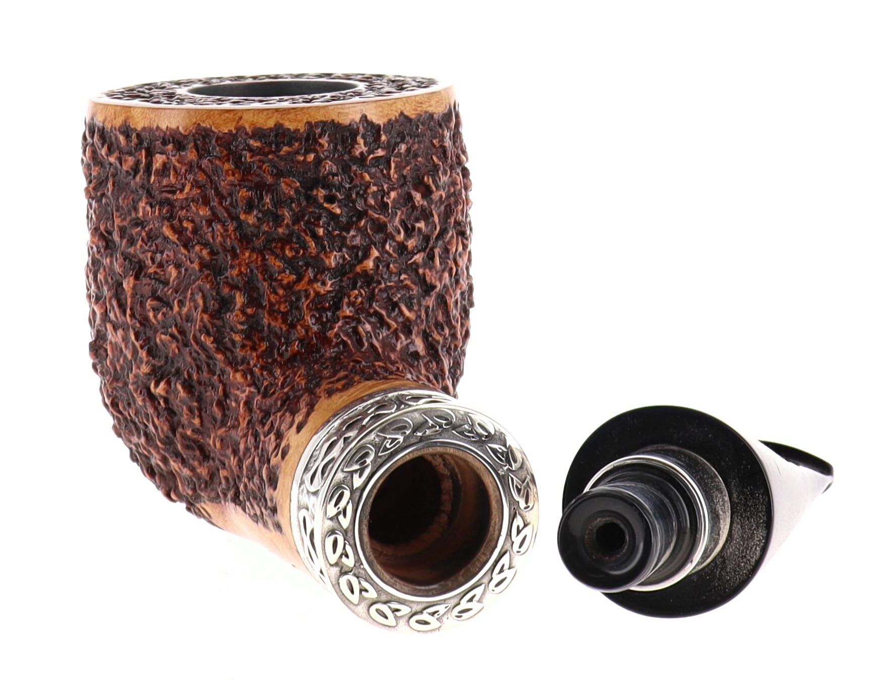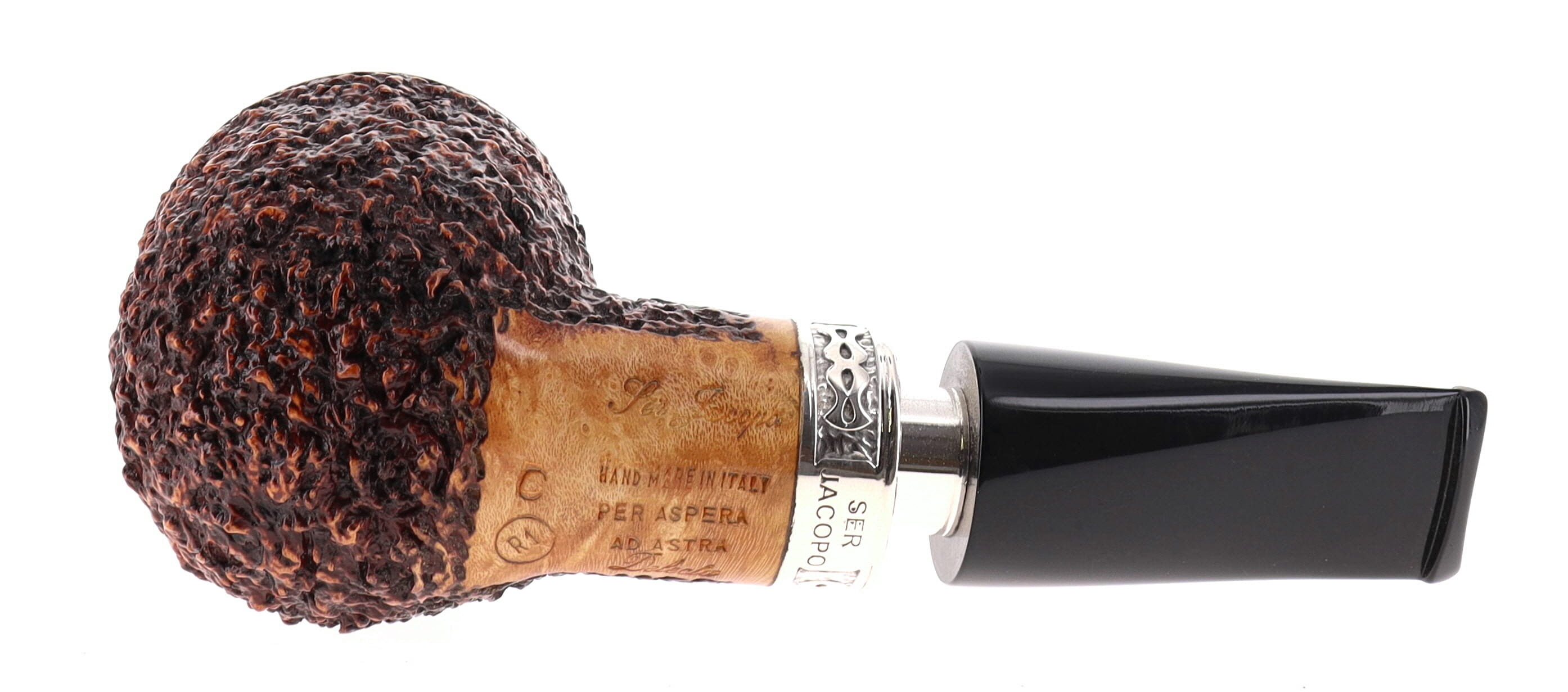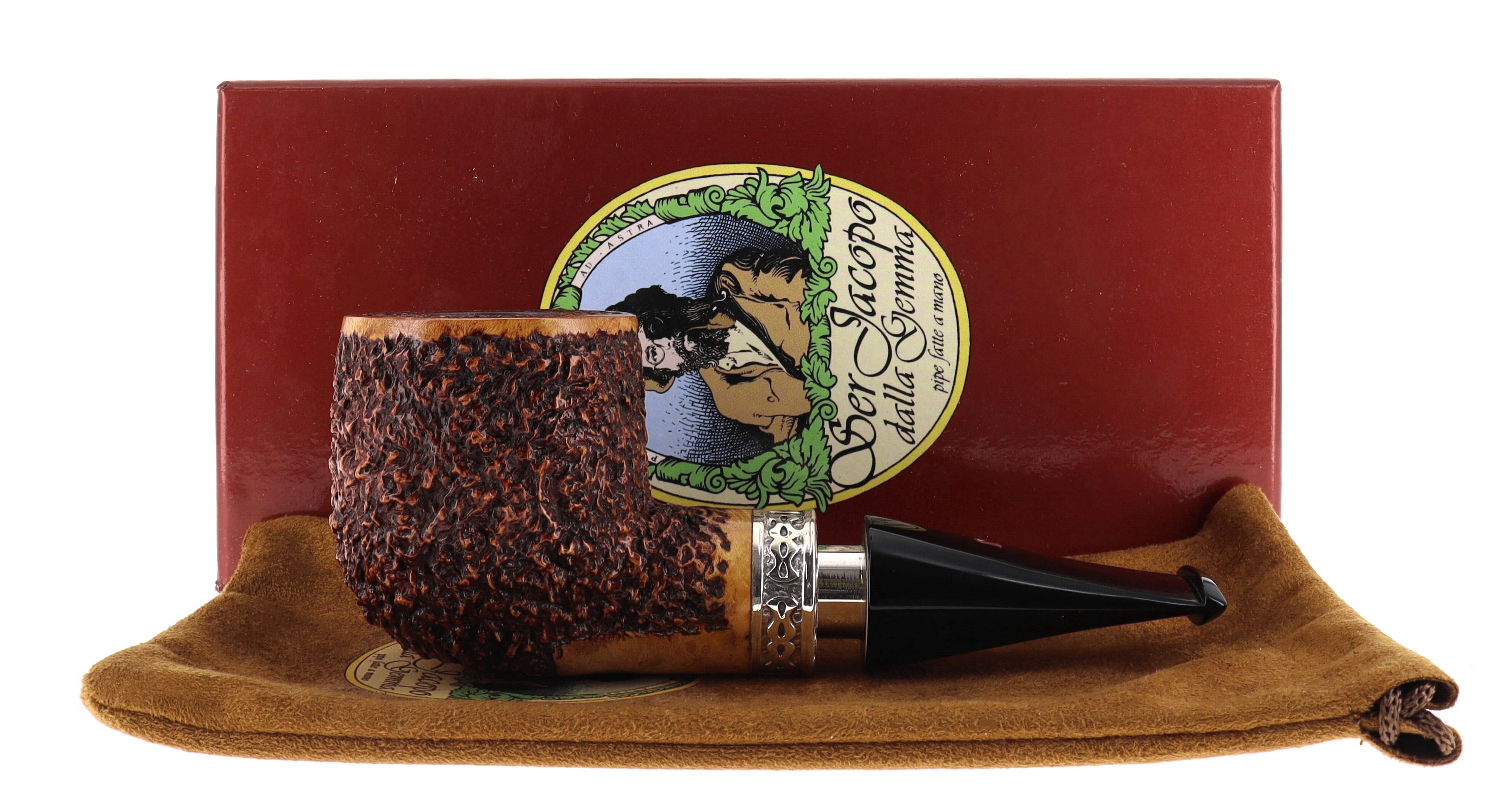 Pipe Ser Jacopo della Gemma 519 R1 C DELECTA, brown rusticated finishing, shape chubby billiard with silver ring, methacrylate mouthpiece with silver ring. In Original box with sock. Perfect, new, never smoked. Handmade in Italy.