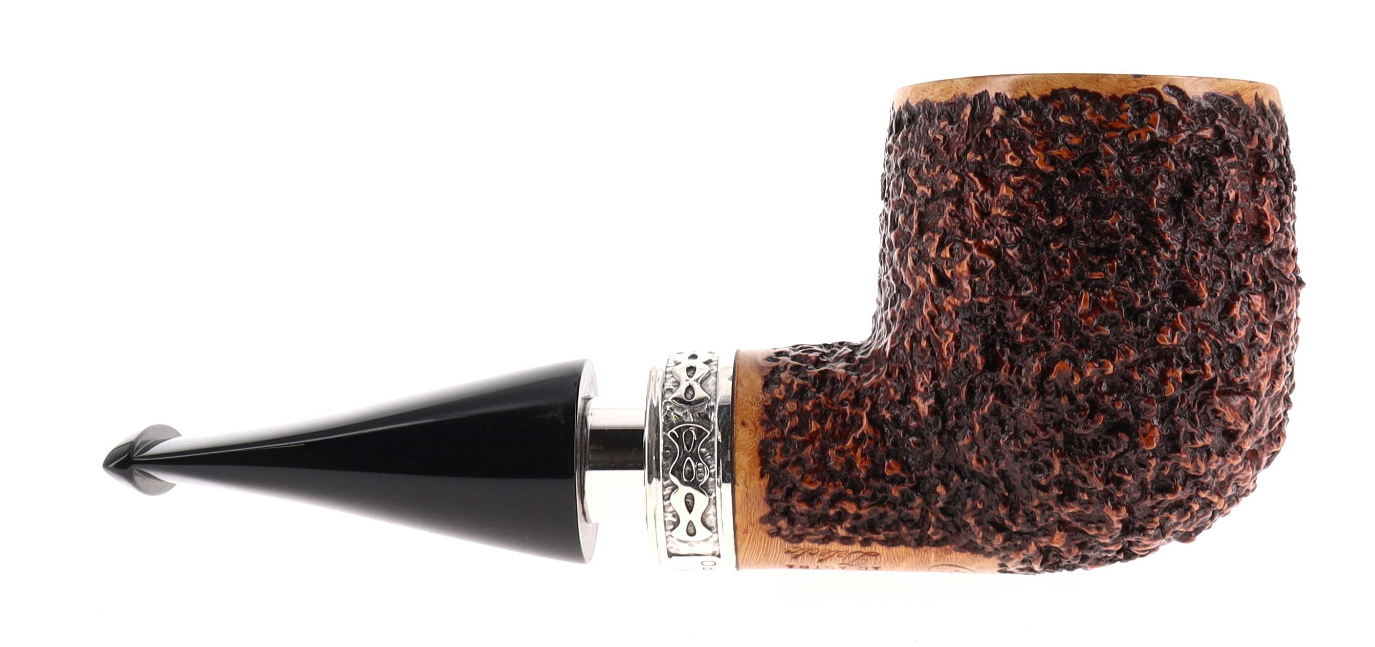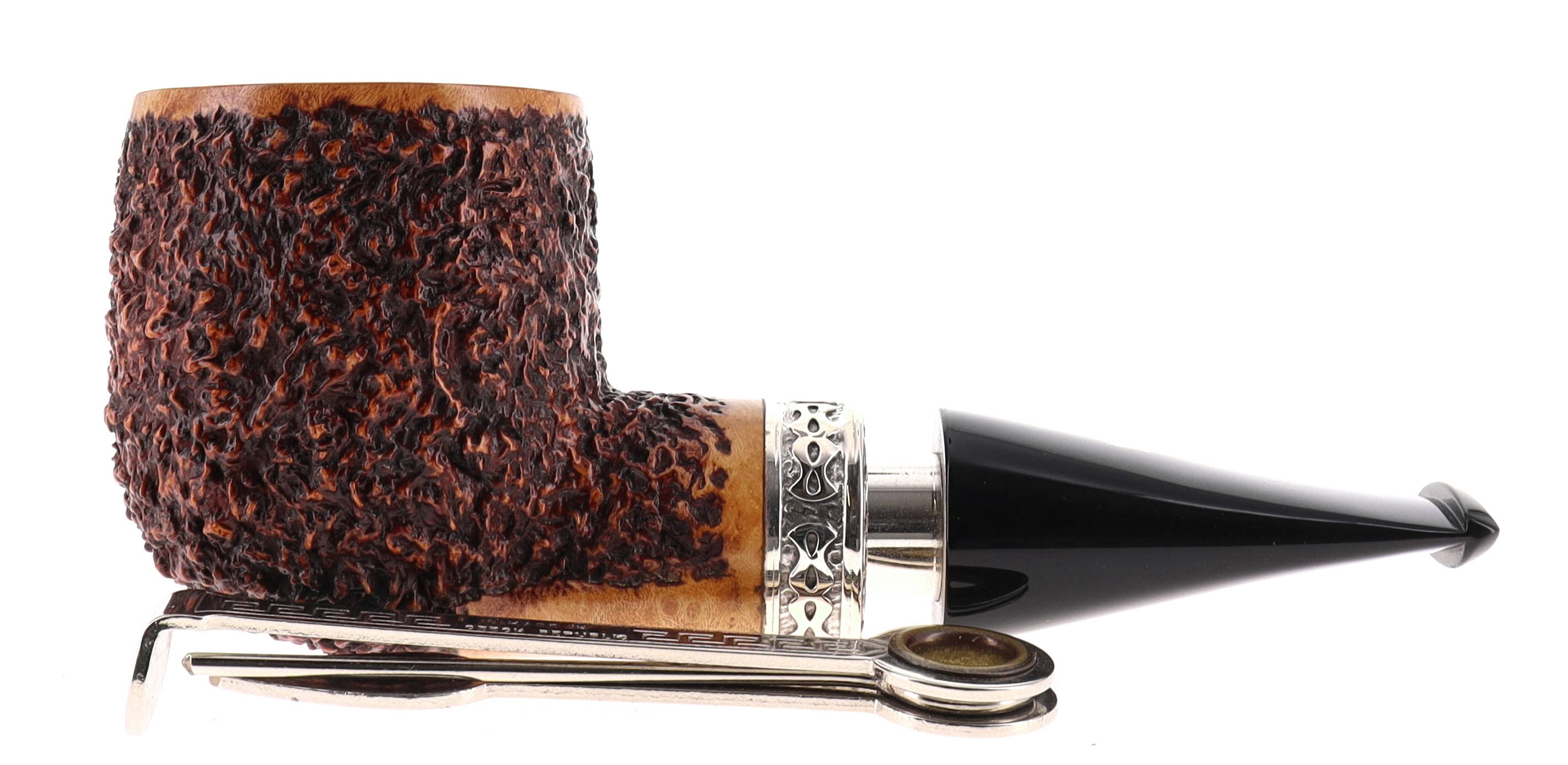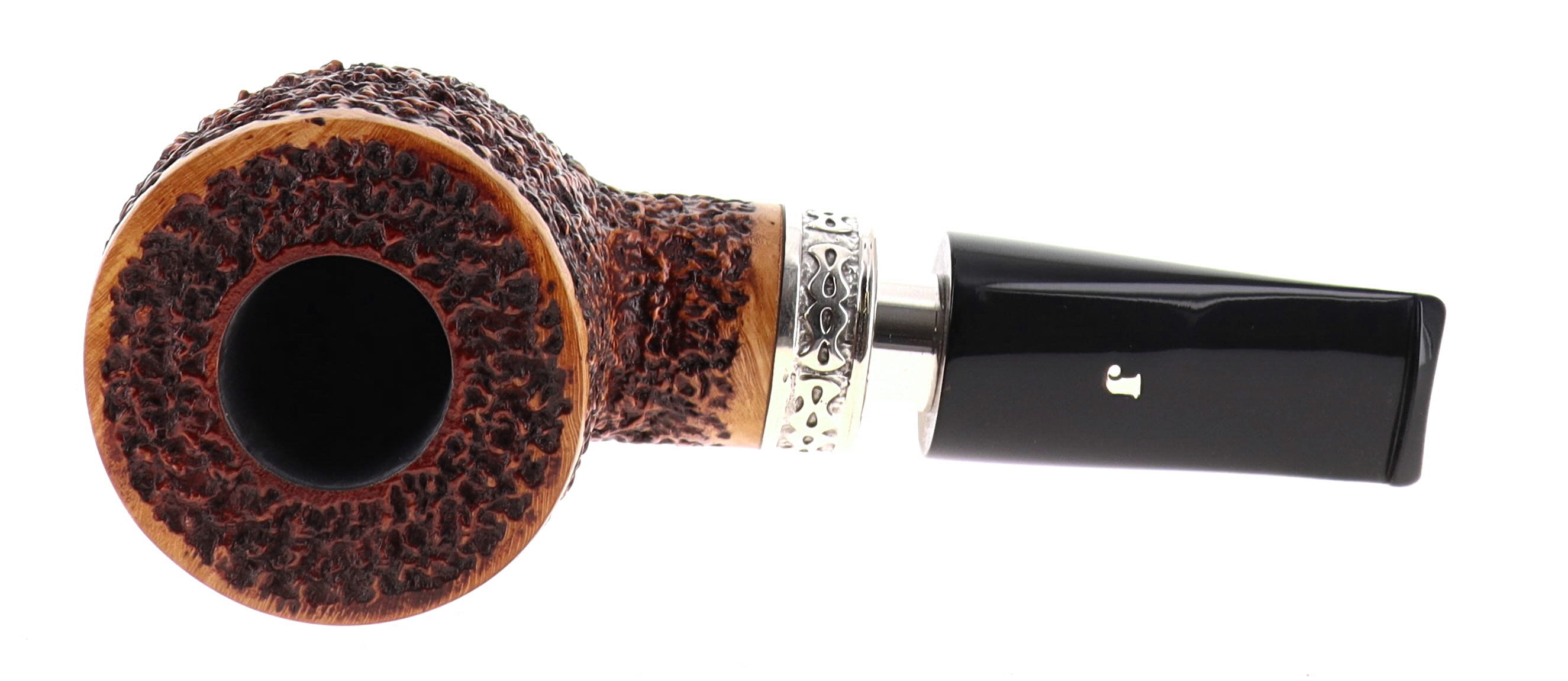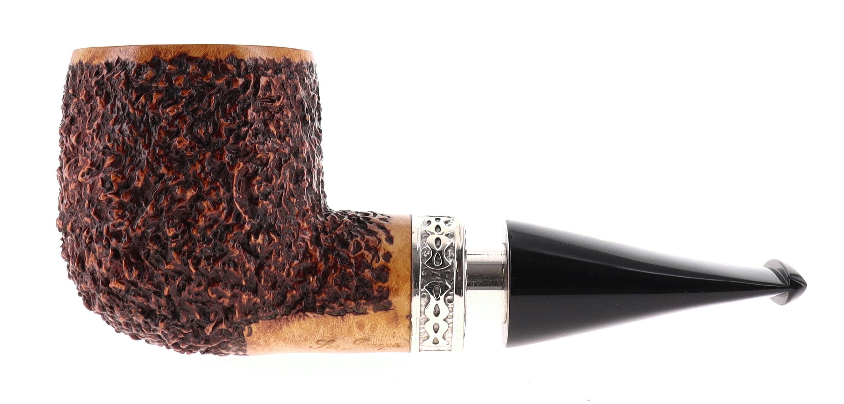 Pipe Ser Jacopo della Gemma 519 R1 C DELECTA, brown rusticated finishing, shape chubby billiard with silver ring, methacrylate mouthpiece with silver ring. In Original box with sock. Perfect, new, never smoked. Handmade in Italy.