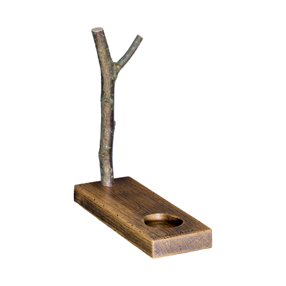 Functional and rustical rack. The holder for the stem is made of a real branch. The plate where the bowl stands on is made of real oak.