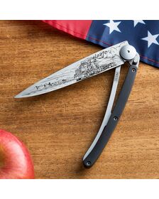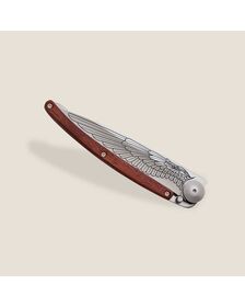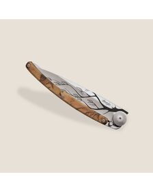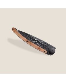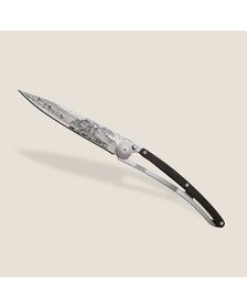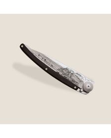 The ebony wood that adorns the handle of this Deejo knife is a true hymn to deep blacks. This exceptional woody species has the particularity of being practically insensitive to environmental humidity. It thus appears to be the most dense, resistant and precious there is, ideal for this magnificent cutlery.