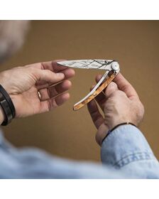 Like any knife, the blade edge of your Deejo knife will wear out over time. To maintain a perfect edge, you should sharpen your Deejo's blade regularly. We use Z40C13 type stainless steel, which is hard enough to maintain a perfect edge over time and soft enough to easily resharpen the knife. Your Deejo knife sharpens normally, using a stone, steel or sharpener. Just be careful not to damage the aesthetics of the blade while doing so.