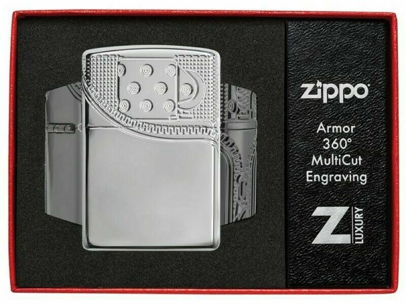 This windproof lighter comes to life with it's 360° MultiCut design wrapping around the lid and down the side of the Armor® High Polish Chrome lighter. Comes packaged in a gift box.