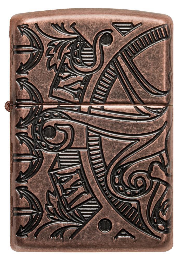 Wrapped around this Armor® Antique Copper lighter you'll find a 360-degree MultiCut nautical inspired design. The octopus design is surrounded by nautical pieces. The weathered look of Zippo's Armor® Antique Copper finish accentuates the design.