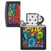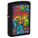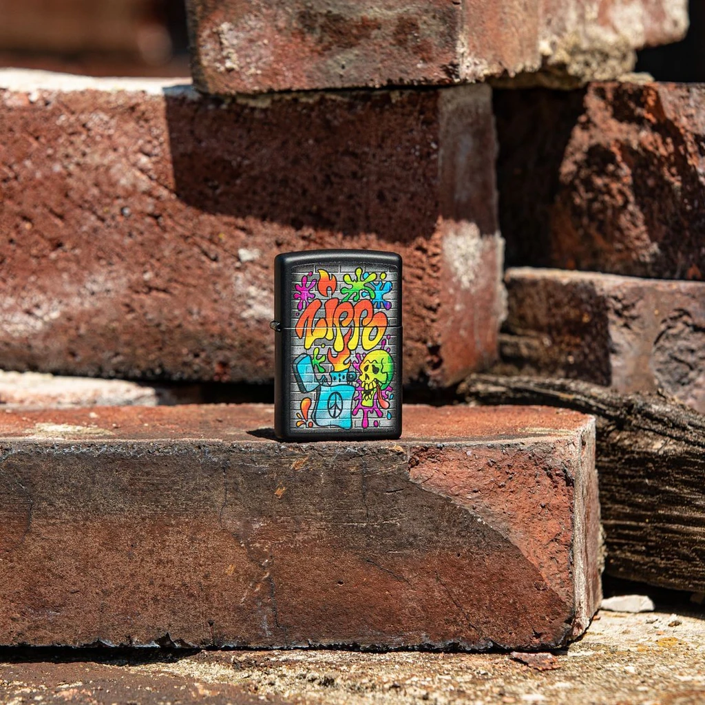 This Zippo design takes the art from the streets to a Black Matte lighter. This Zippo Street Art design is created using the color imaging process and features colorful Zippo-themed graffiti on a stone wall. This stone canvas shows the iconic Zippo windproof lighter, the Zippo logo, and a skull with a mass of vivid paint splats.