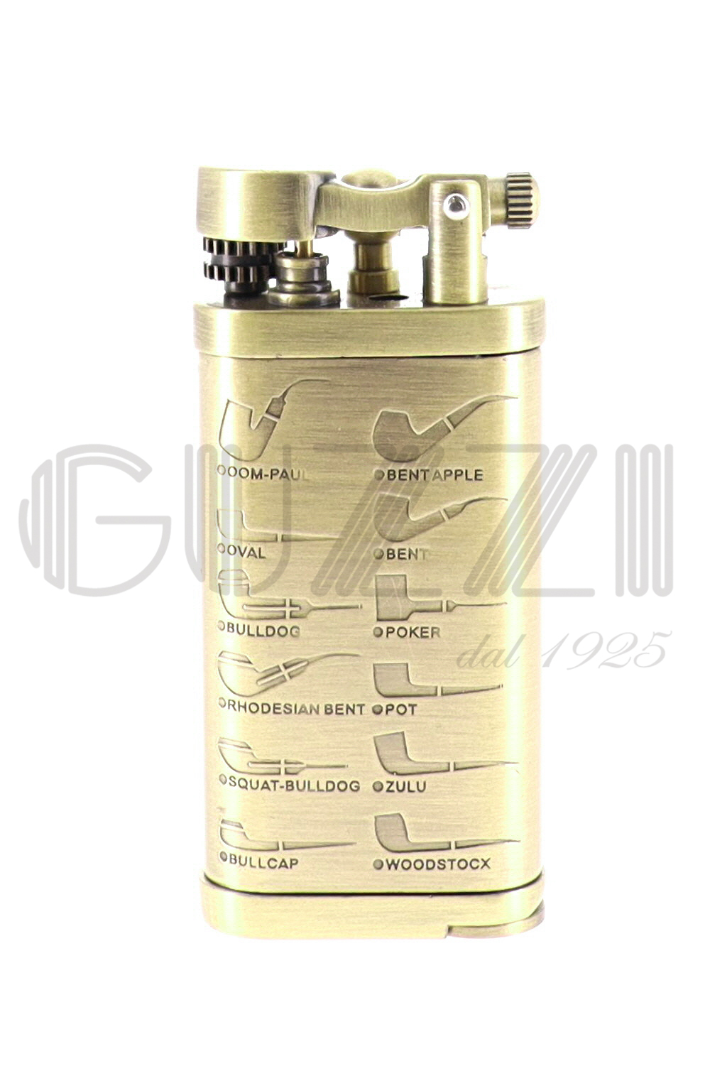 Finitura antique con incise sul fronte e sul retro alcune delle piu famose forme di pipe.