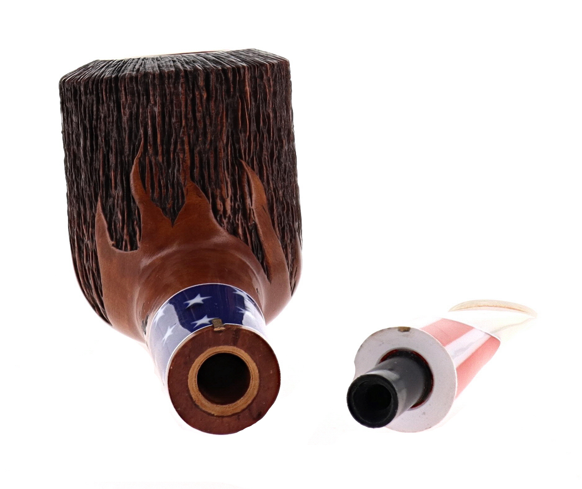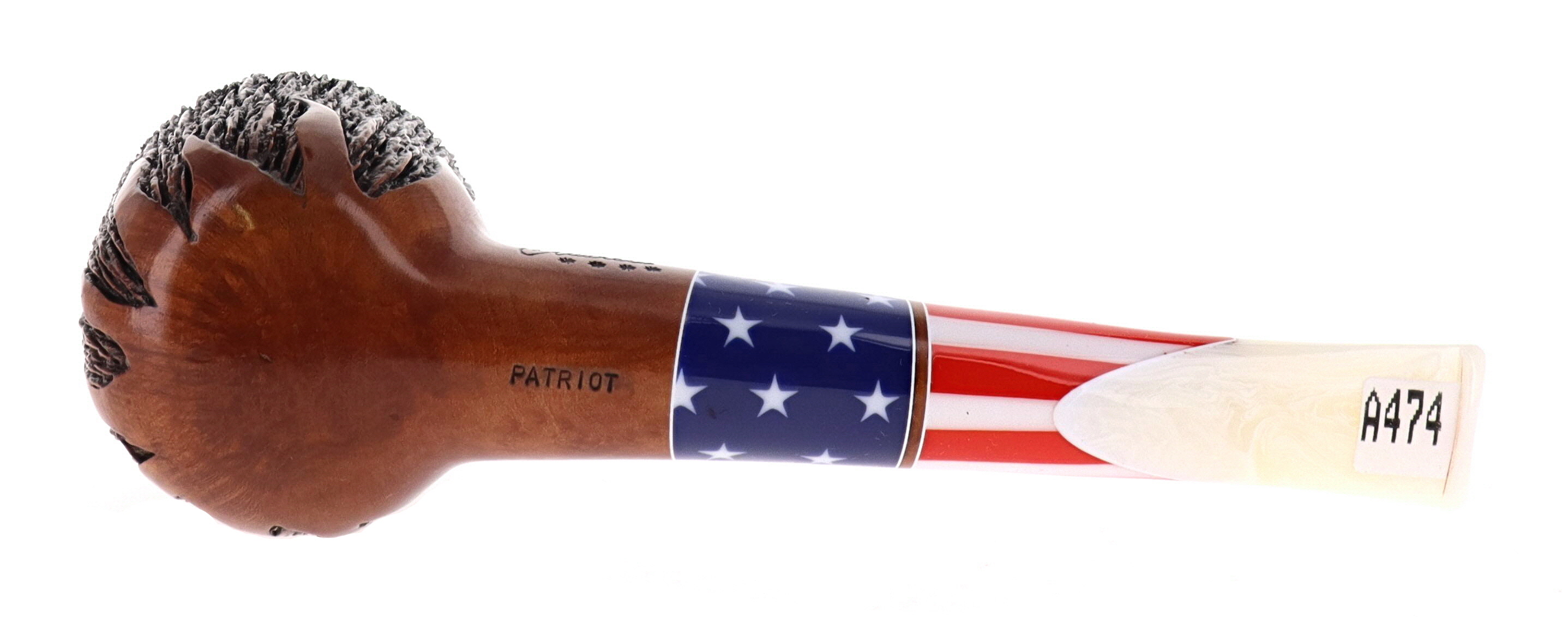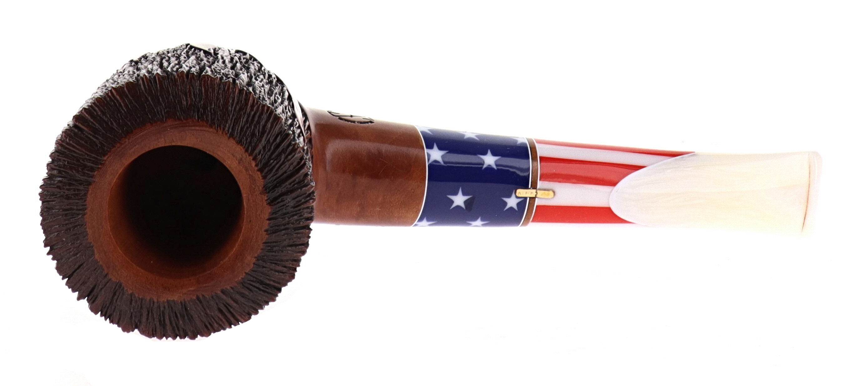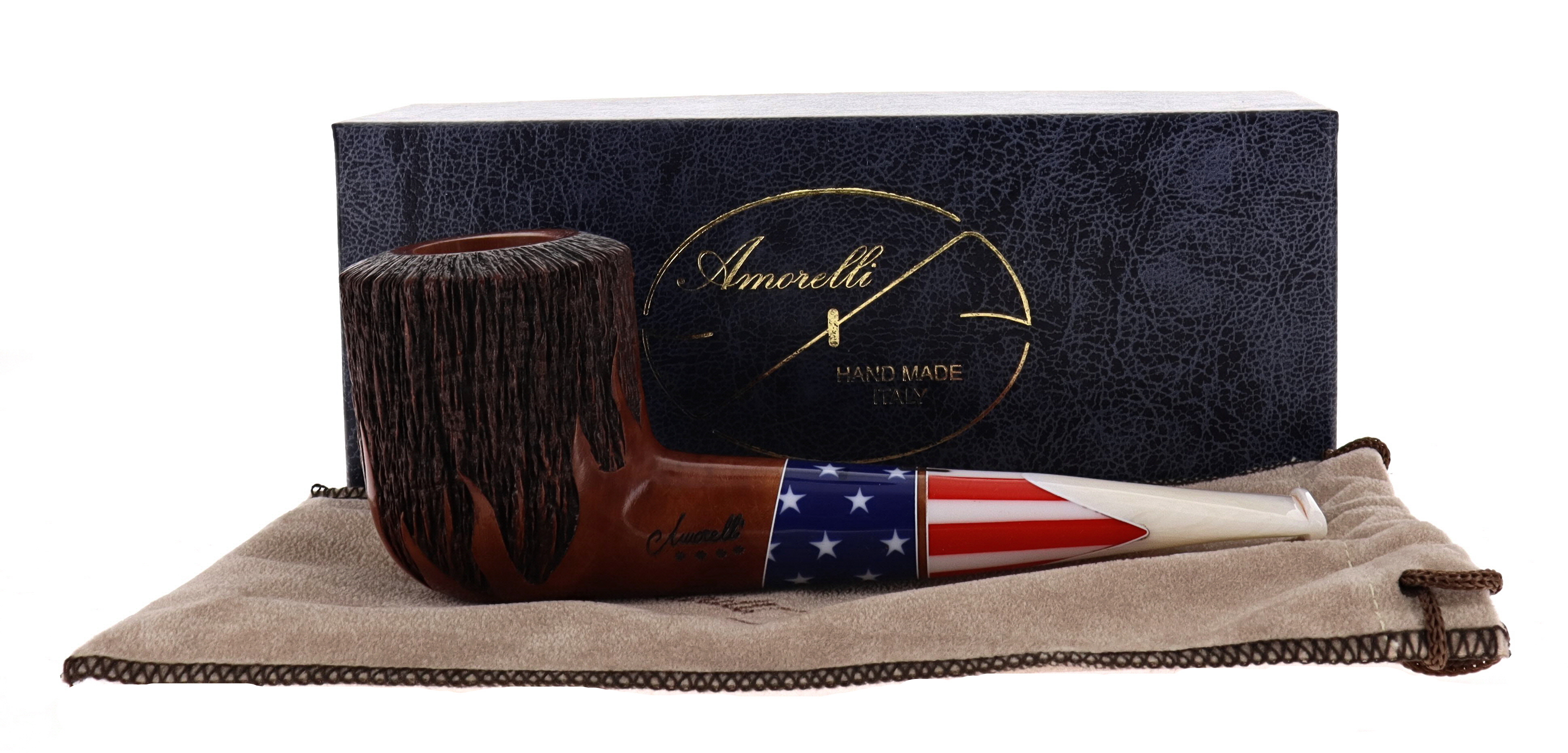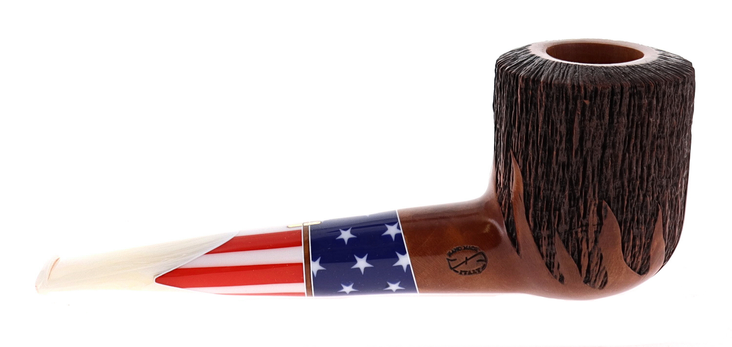 Pipa Amorelli 265 **** 4 STELLE PATRIOT PENNA DI SAN MICHELE, finissaggio parzialmente penna di San Michele, shape stand billiard, bocchino in metacrilato bandiera USA. Nuova, mai fumata. In scatola originale.