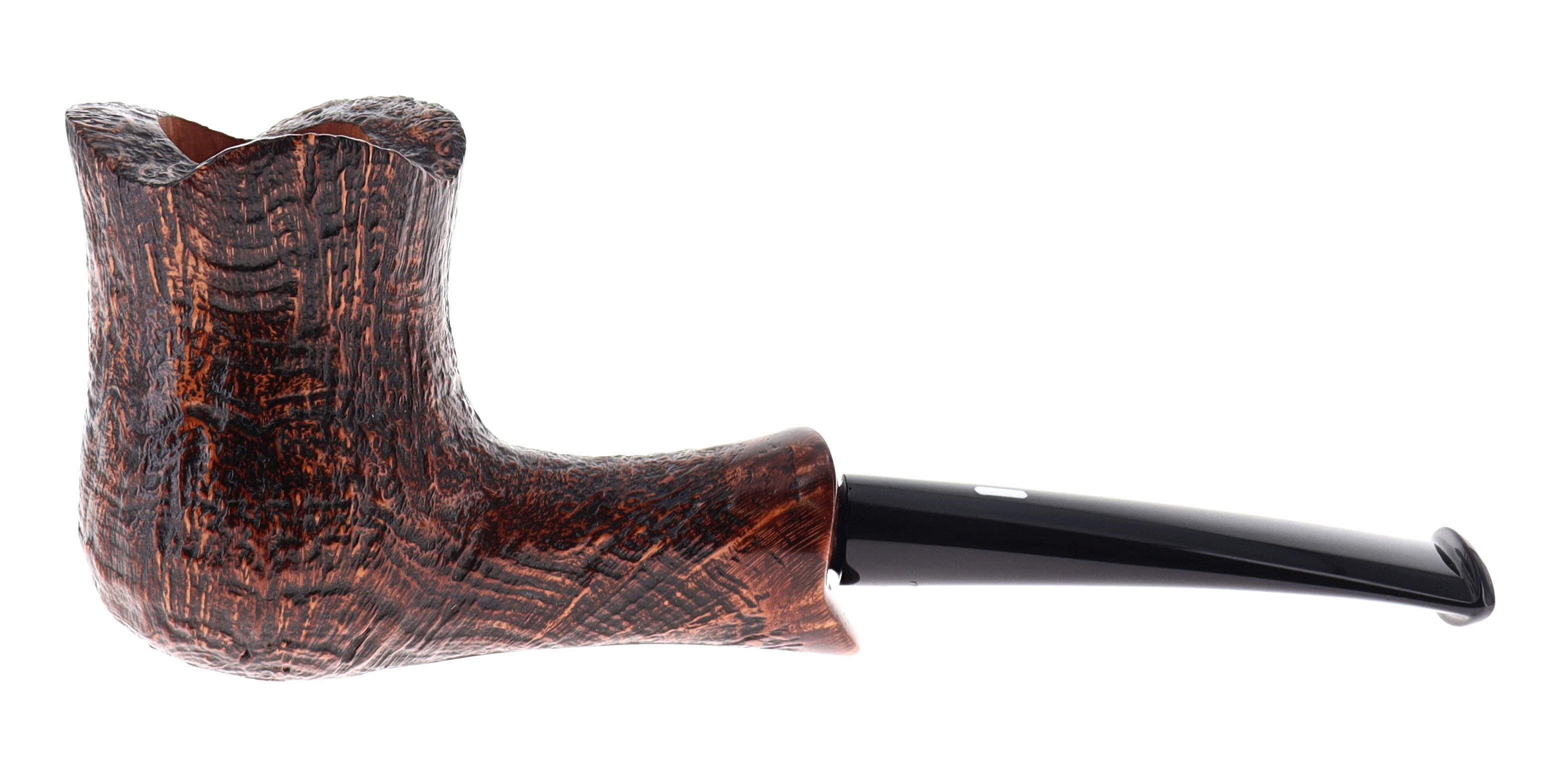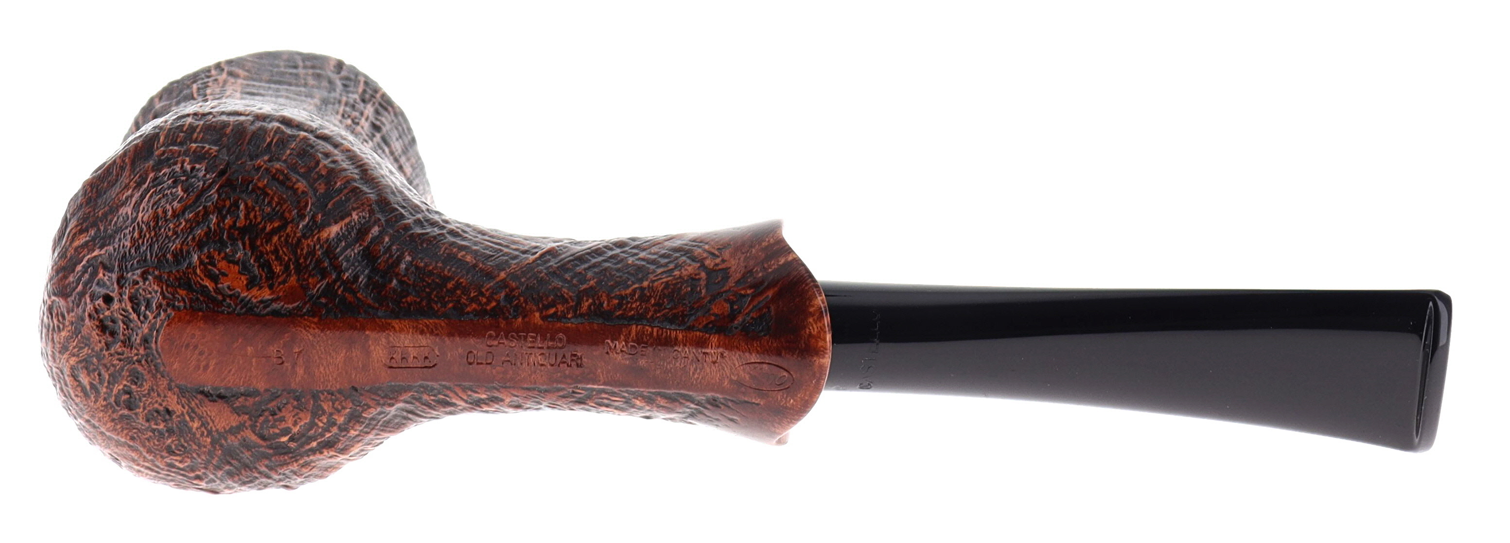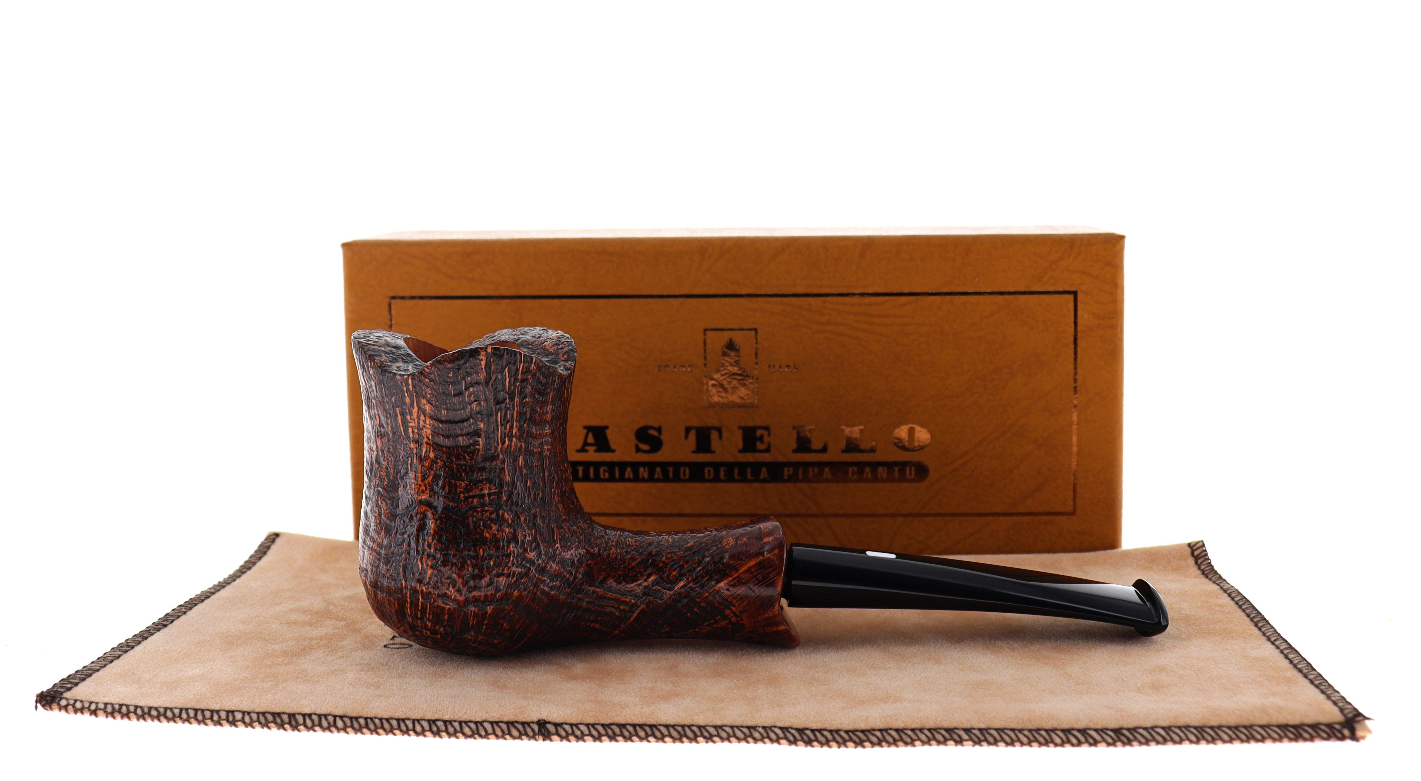 Pipa CASTELLO 0902 OLD ANTIQUARI KKKK, finissaggio sabbiato marrone, shape 215 freehand fancy semicurva, bocchino in metacrilato. In Scatola Originale con sacchetto di panno. Perfetta, nuova, mai fumata. Hand Made dal 1947.