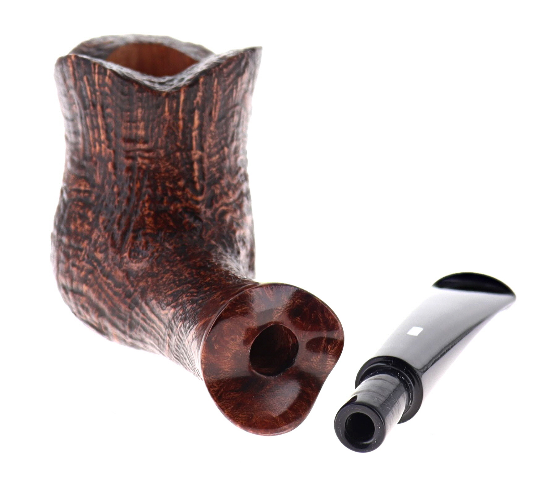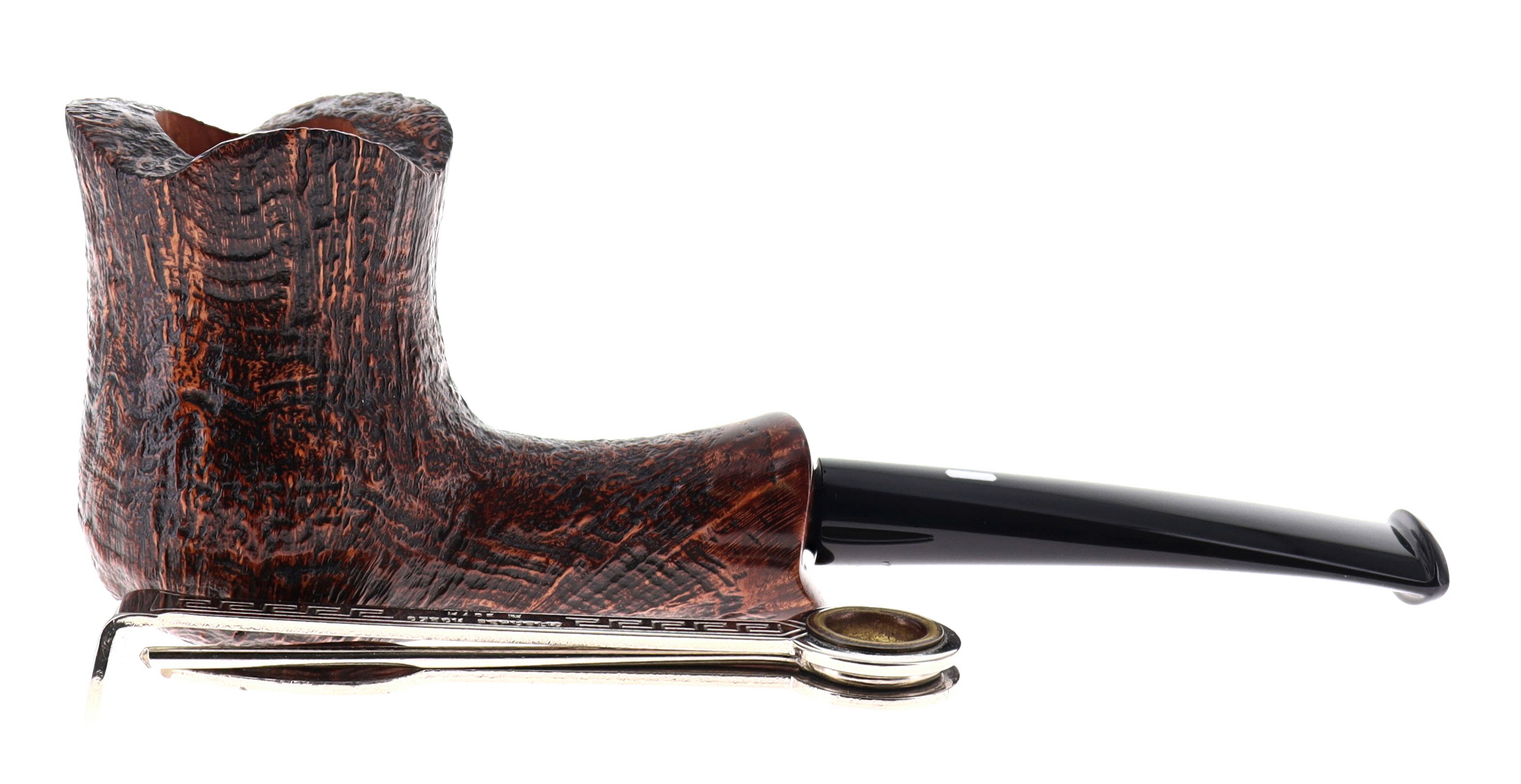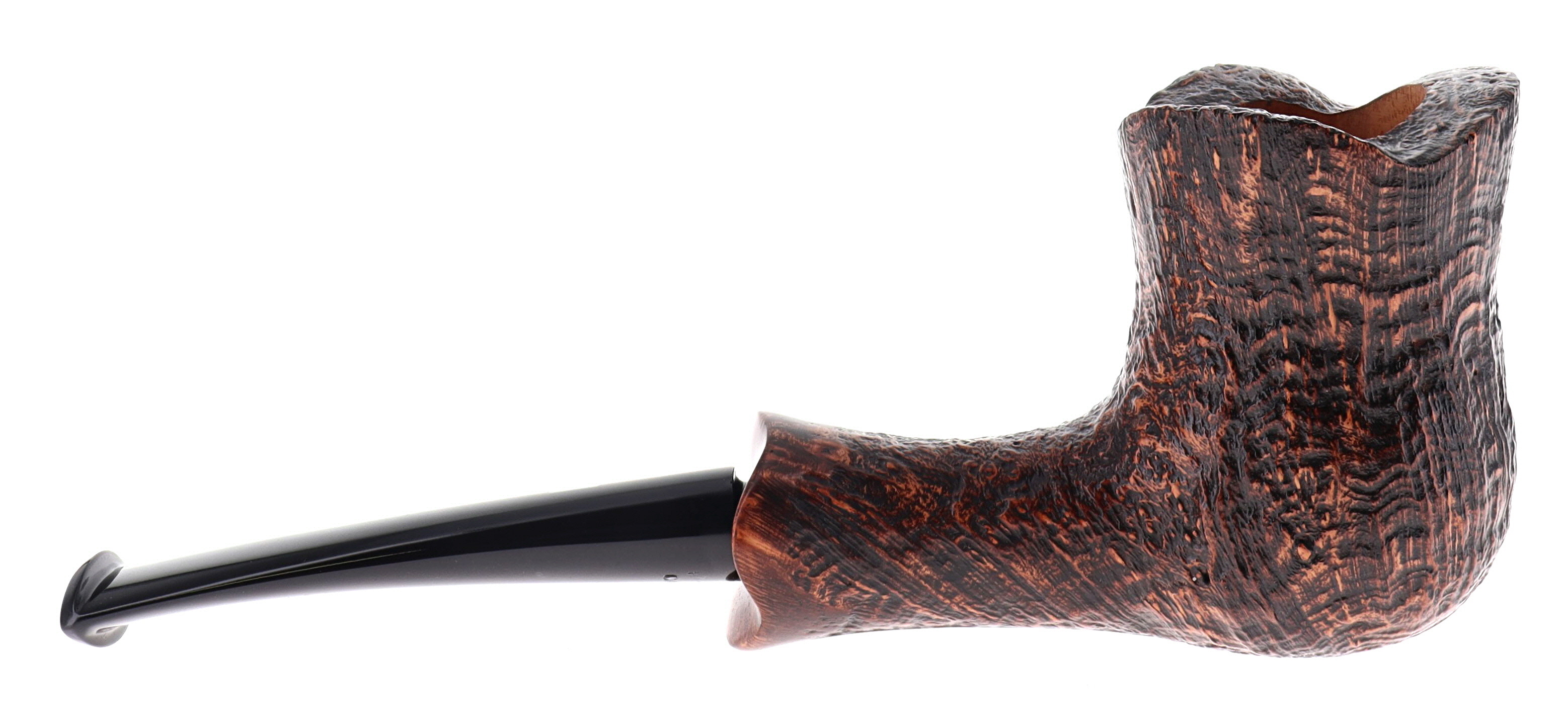 Pipa CASTELLO 0902 OLD ANTIQUARI KKKK, finissaggio sabbiato marrone, shape 215 freehand fancy semicurva, bocchino in metacrilato. In Scatola Originale con sacchetto di panno. Perfetta, nuova, mai fumata. Hand Made dal 1947.