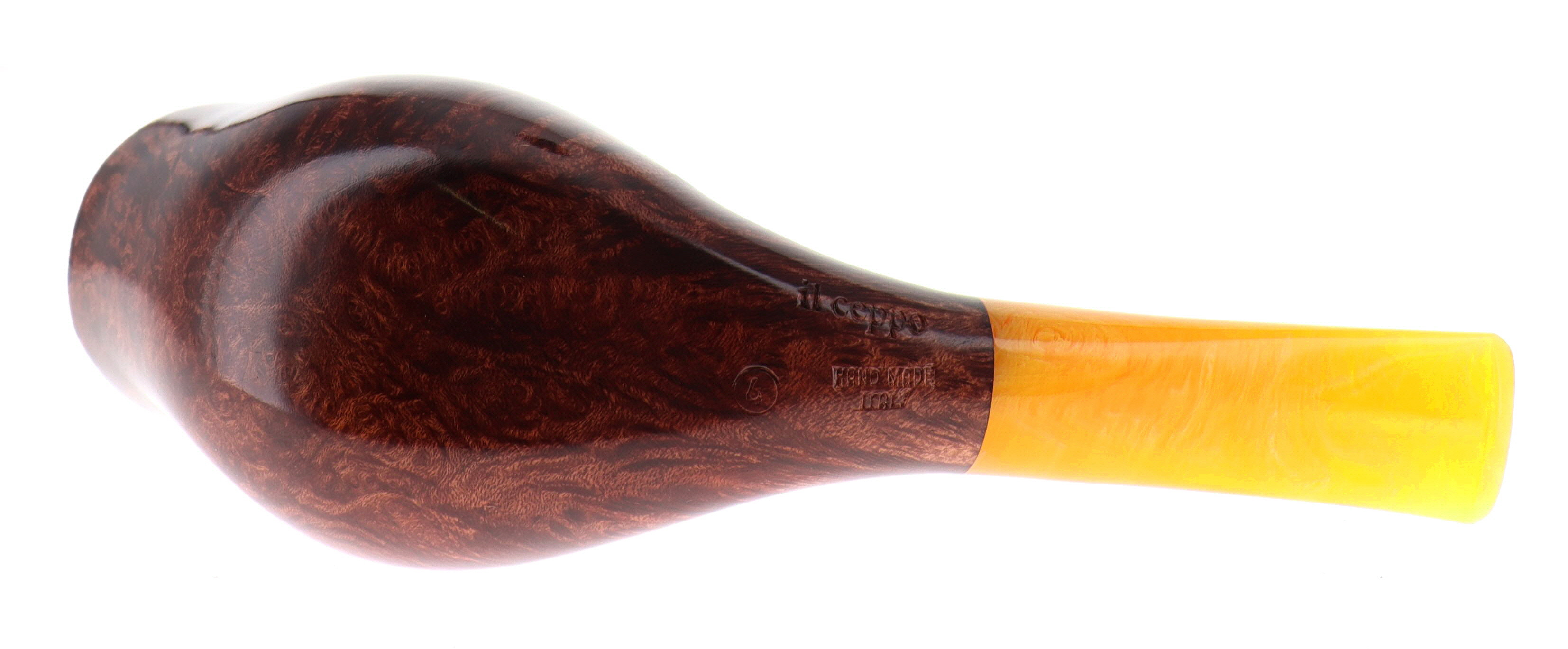 Pipa Il Ceppo 184 GRUPPO 4, finissaggio liscio marrone, shape stand up oliphant, bocchino in metacrilato. In Scatola Originale con sacchetto di panno. Perfetta, nuova, mai fumata. Fatta a mano a Pesaro da Franco Rossi.