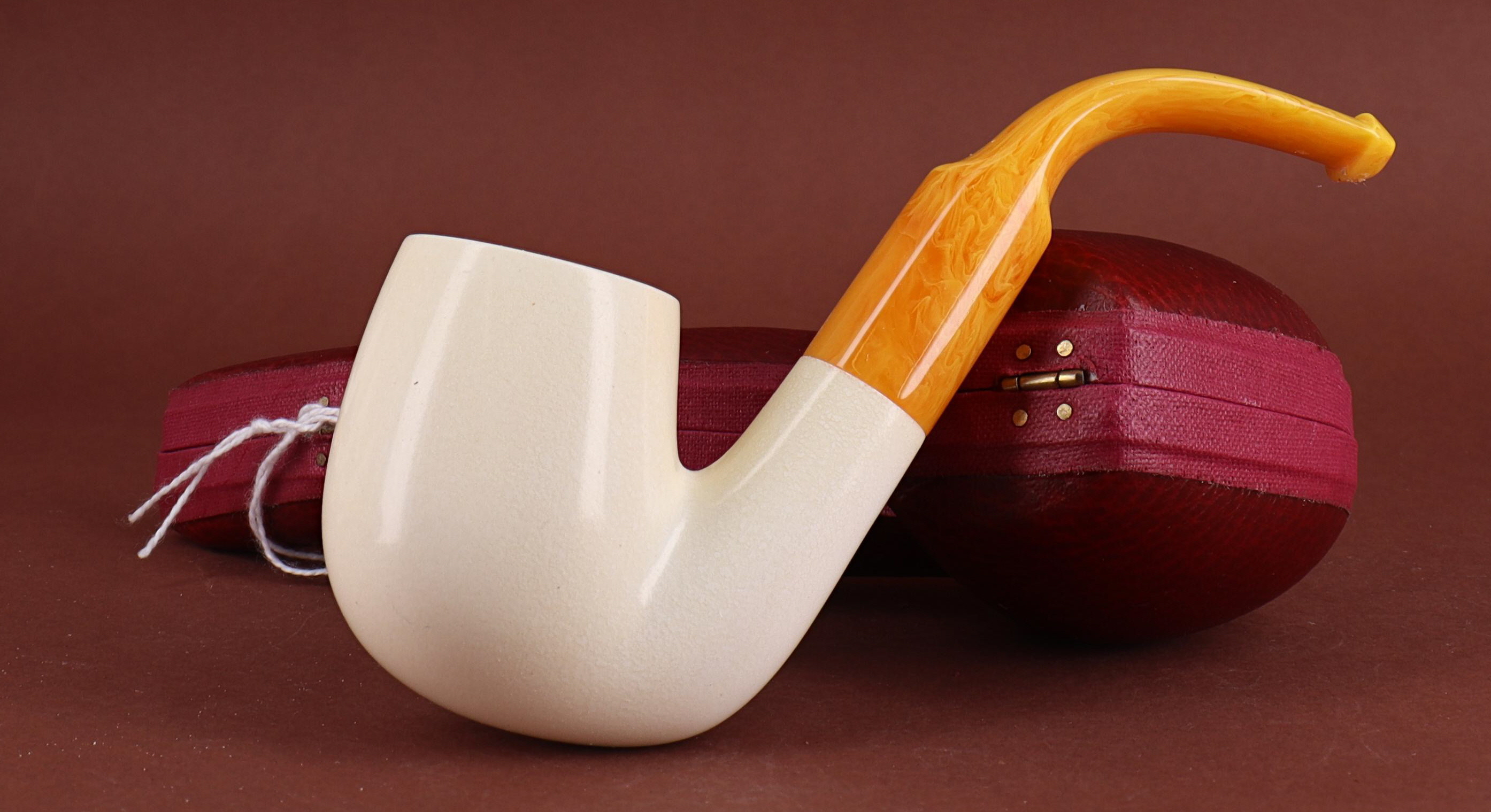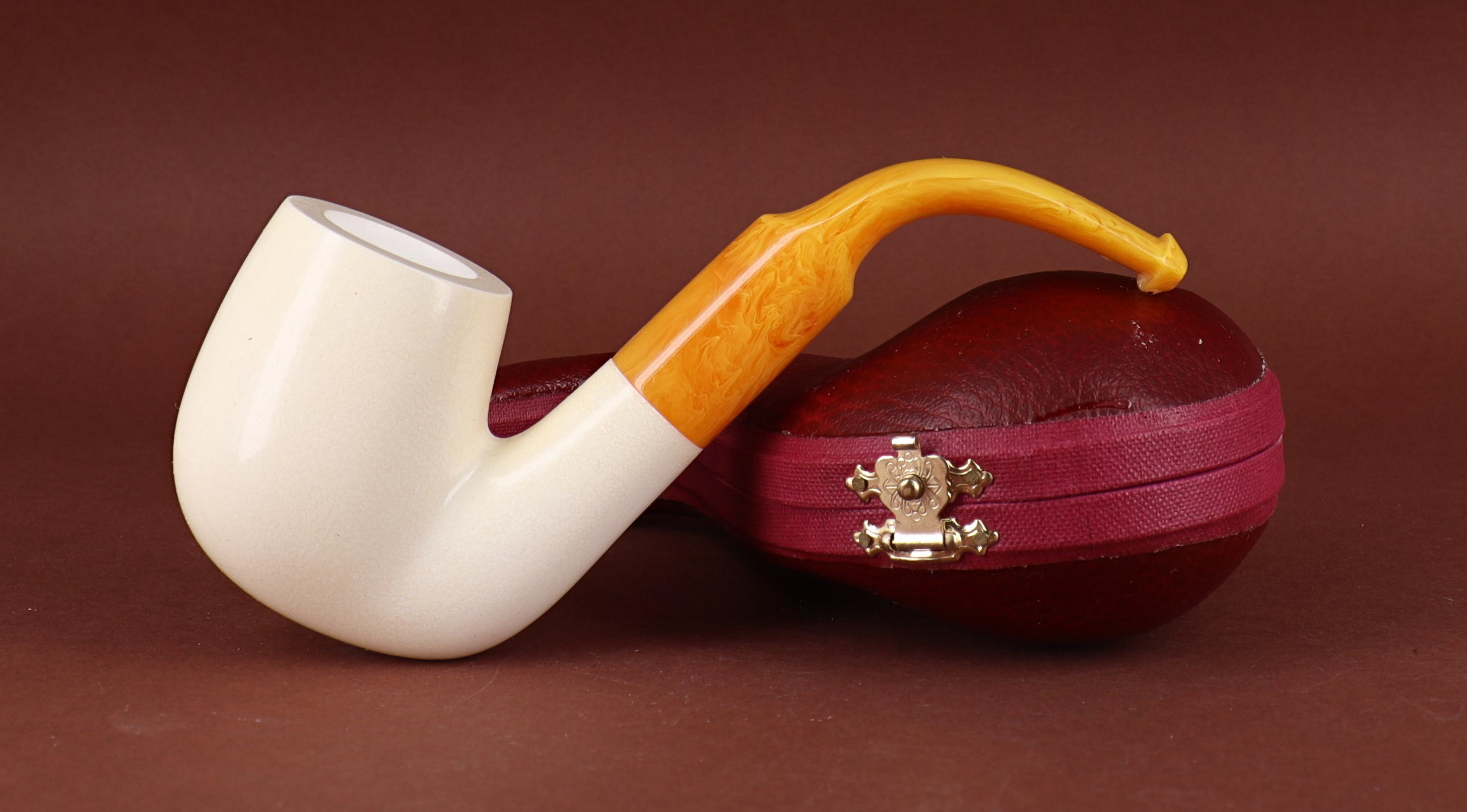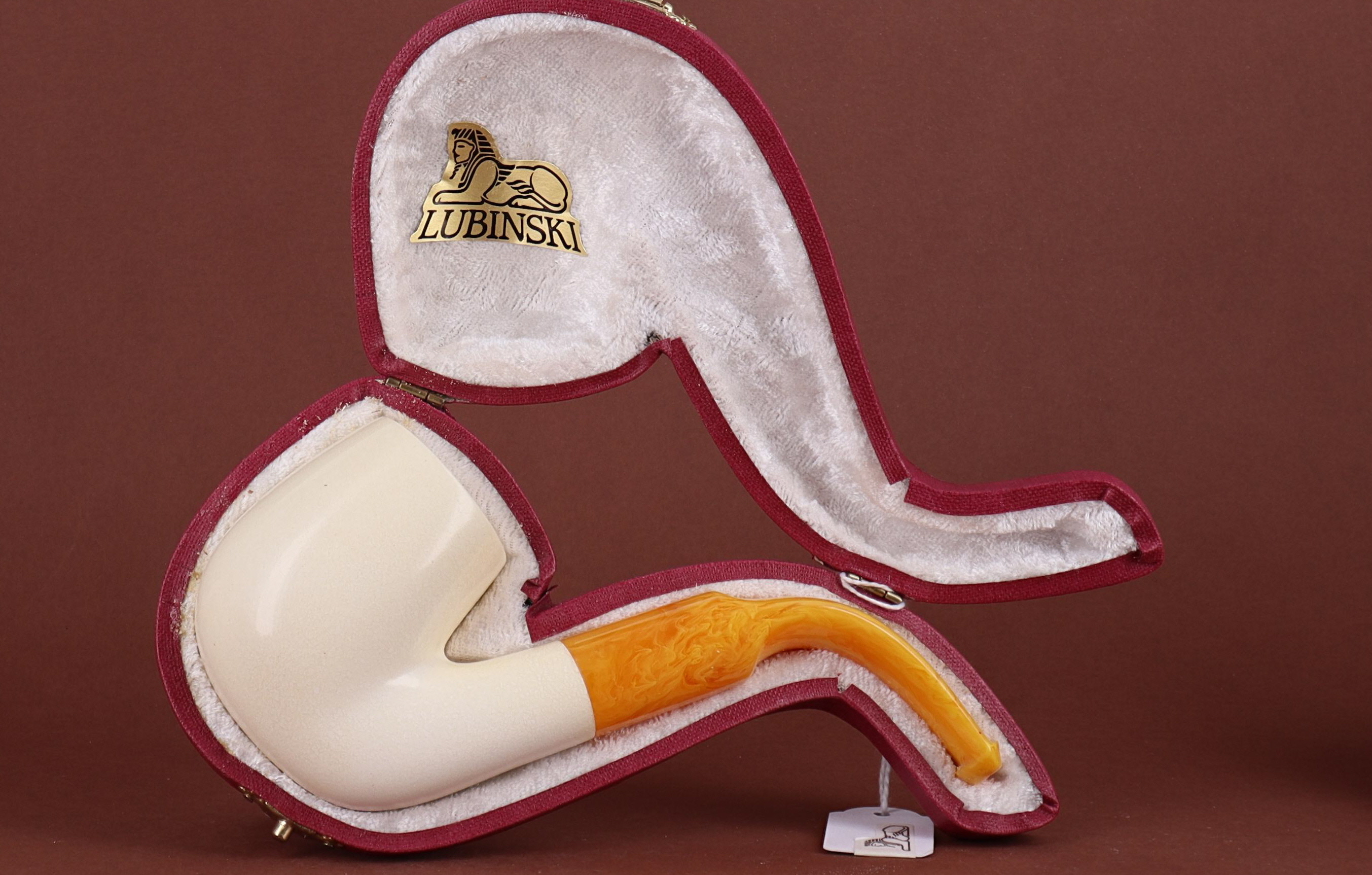 Pipa Lubinski in schiuma di mare Lubinski 105 GRUPPO 7 LISCIA, finissaggio liscio, shape hungarian oom paul, bocchino in metacrilato giallo. Nuova, mai fumata. Il catalogo Lubinski propone pipe di schiuma, esclusivamente turche di blocco, realizzate in esclusiva su disegno dai fratelli Sekergioglu di Eskisehir.