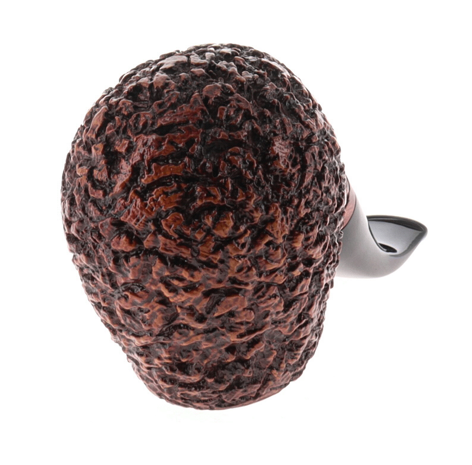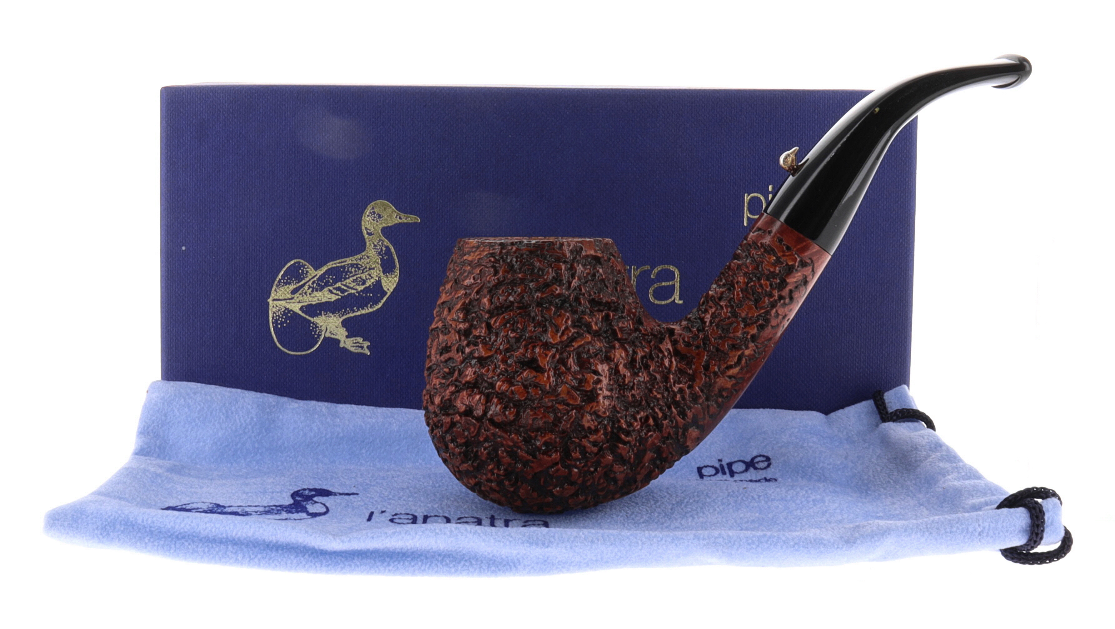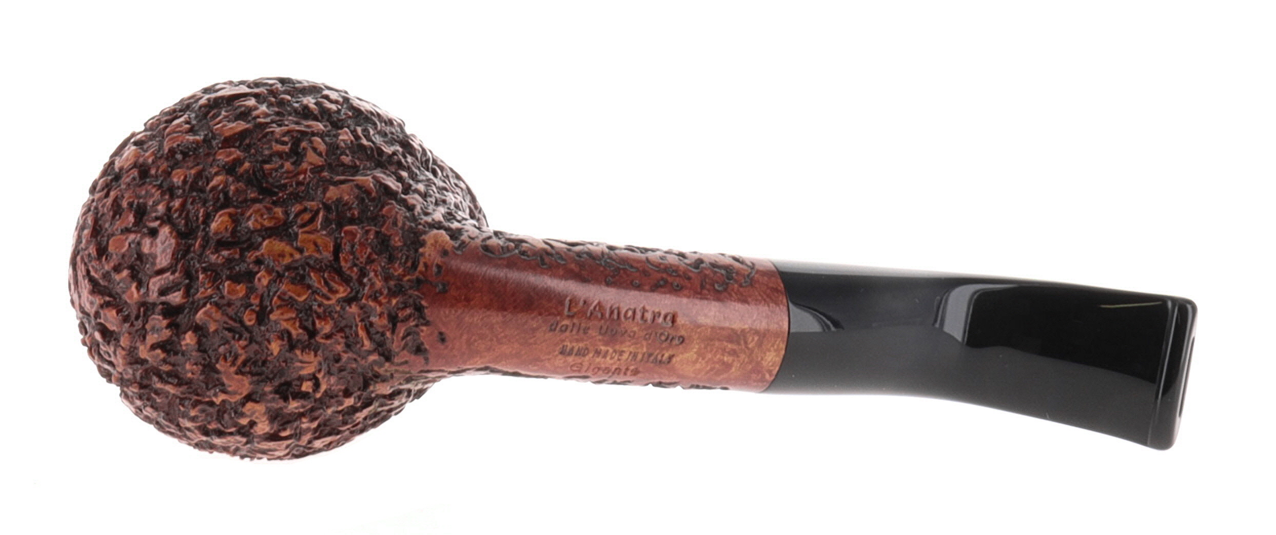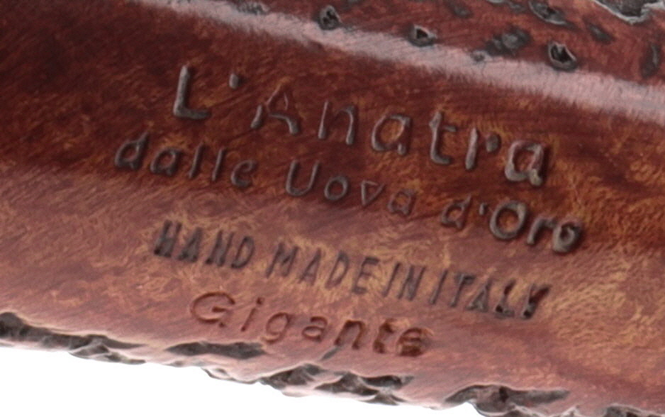 Pipa L'Anatra dalle Uova d'Oro 234 RUSTICATO GIGANTE, finissaggio rusticato marrone, shape bent egg, bocchino in metacrilato. Artigianale Made in Italy. Pezzo unico. In scatola originale con sacchetto di panno. Perfetta, nuova, mai fumata.
