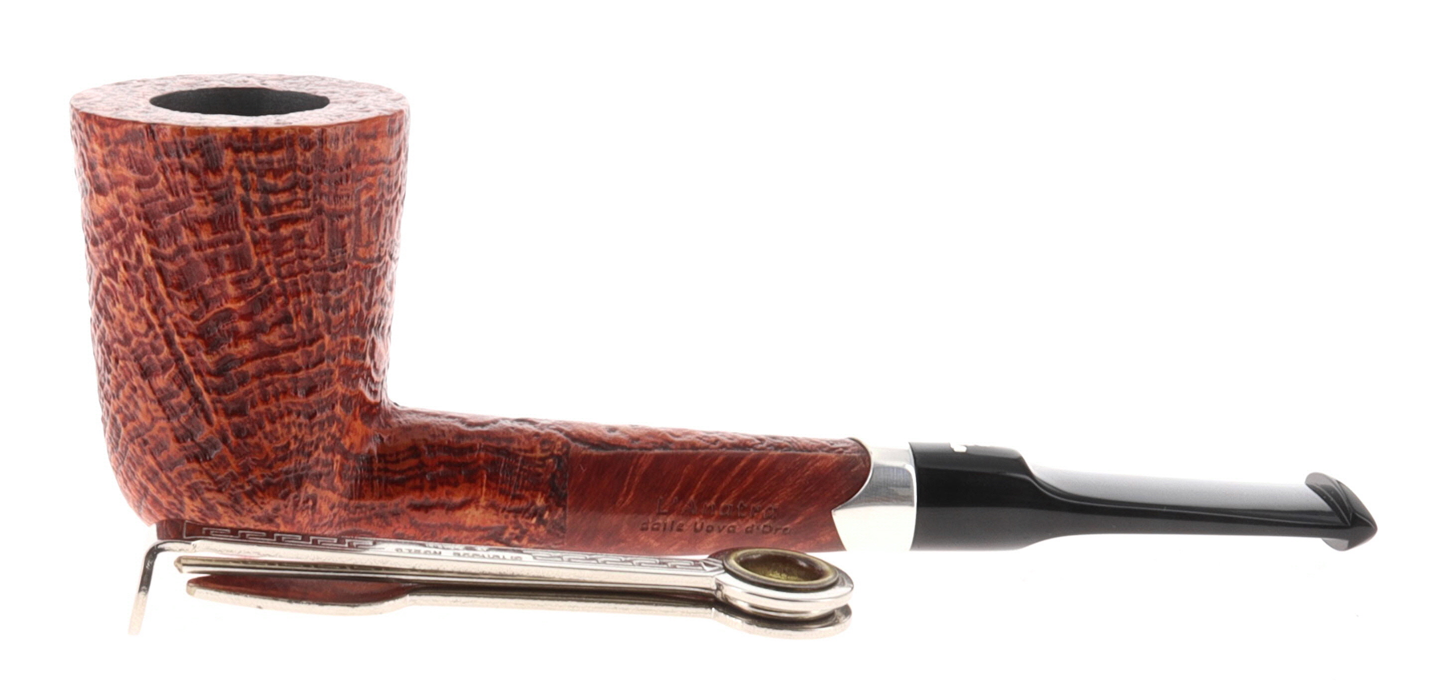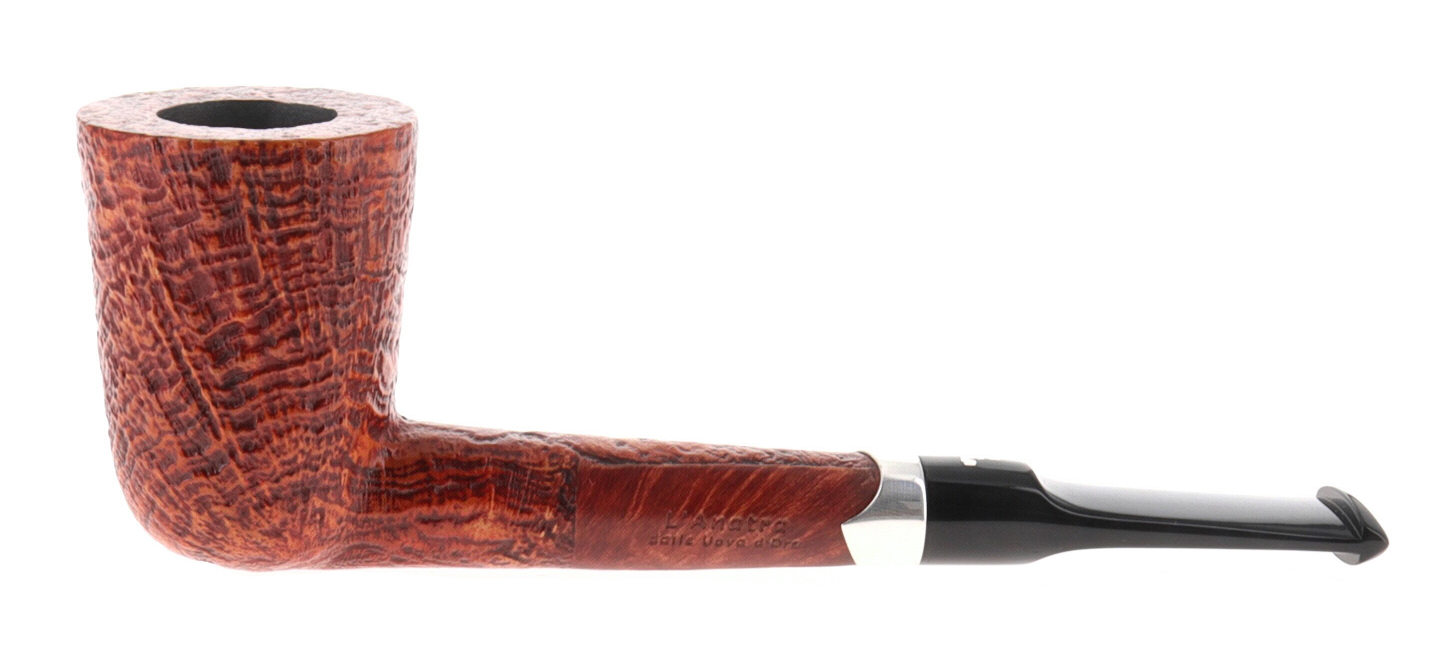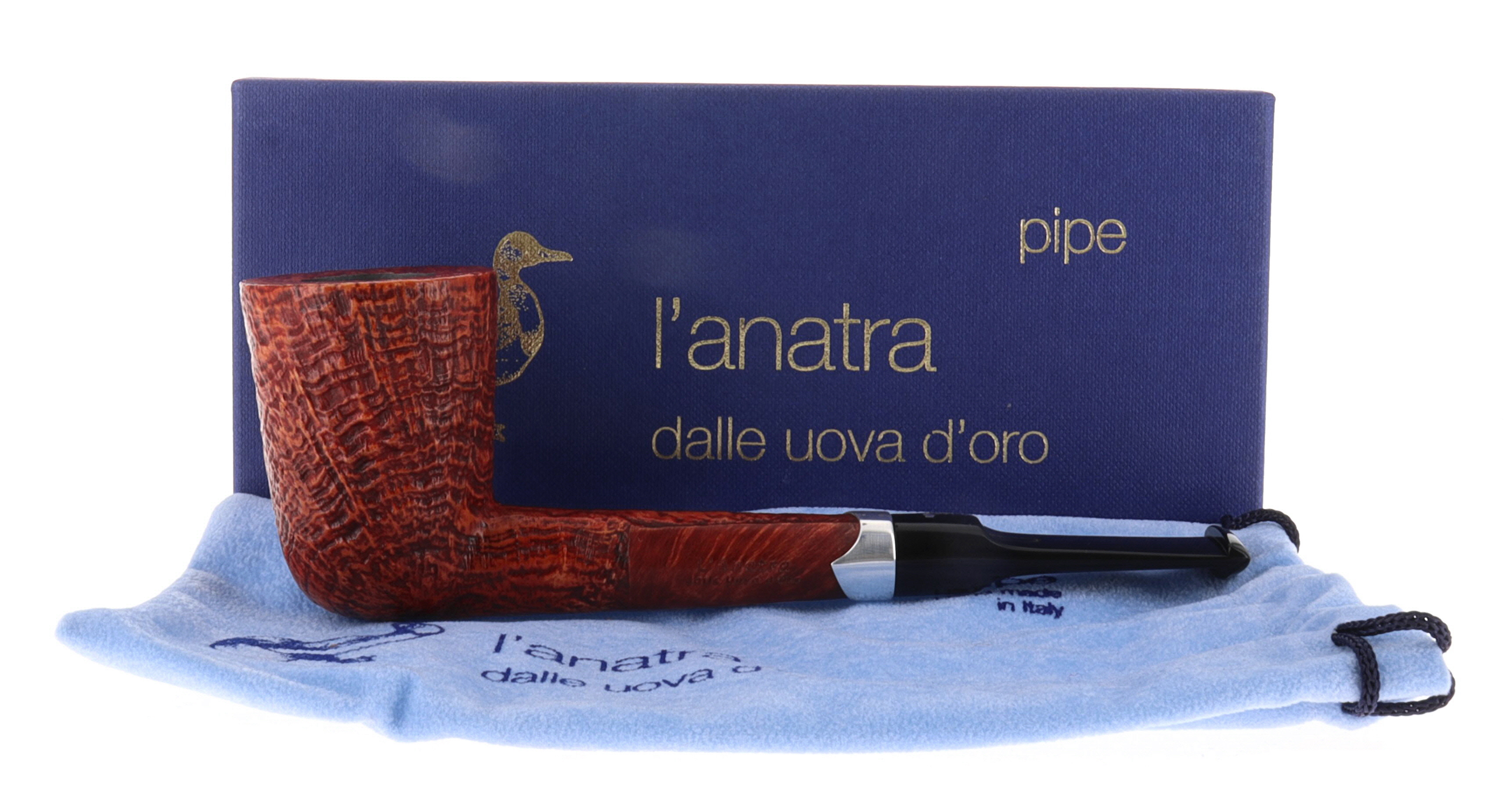 Pipa L'Anatra dalle Uova d'Oro 231 SABBIATA, finissaggio sabbiato marrone, shape straight chimney dublin con vera in argento, bocchino in metacrilato. Artigianale Made in Italy. Pezzo unico. In scatola originale con sacchetto di panno. Perfetta, nuova, mai fumata.