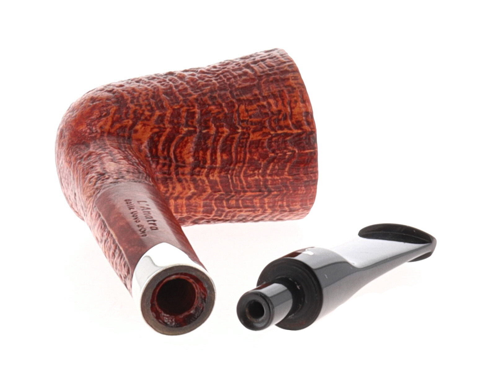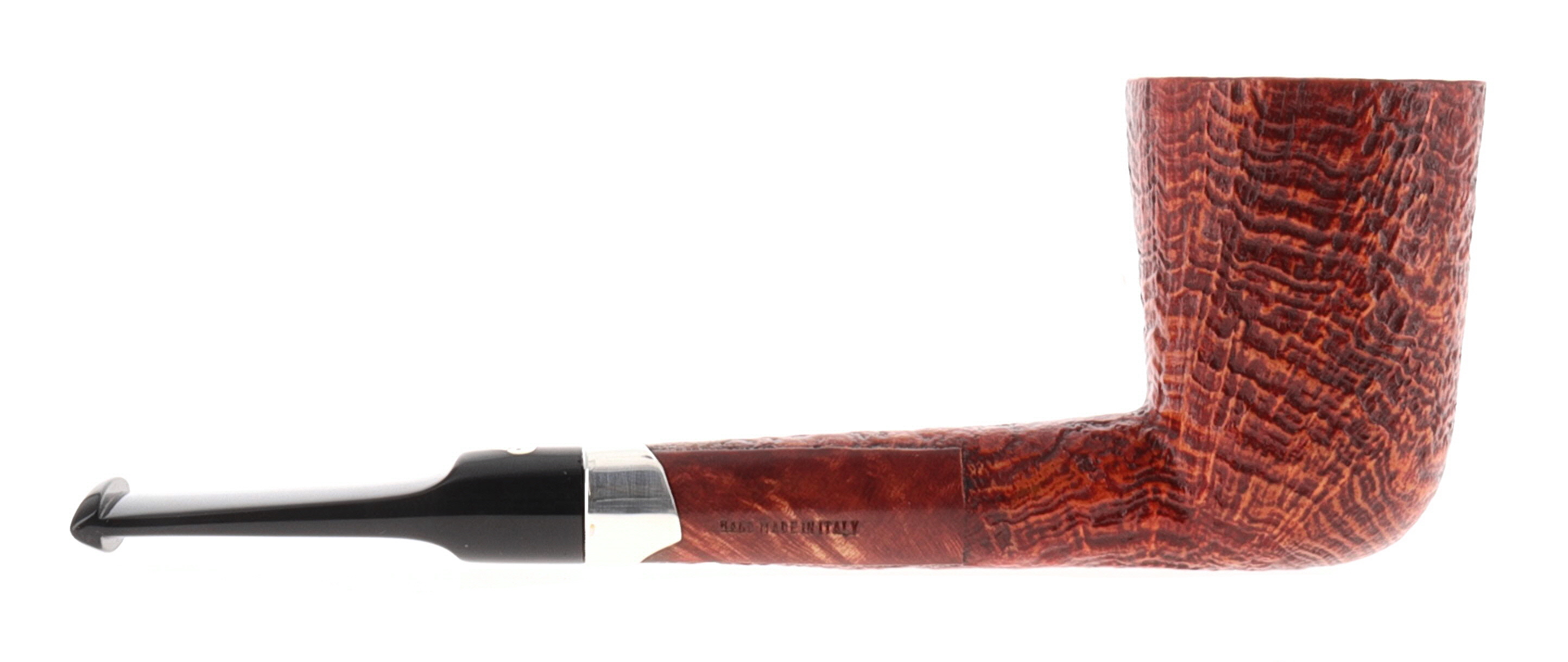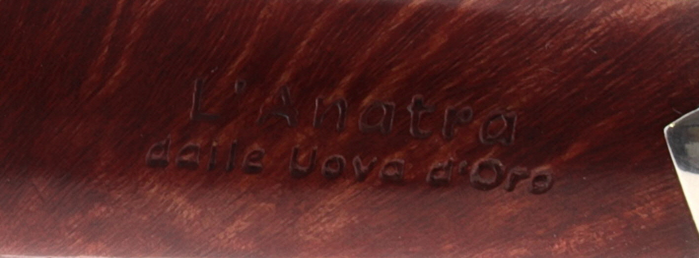 Pipa L'Anatra dalle Uova d'Oro 231 SABBIATA, finissaggio sabbiato marrone, shape straight chimney dublin con vera in argento, bocchino in metacrilato. Artigianale Made in Italy. Pezzo unico. In scatola originale con sacchetto di panno. Perfetta, nuova, mai fumata.