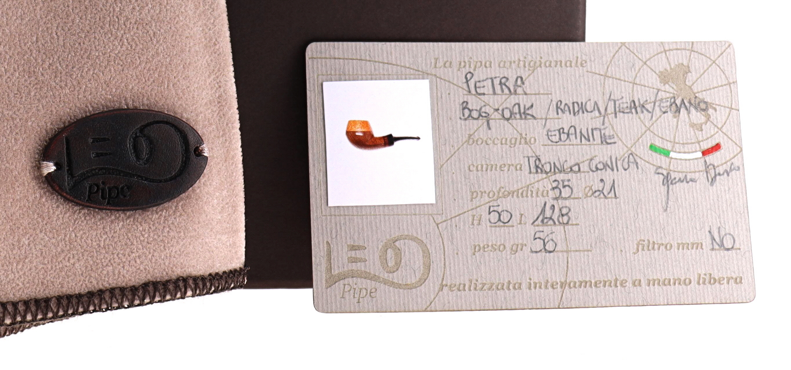 Pipa LEO 009 Petra, Morta Bog Oak, shape half bent bulldog vera in teak, bocchino in ebanite. Nuova, mai fumata. Realizzata a mano da Dario Sgreccia e la moglie Anna in Venegono (VA).