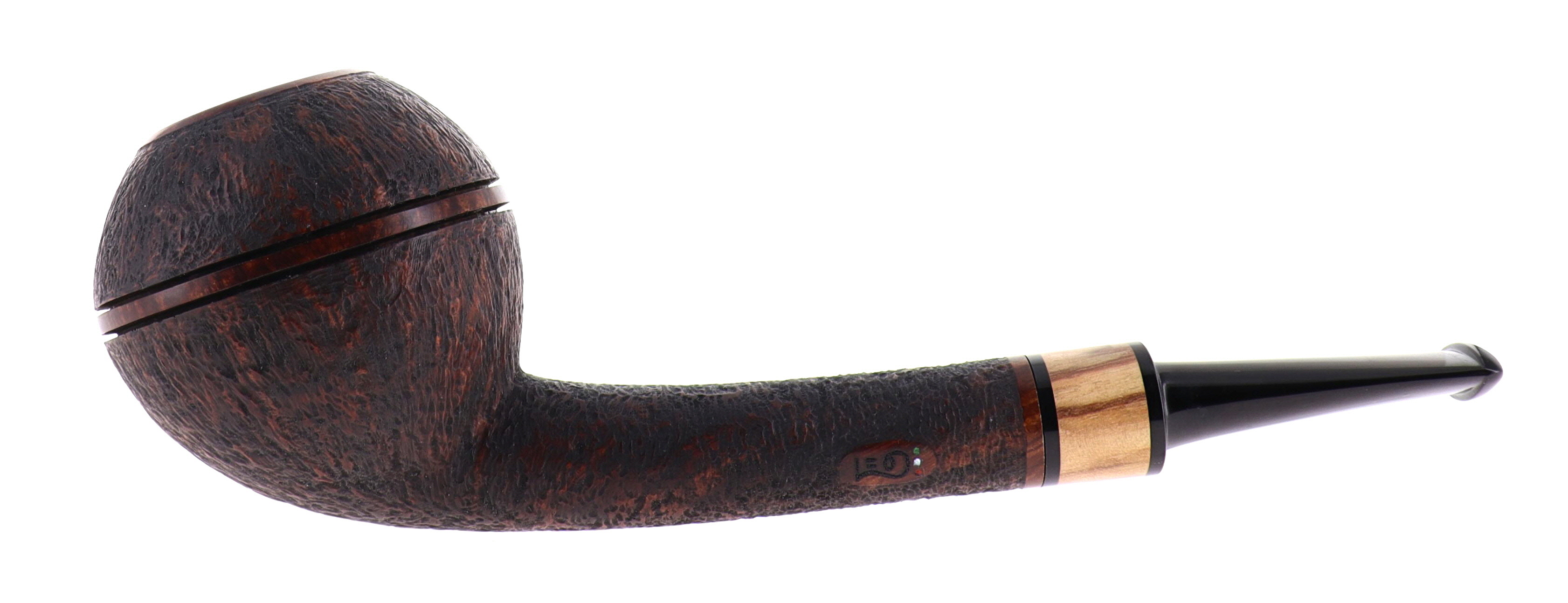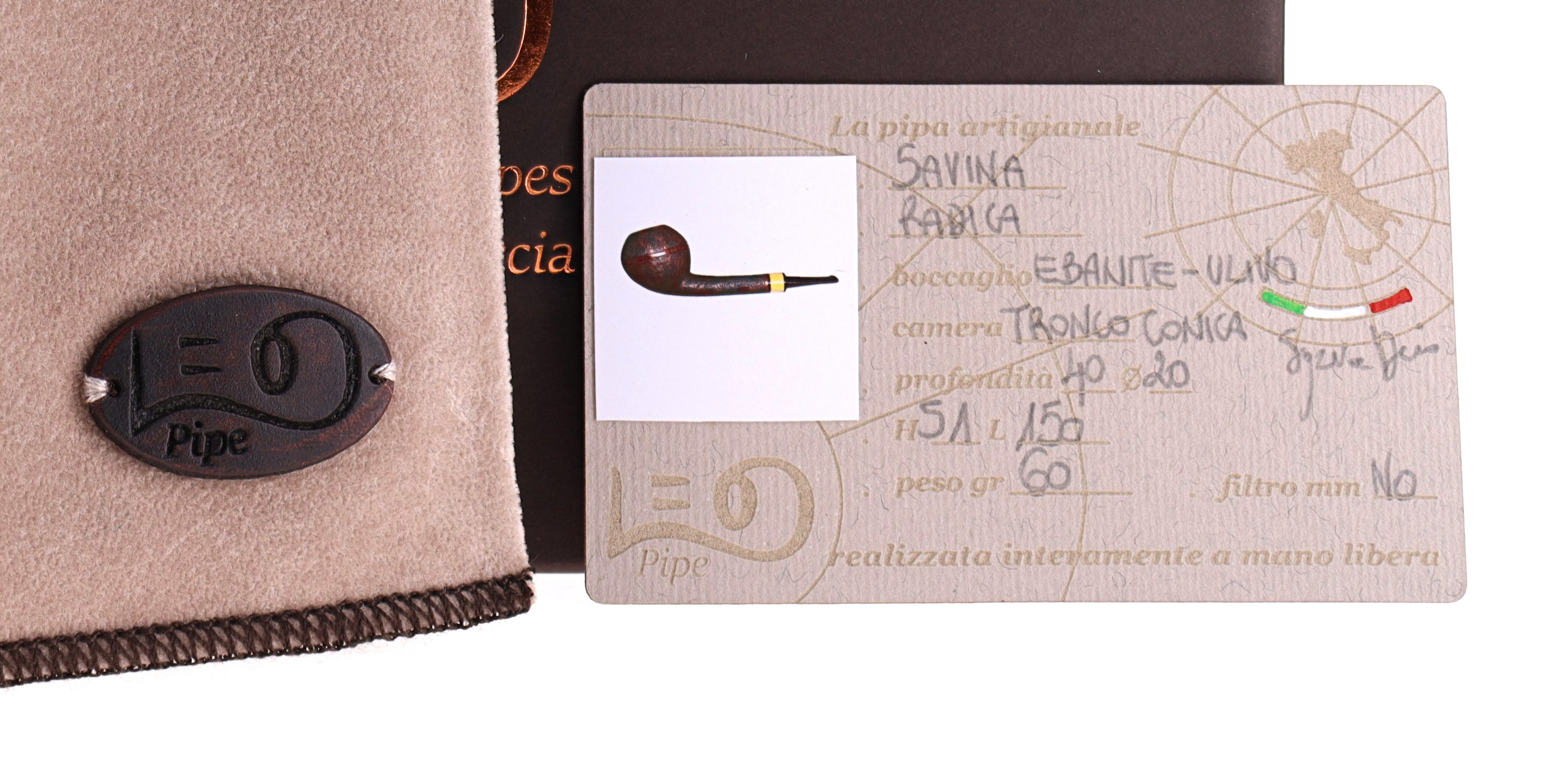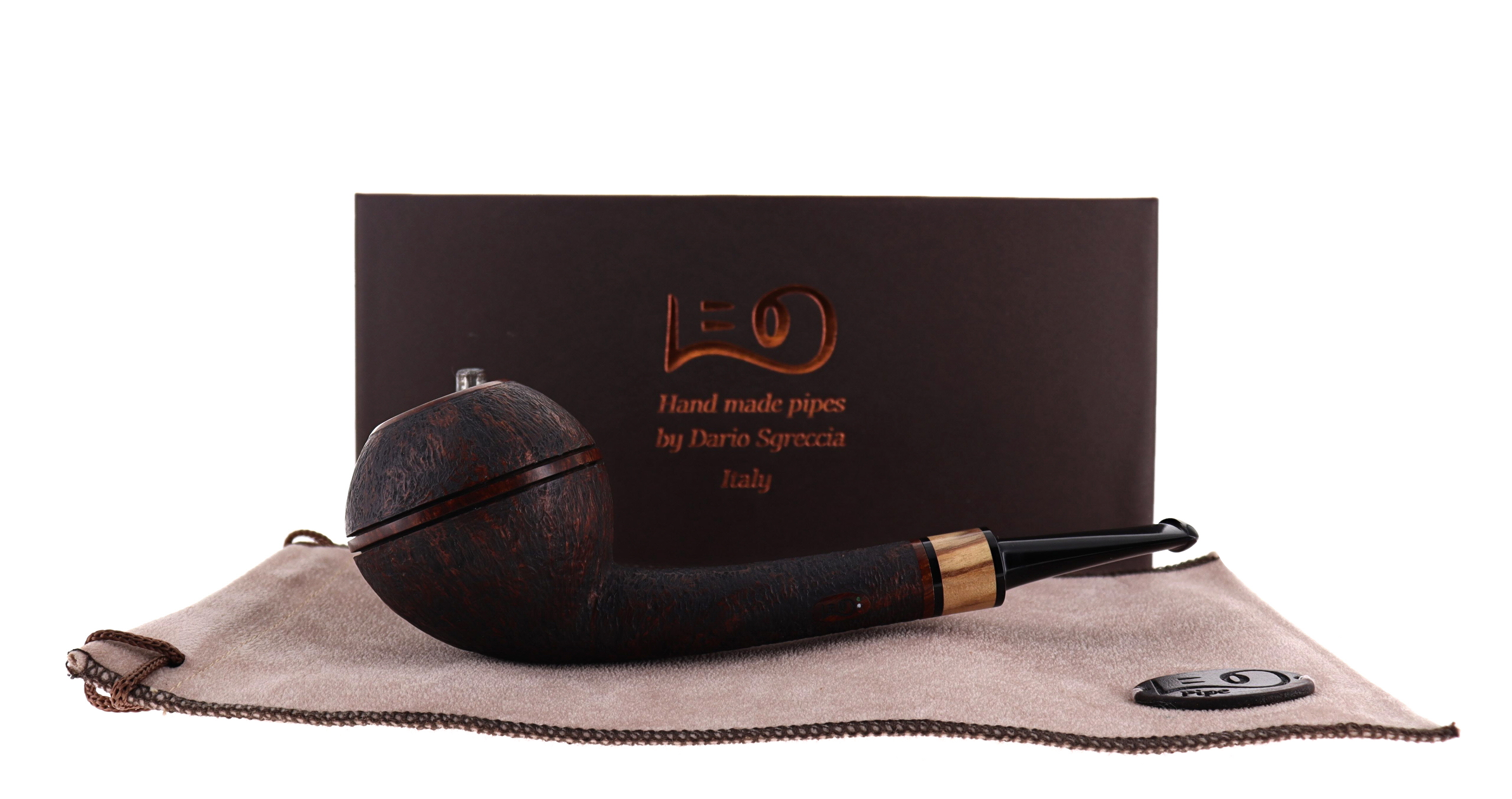 Pipa LEO 007 Savina, finissaggio sabbiato marrone, shape canted rhodesian, bocchino in ebanite con inserto in bosso. Nuova, mai fumata. Realizzata a mano da Dario Sgreccia e la moglie Anna in Venegono (VA).