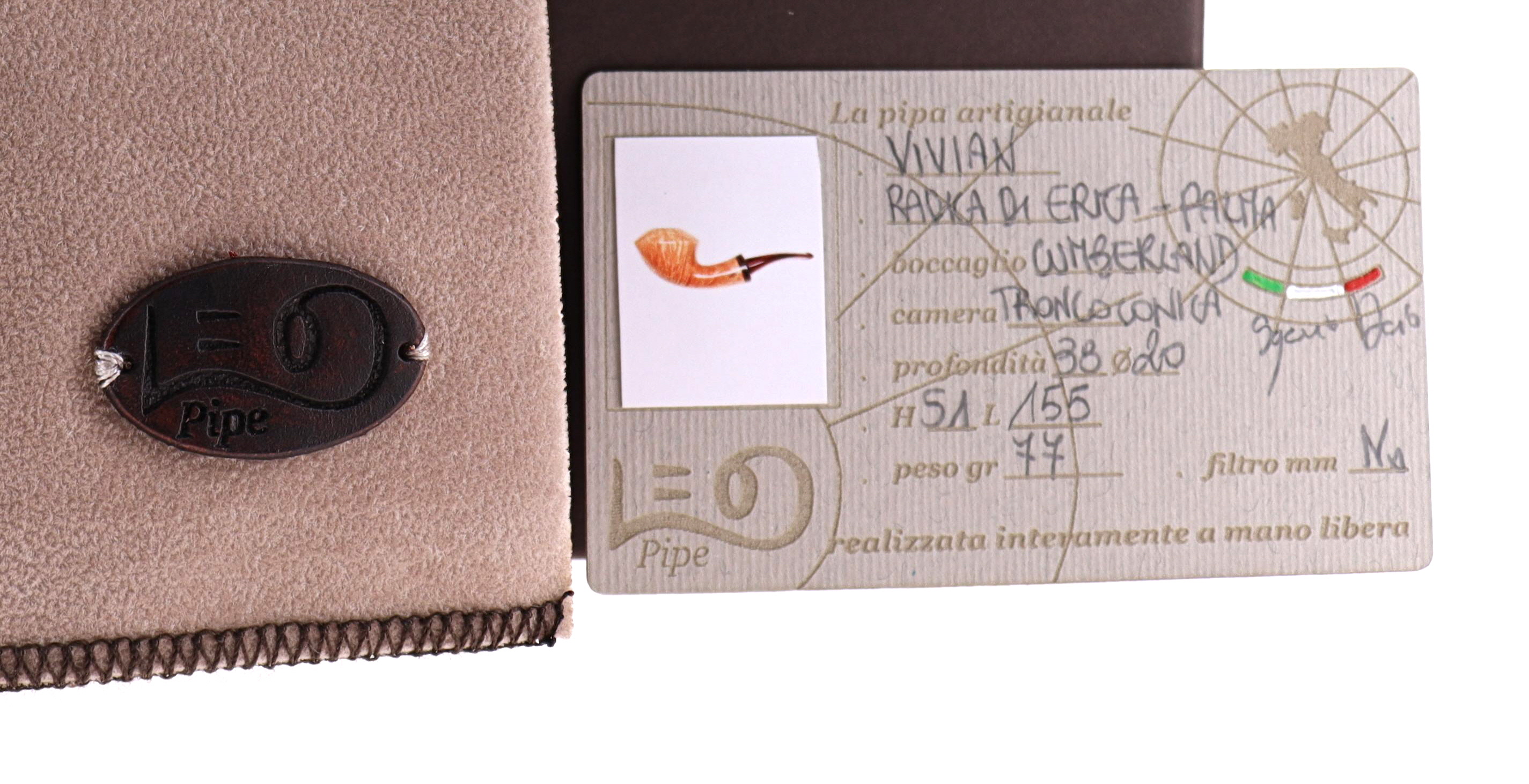 Pipa LEO 013 Vivian, finissaggio liscio chiaro, shape rhodesian semicurva vera in palma, bocchino in cumberland. Nuova, mai fumata. Realizzata a mano da Dario Sgreccia e la moglie Anna in Venegono (VA).