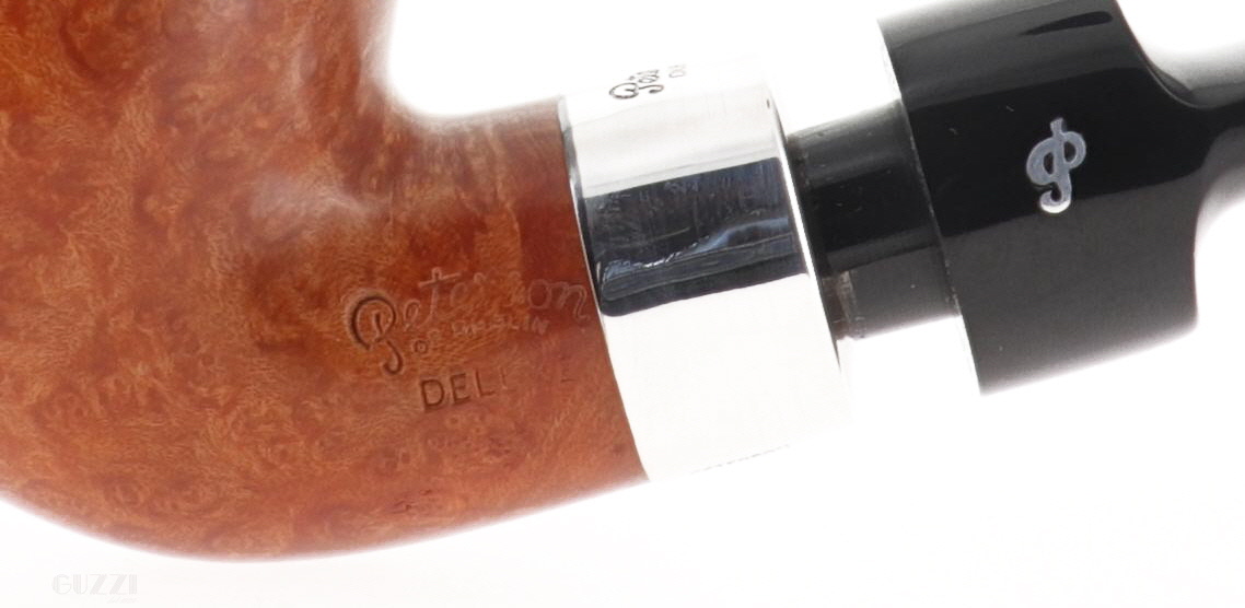 Pipa Peterson of Dublin DELUXE SYSTEM 2S, finissaggio liscio chiaro, shape full apple bent con vera in argento, bocchino in ebanite. Nuova, mai fumata. Con sacchetto e scatola originali.
