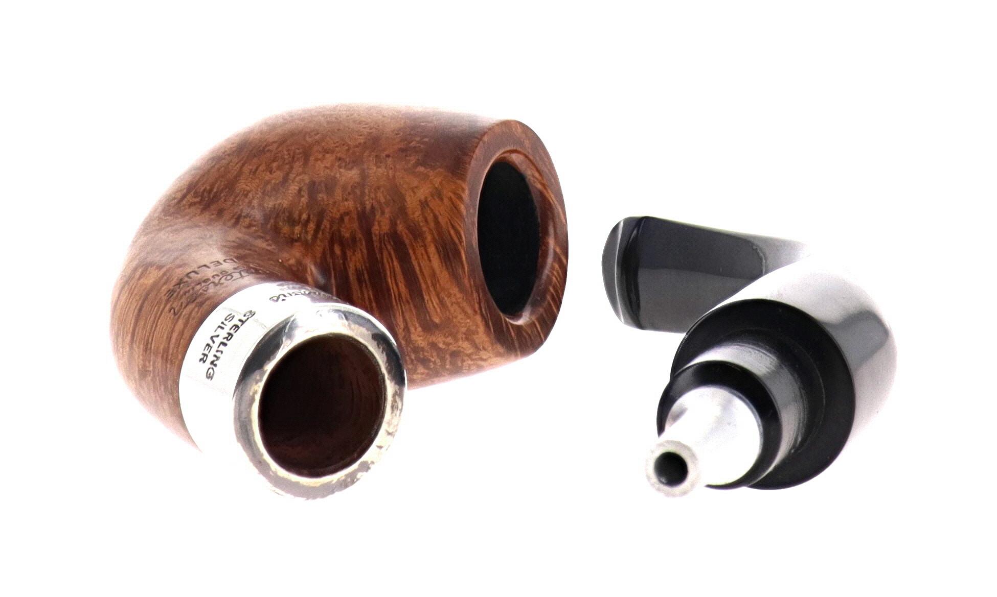 Pipa Peterson of Dublin OLD COLOUR DE LUXE SYSTEM 11S, finissaggio liscio marrone, shape bent billiard con vera in argento, bocchino in ebanite con palatale. Nuova, mai fumata.