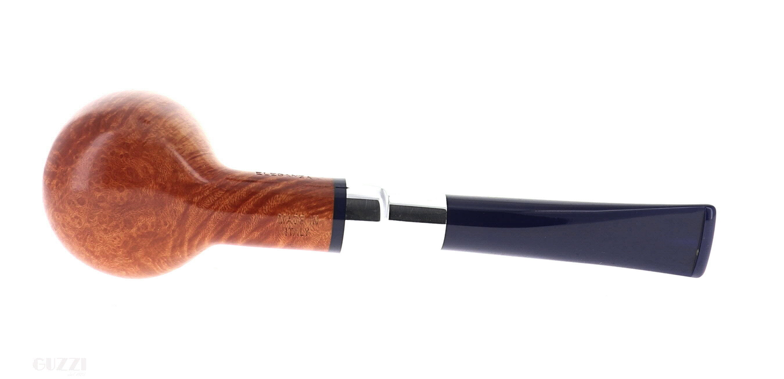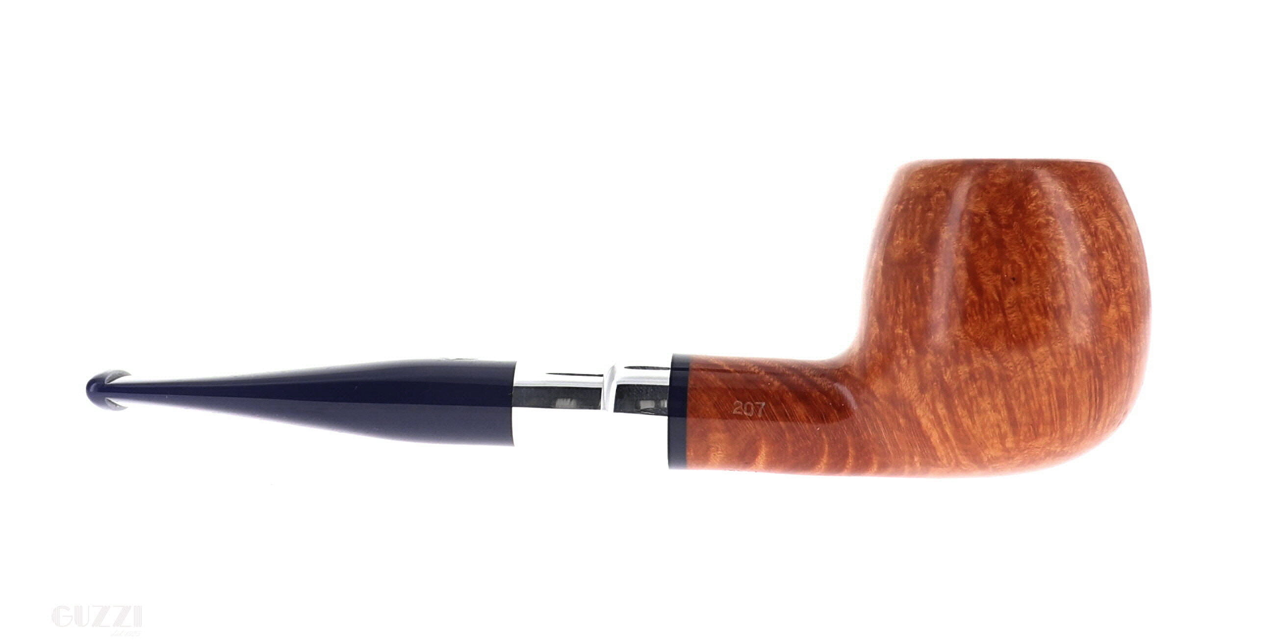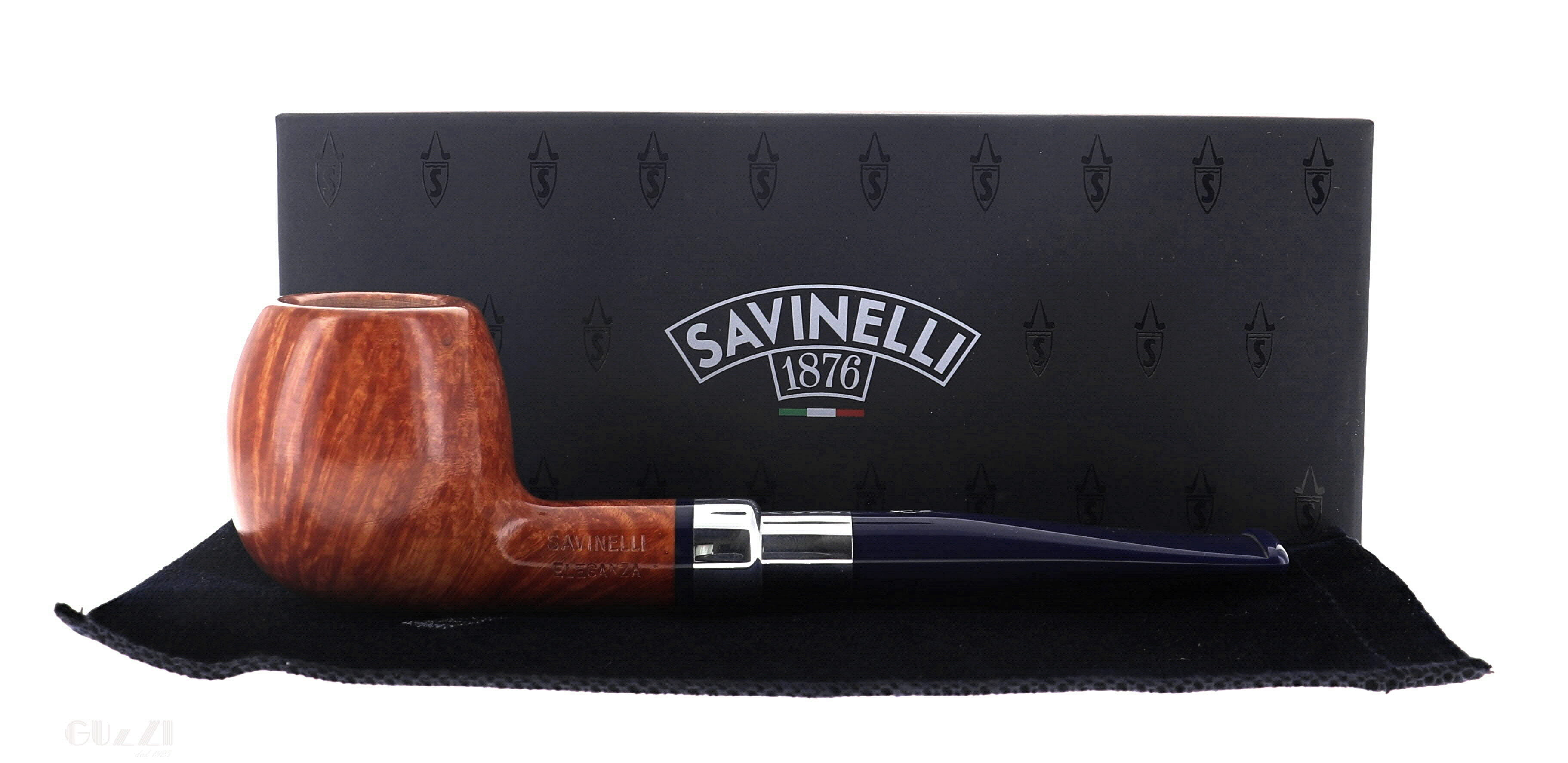 Pipa Savinelli Collezione Eleganza 207, finissaggio liscio naturale, shape apple, elegante spigot in nichel, bocchino in metacrilato blu foro 9mm. Nuova, mai fumata. In elegante confezione originale con sacchetto in panno blu.