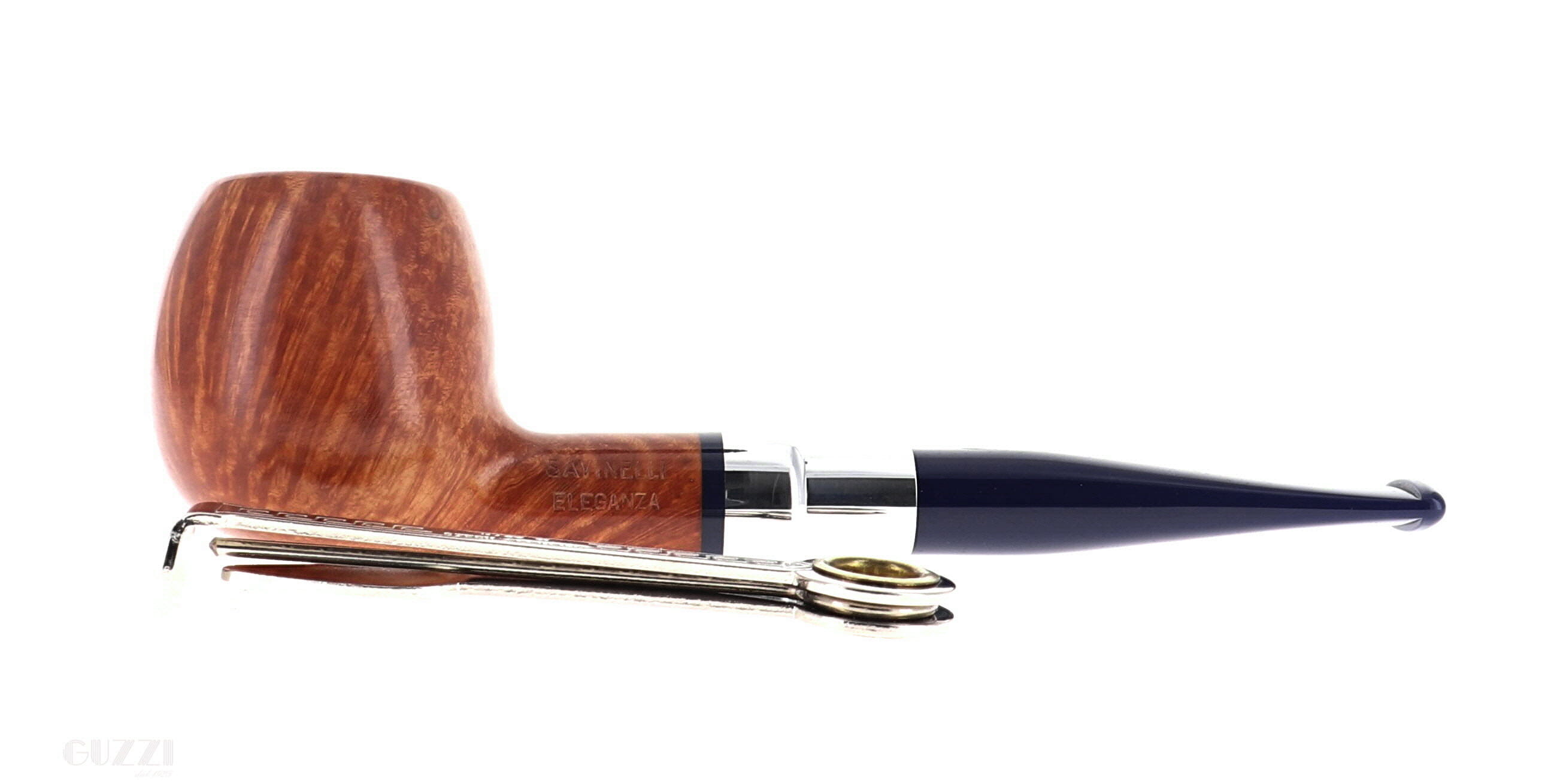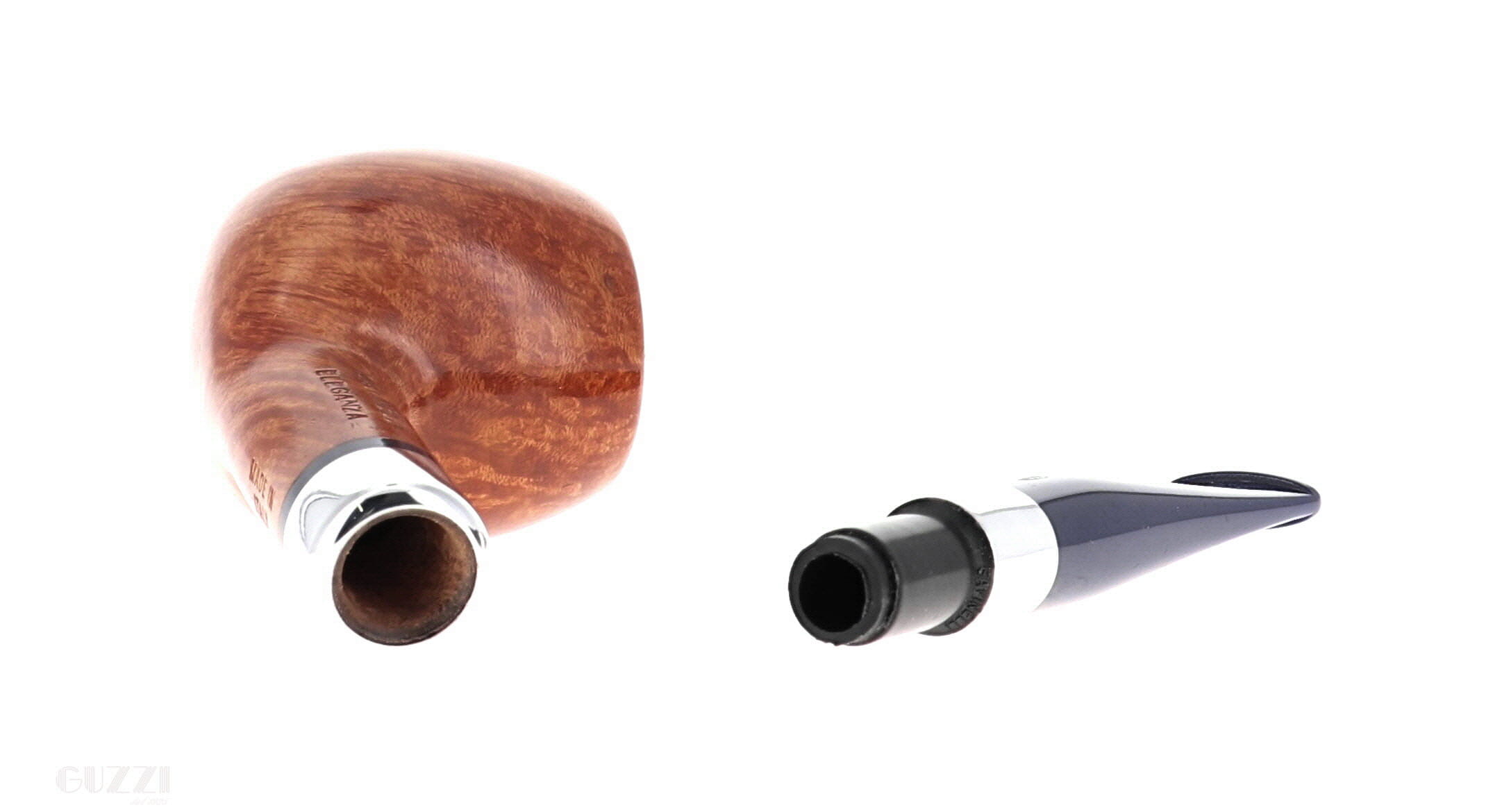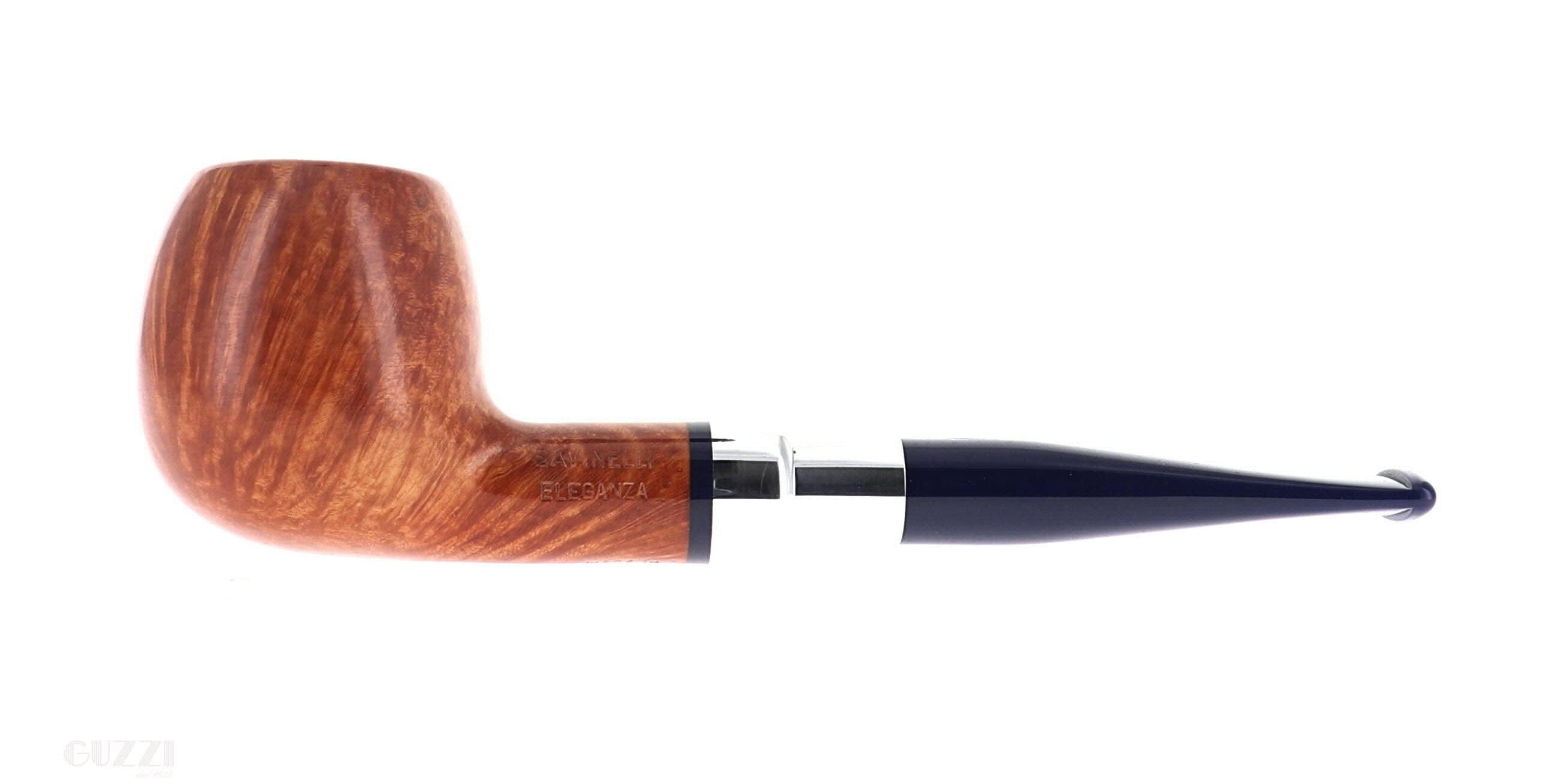 Pipa Savinelli Collezione Eleganza 207, finissaggio liscio naturale, shape apple, elegante spigot in nichel, bocchino in metacrilato blu foro 9mm. Nuova, mai fumata. In elegante confezione originale con sacchetto in panno blu.