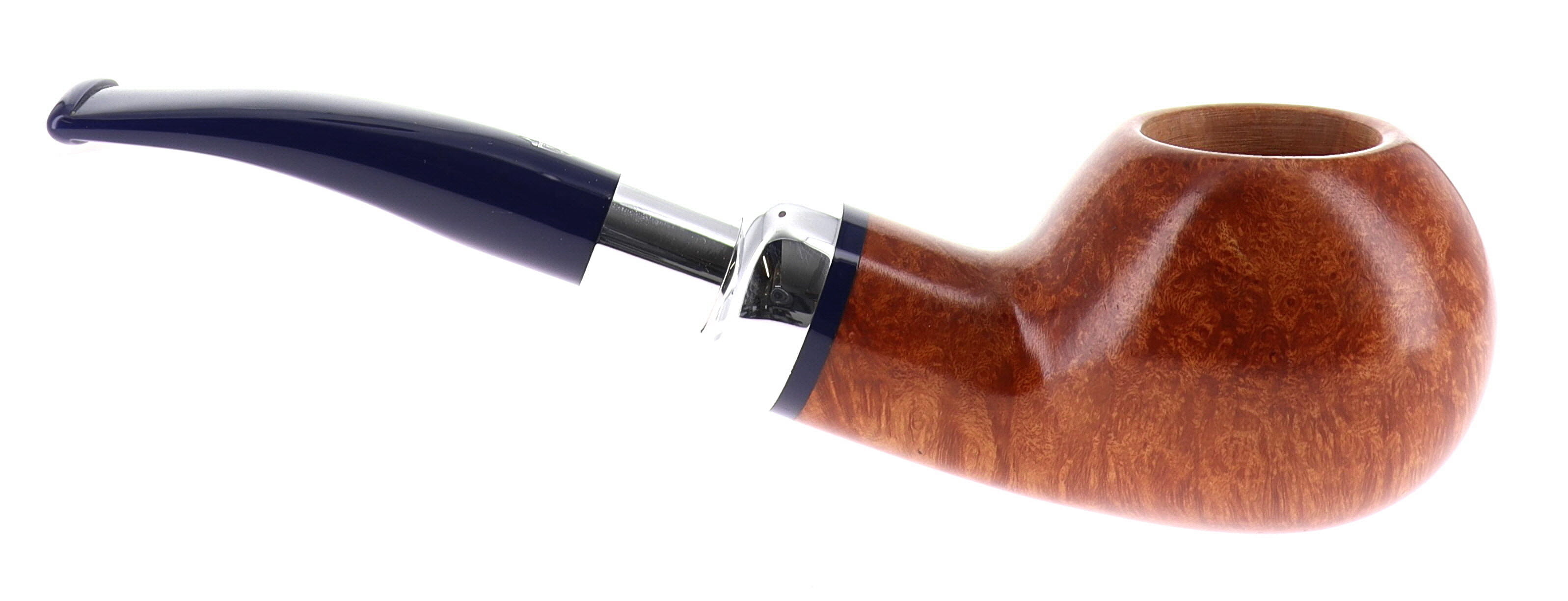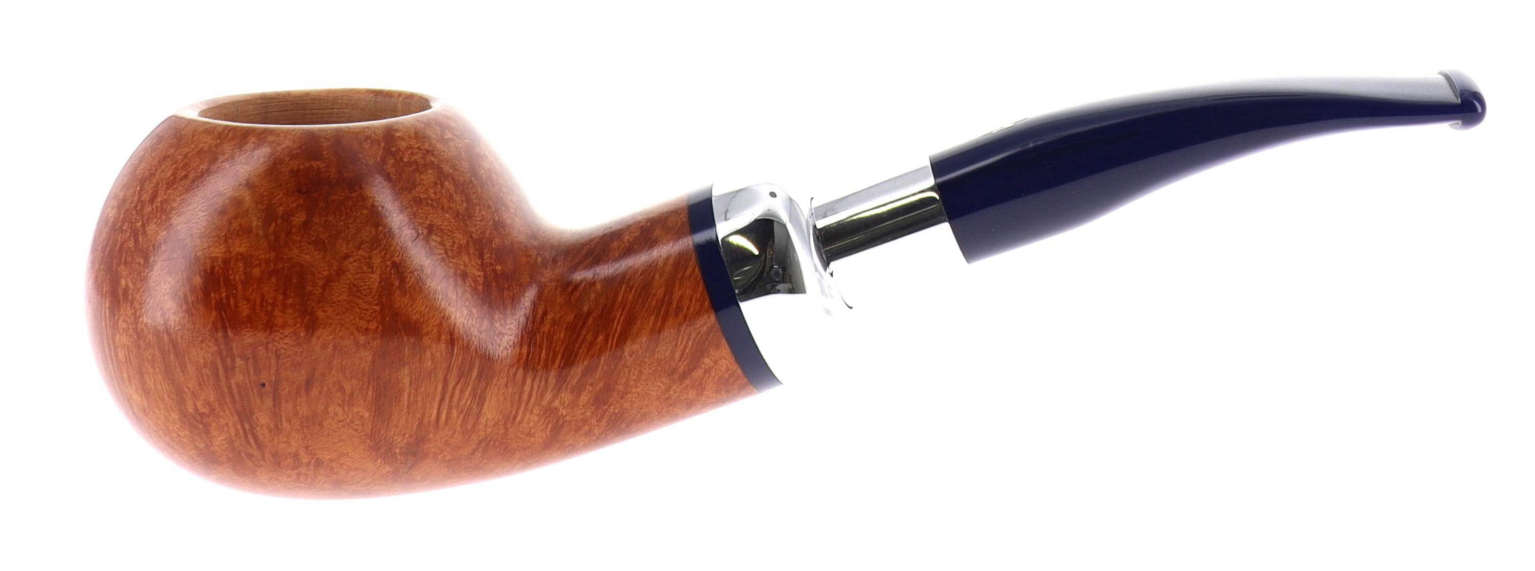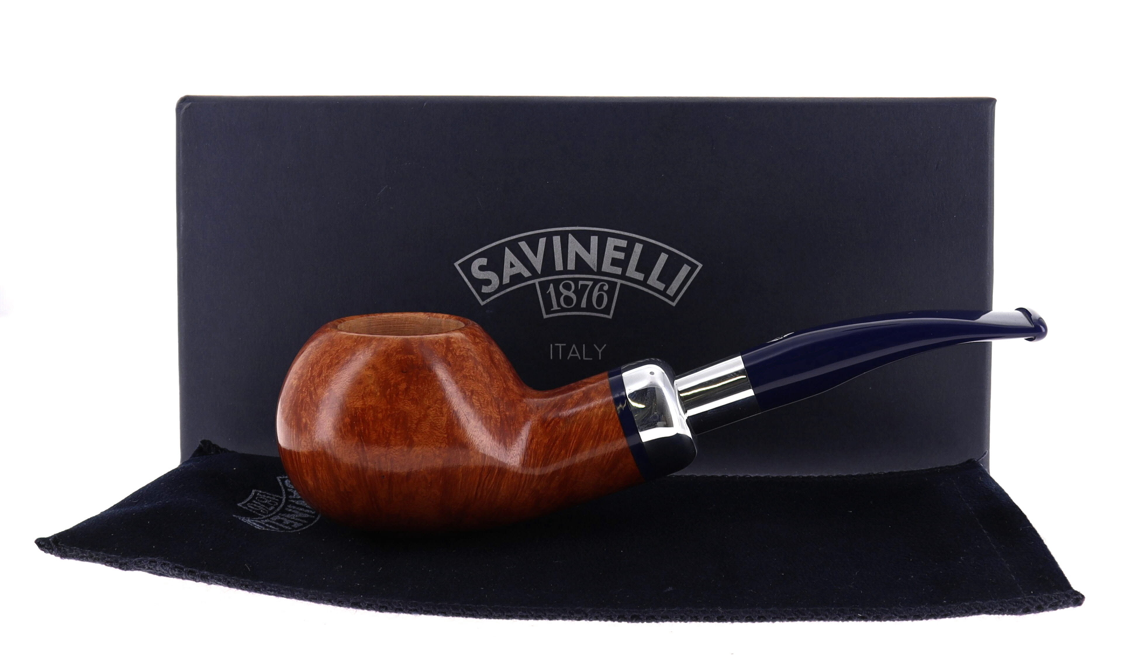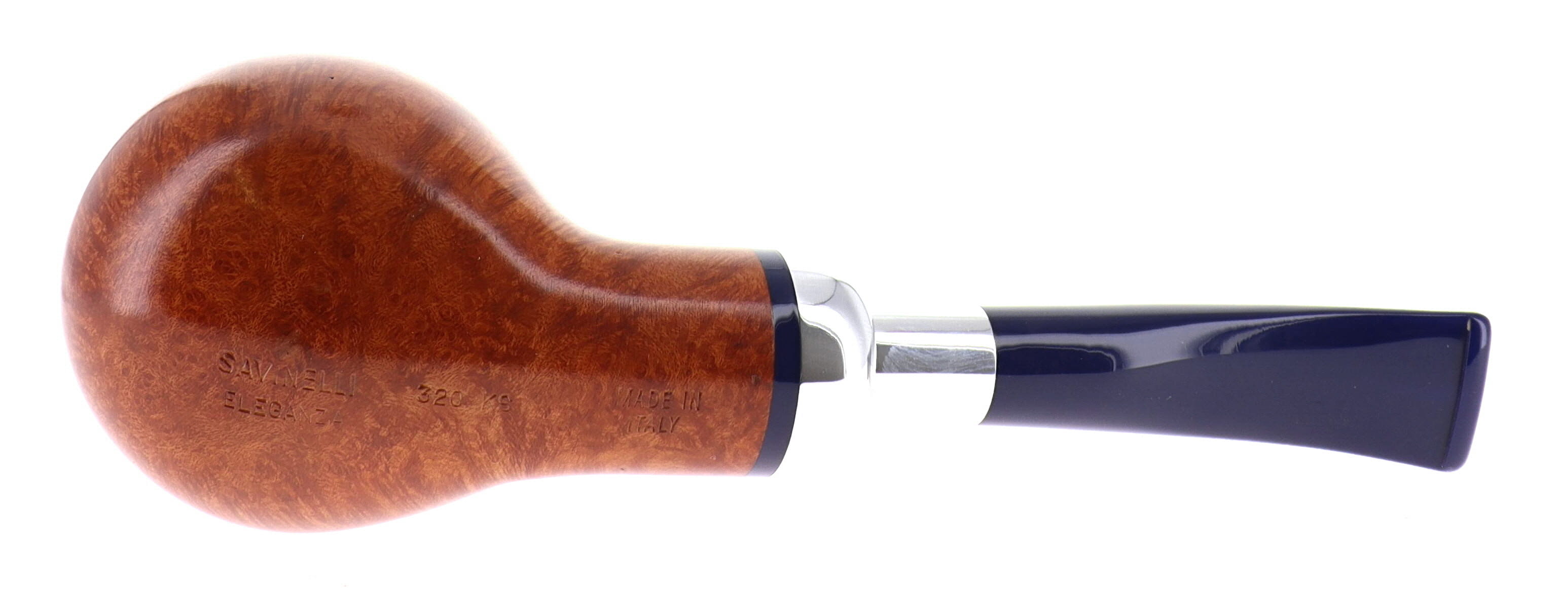 Pipa Savinelli Collezione Eleganza 320 KS, finissaggio liscio naturale, shape author, elegante spigot in nichel, bocchino in metacrilato blu foro 6mm. Nuova, mai fumata. In elegante confezione originale con sacchetto in panno blu.