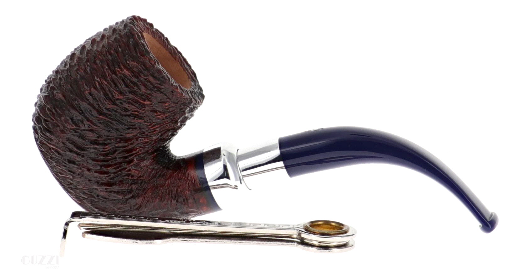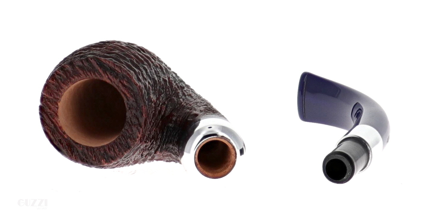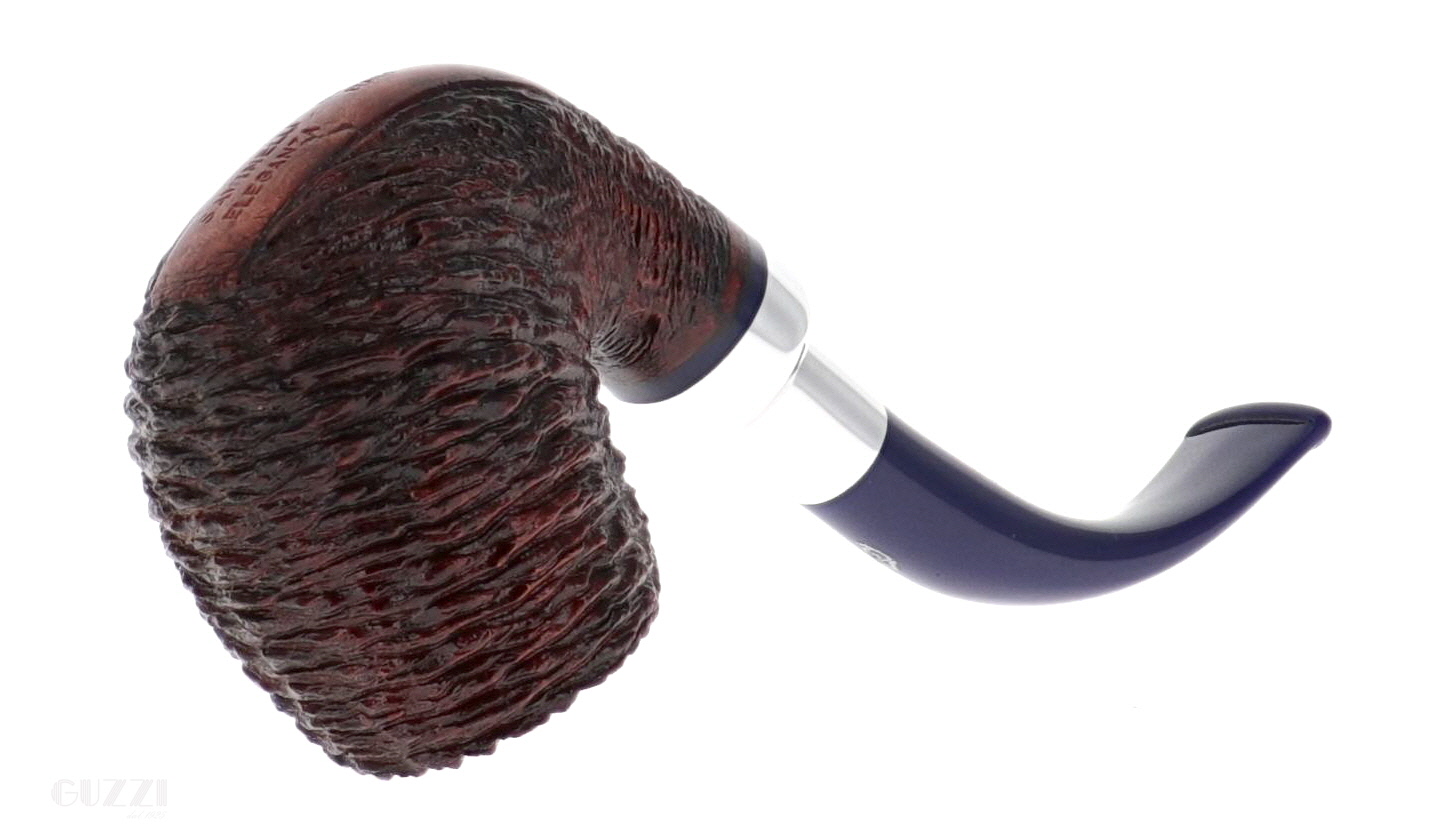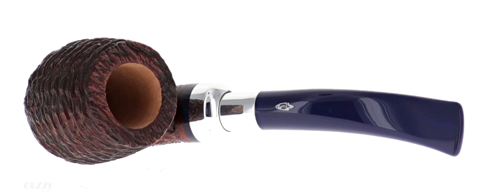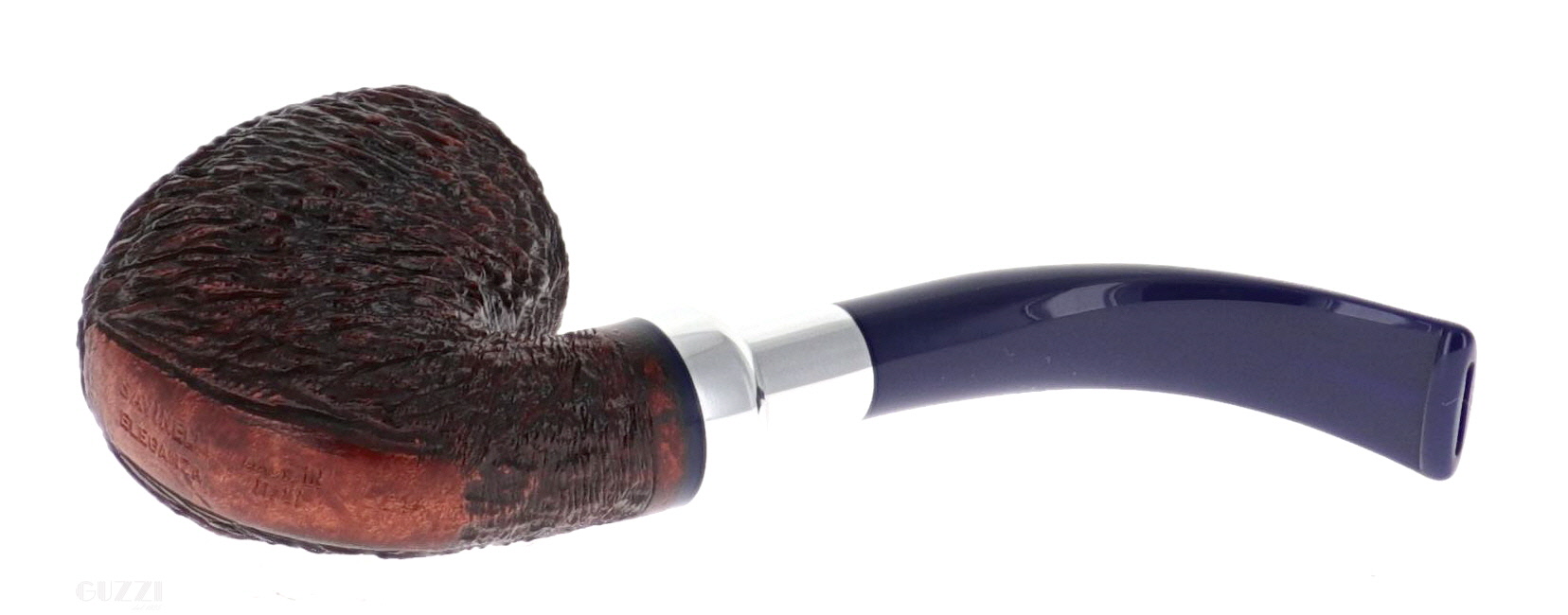 Pipa Savinelli Collezione Eleganza 614, finissaggio rusticato marrone scuro shape hungarian oom paul, elegante spigot in nichel, bocchino in metacrilato blu foro 6mm. Nuova, mai fumata. In elegante confezione originale con sacchetto in panno blu.