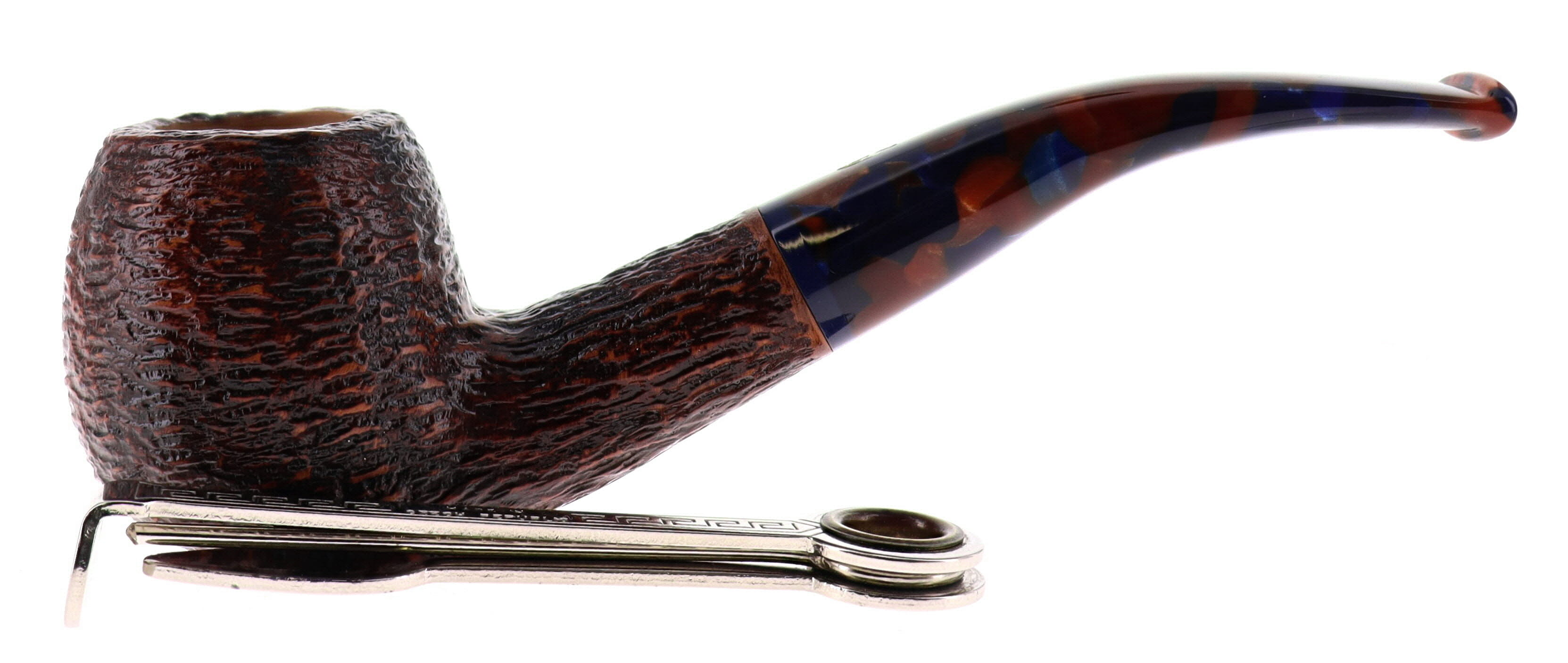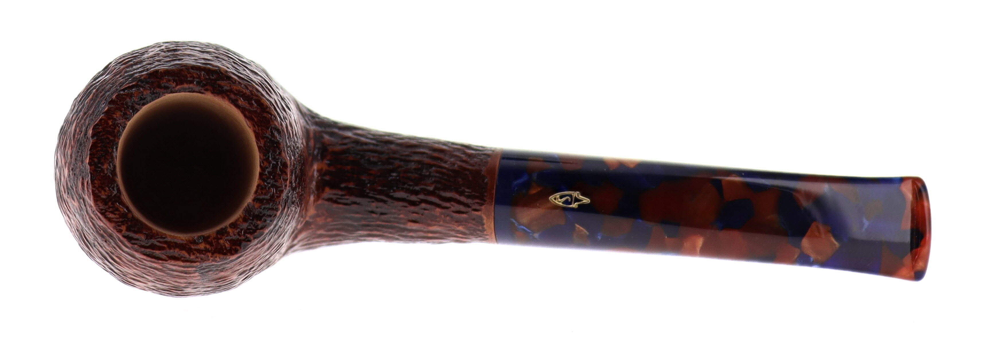 Pipa Savinelli Collezione FANTASIA. Realizzata in finitura rusticata marrone e liscia chiara, la serie Fantasia presenta un bocchino craquel� di colore rosso e blu.