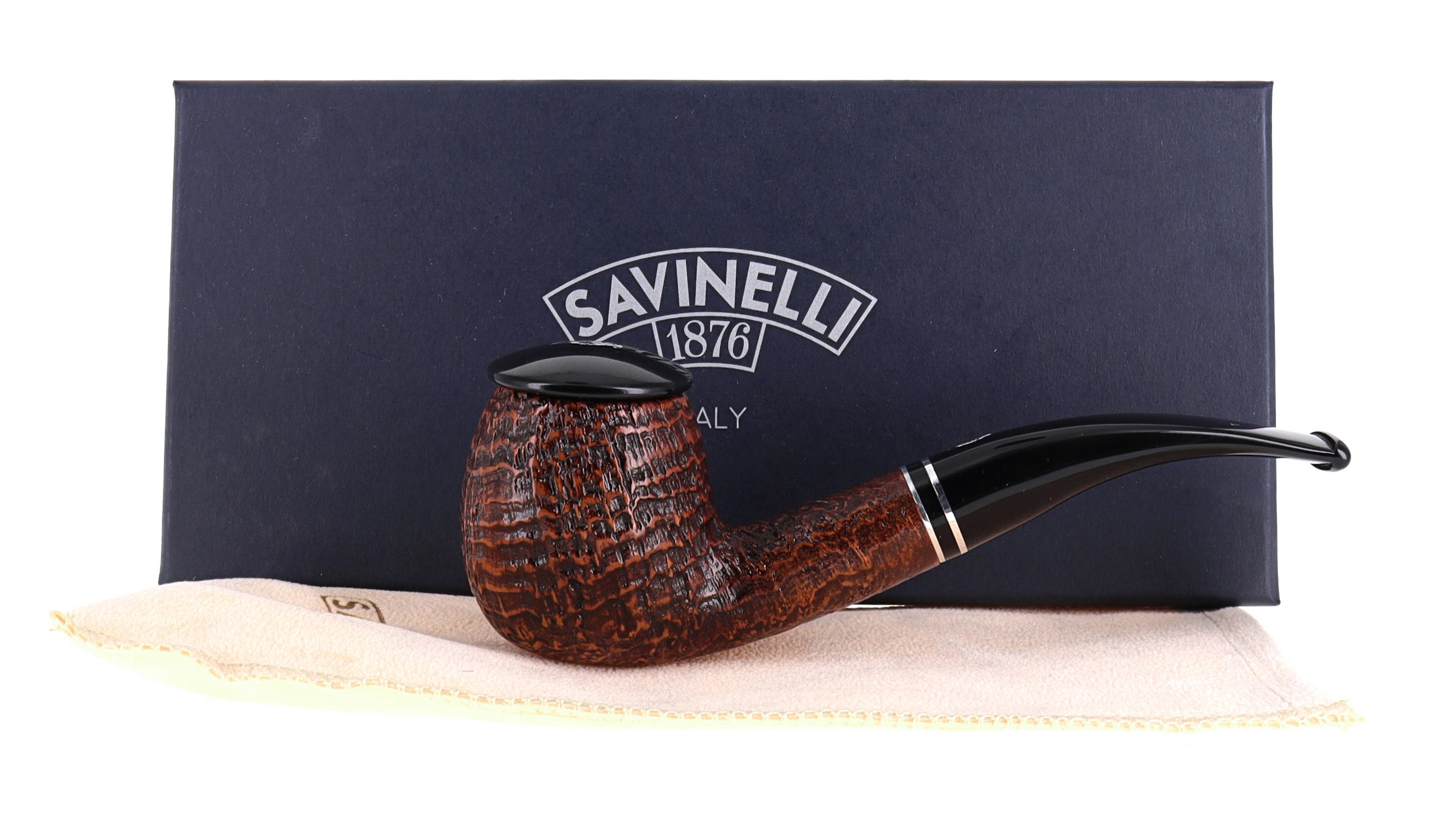 Una pipa sabbiata è un must per ogni appassionato di lento fumo. Savinelli riserva a questa lavorazione solo radica selezionata per esaltare le venature: la sabbiatura, eseguita ad alta pressione, rimuove le parti più morbide del legno mettendo in rilievo quelle più resistenti.
