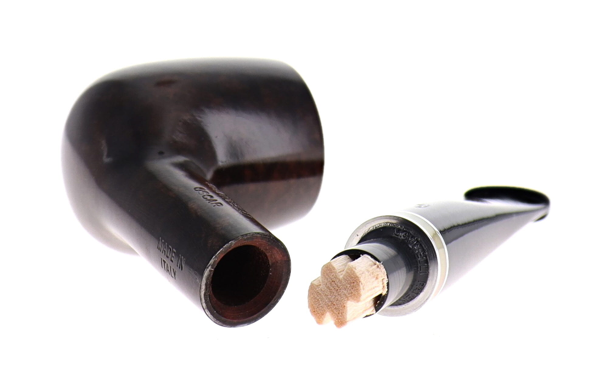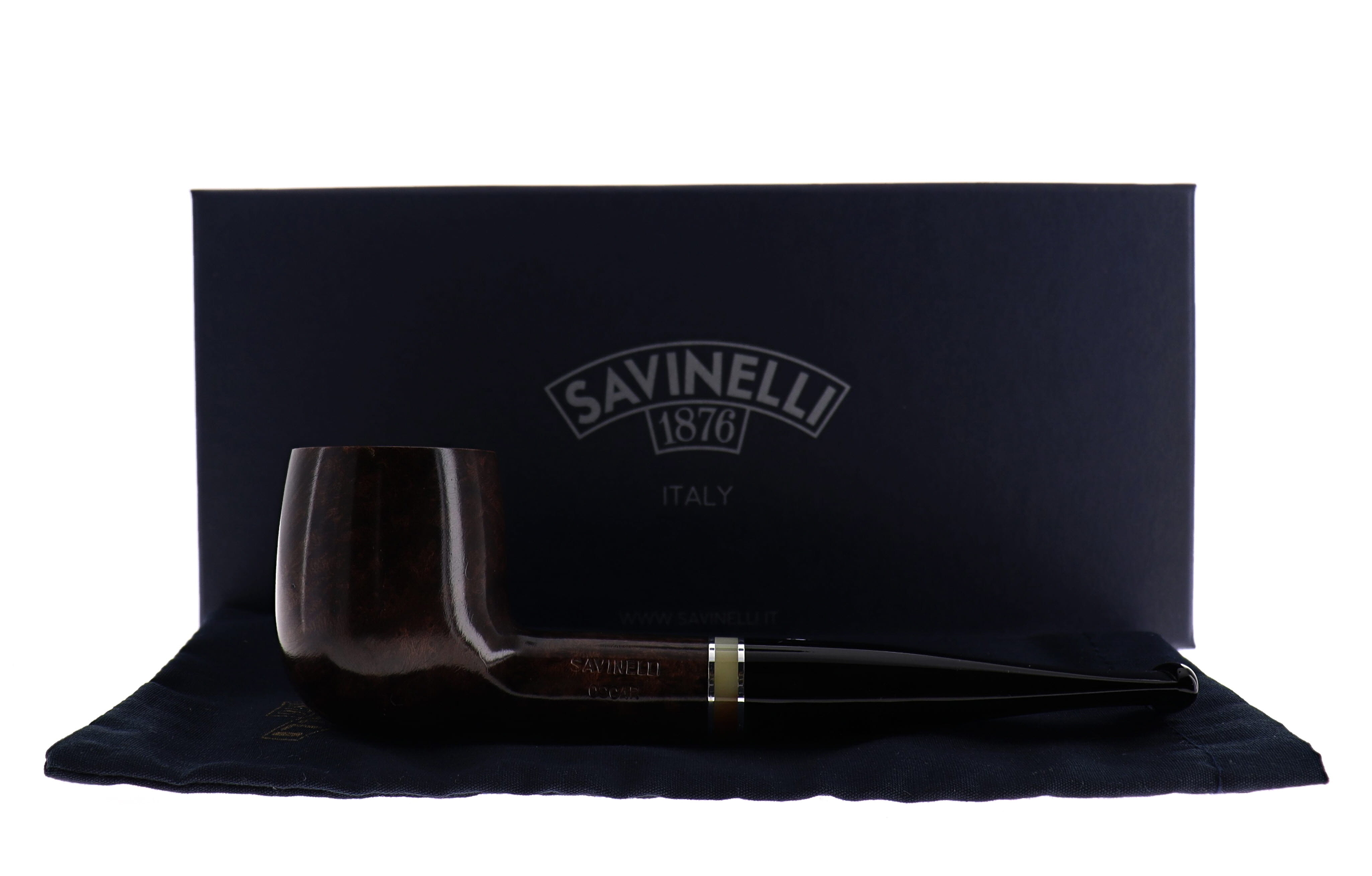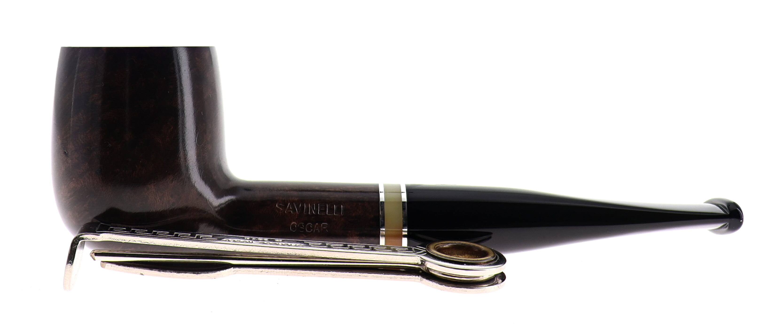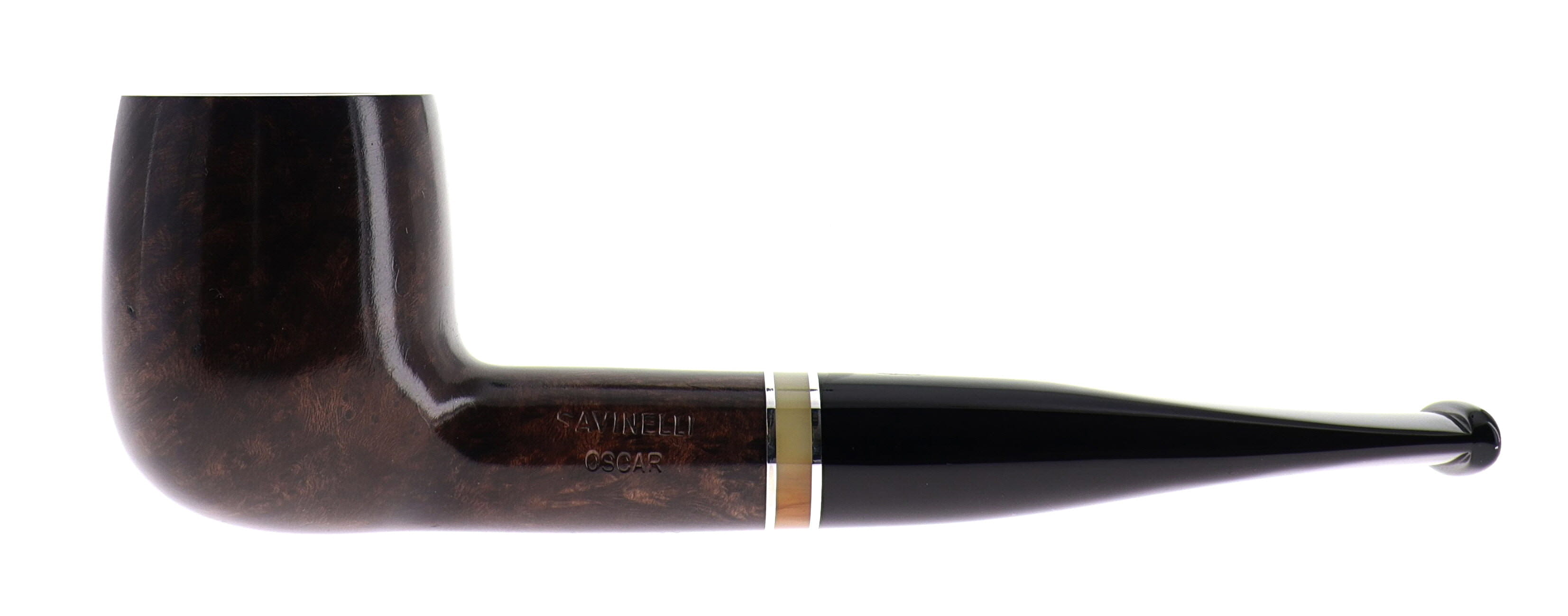 La Oscar è una serie storica Savinelli, proposta nelle finiture liscio marrone e rusticato, impreziosita da una veretta beige e da un classico bocchino nero in metacrilato.
