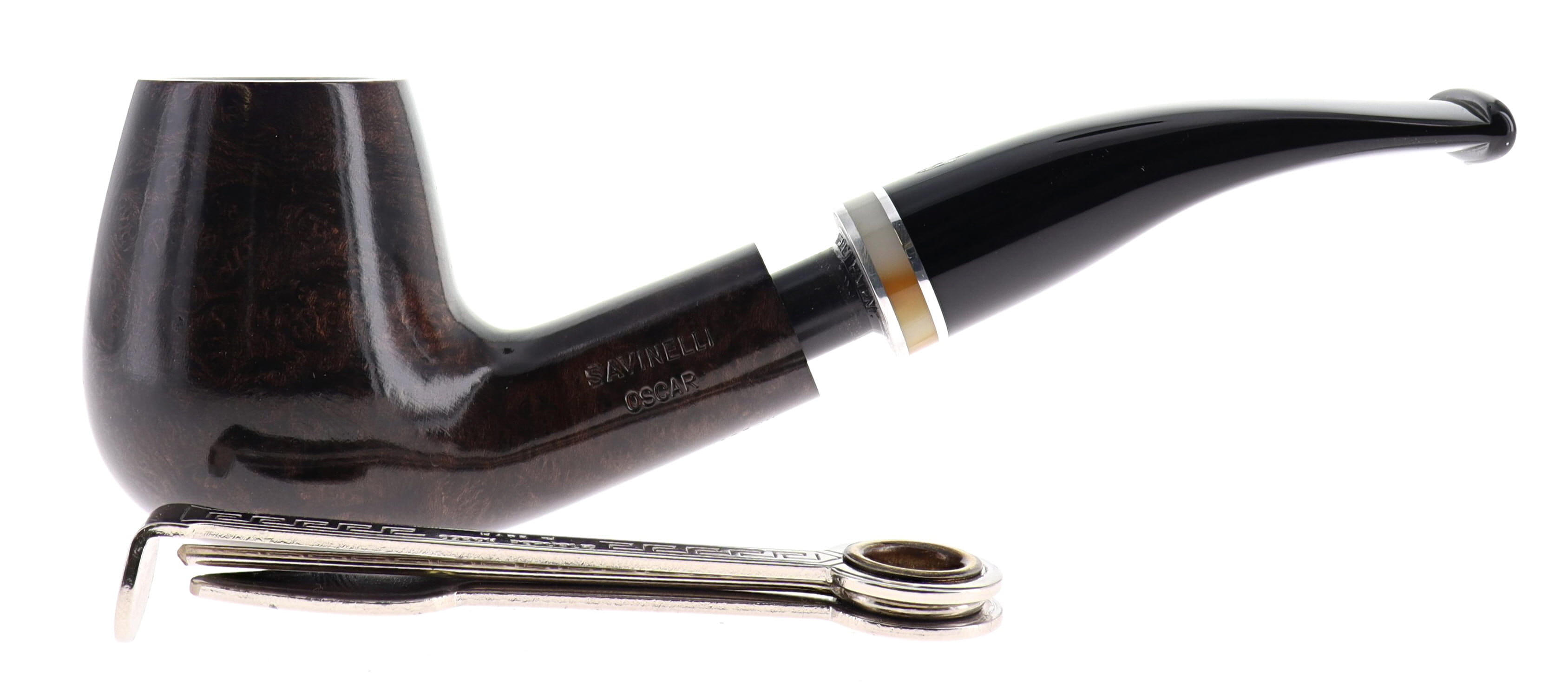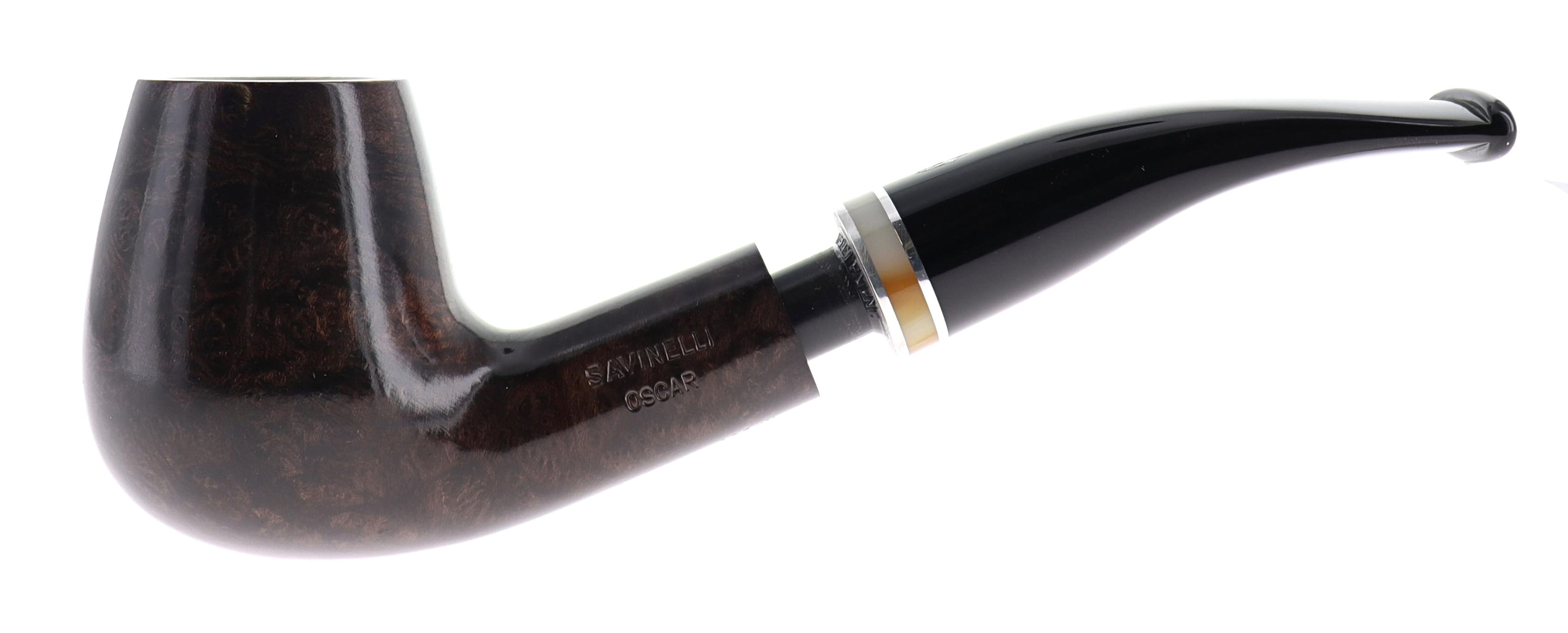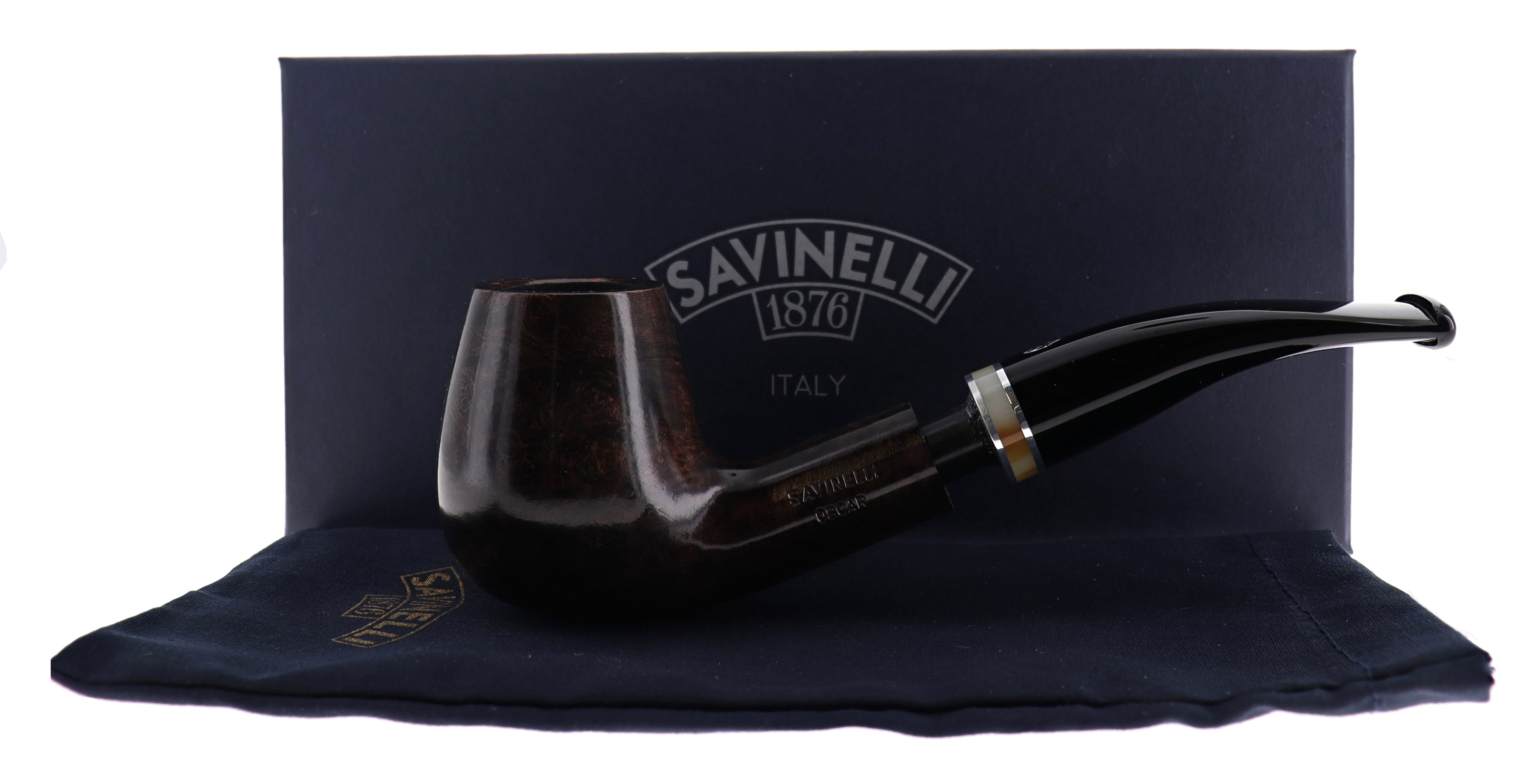 Pipa Savinelli OSCAR, finissaggio liscio marrone, shape 628 bent semicurved, bocchino in metacrilato foro 6mm con veretta beige. Nuova, mai fumata. In confezione originale.