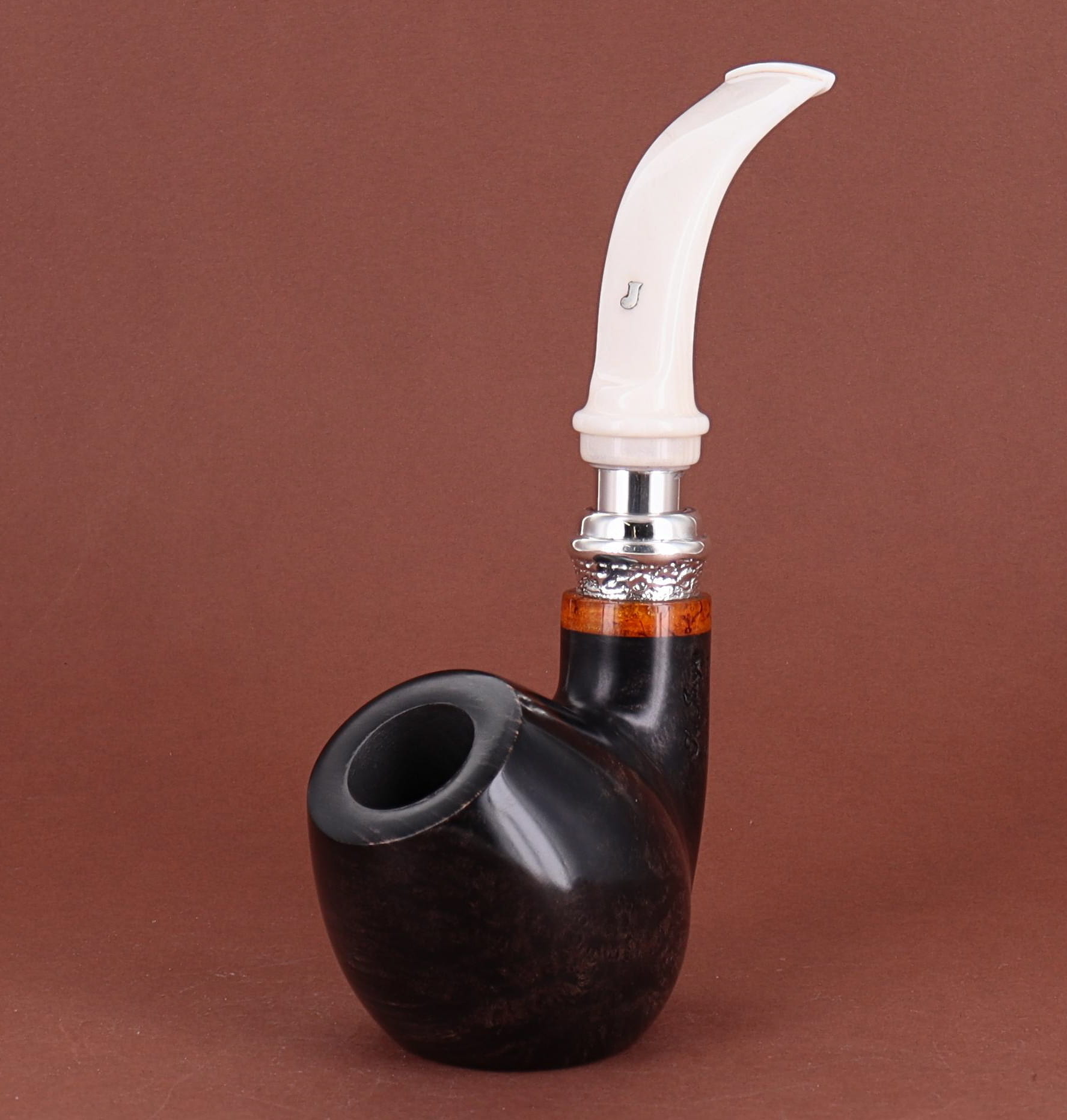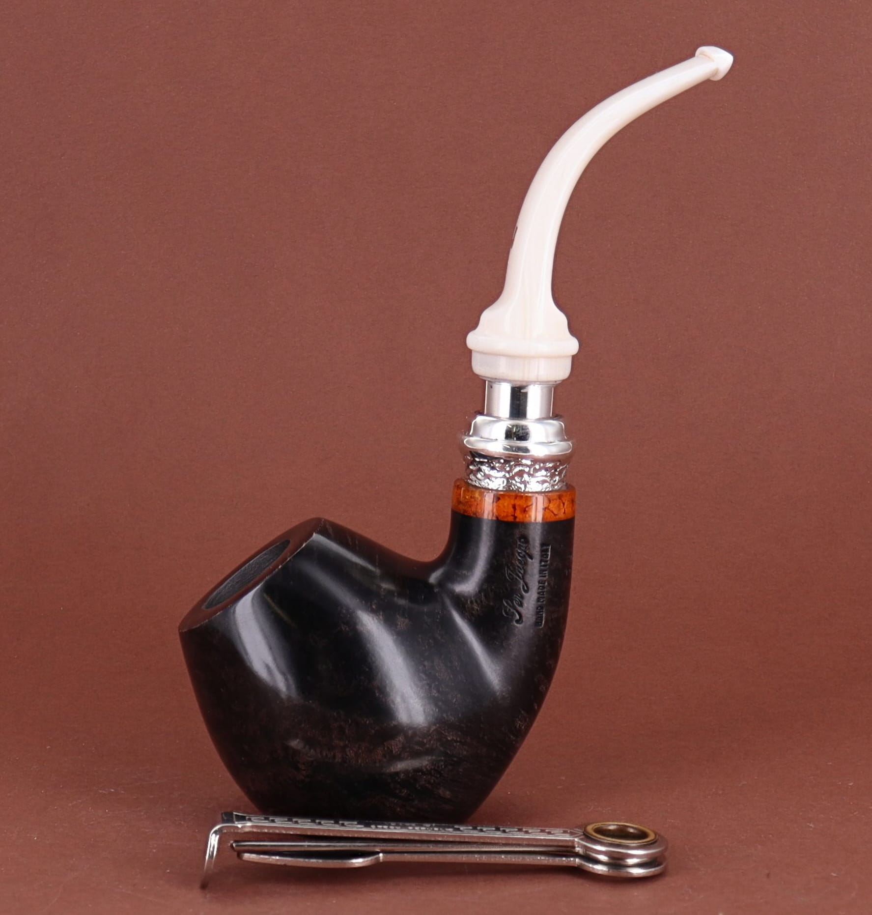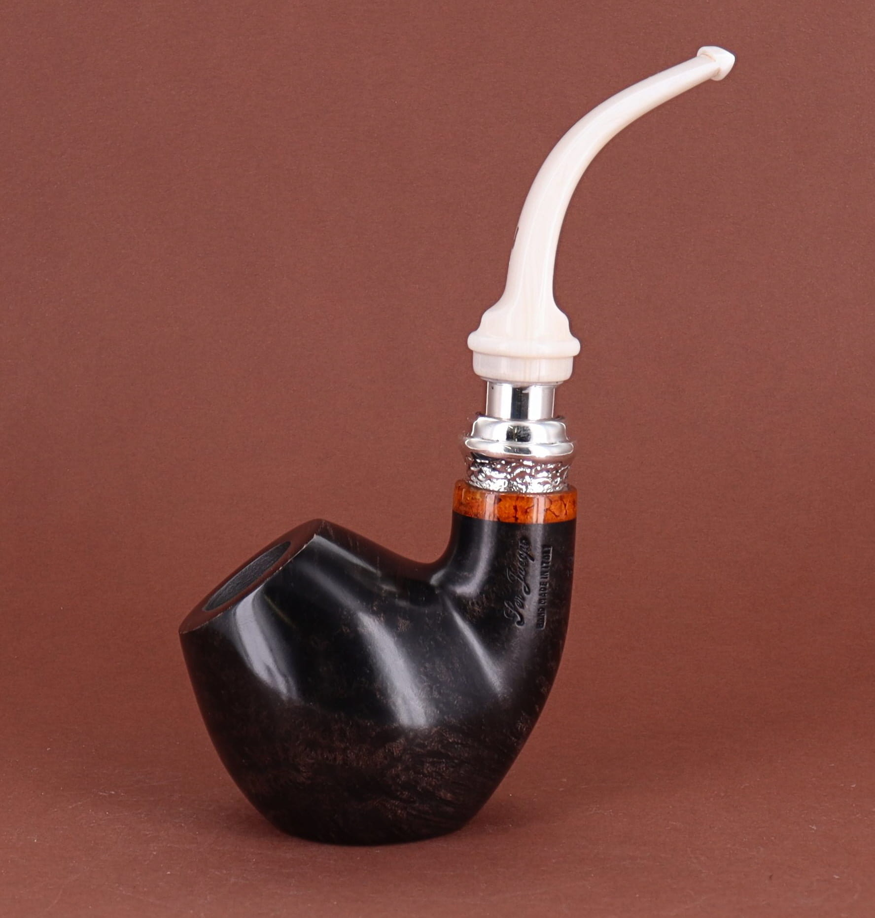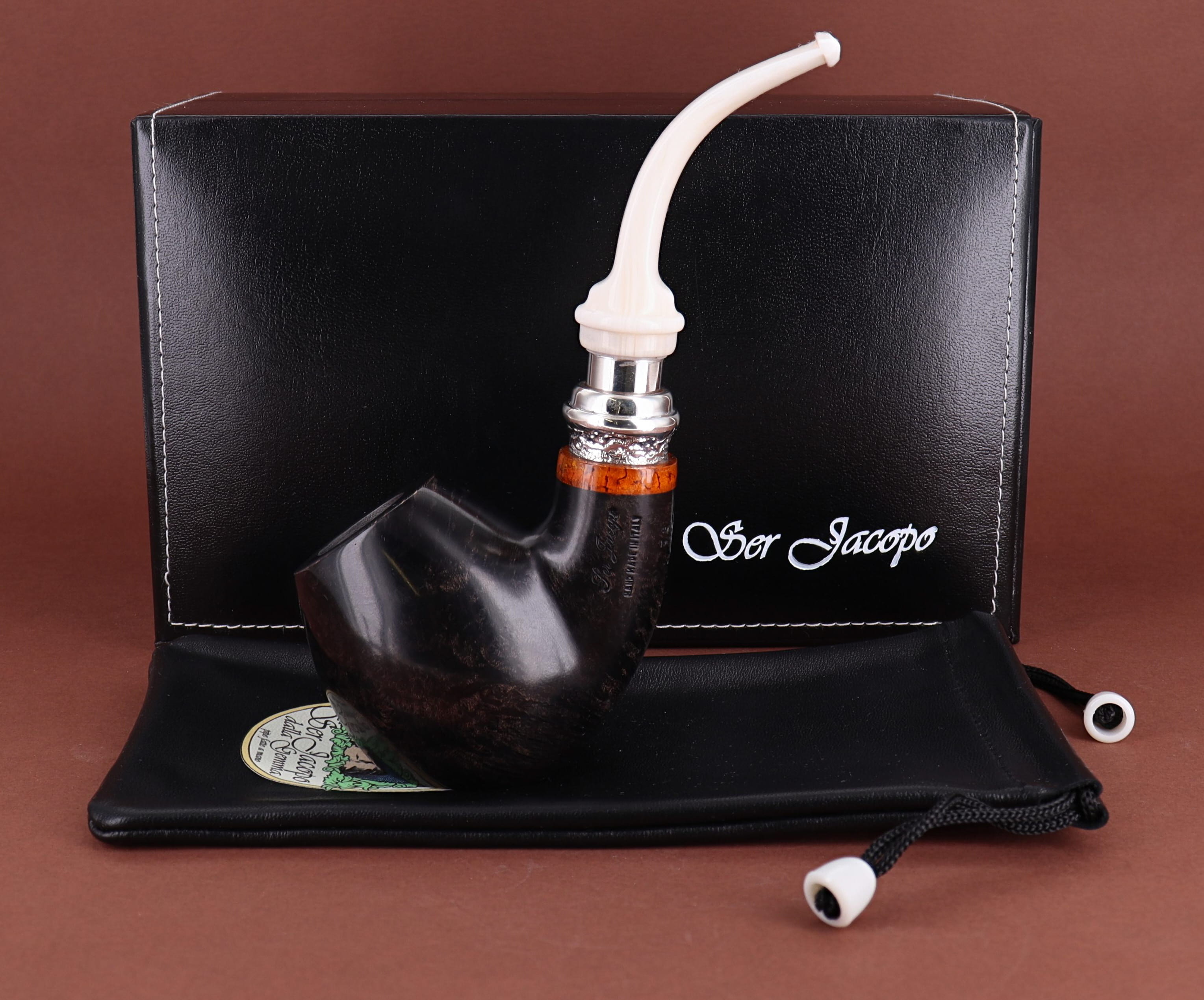 Pipa Ser Jacopo della Gemma 548 HISTORICA 2020 82 L1 PULCHRA, finissaggio liscio marrone, shape stand up author con vera in argento, bocchino in metacrilato con vera in argento. Con scatola e sacchetto originale in panno. Perfetta, nuova, mai fumata. Made in Pesaro, Italy.
